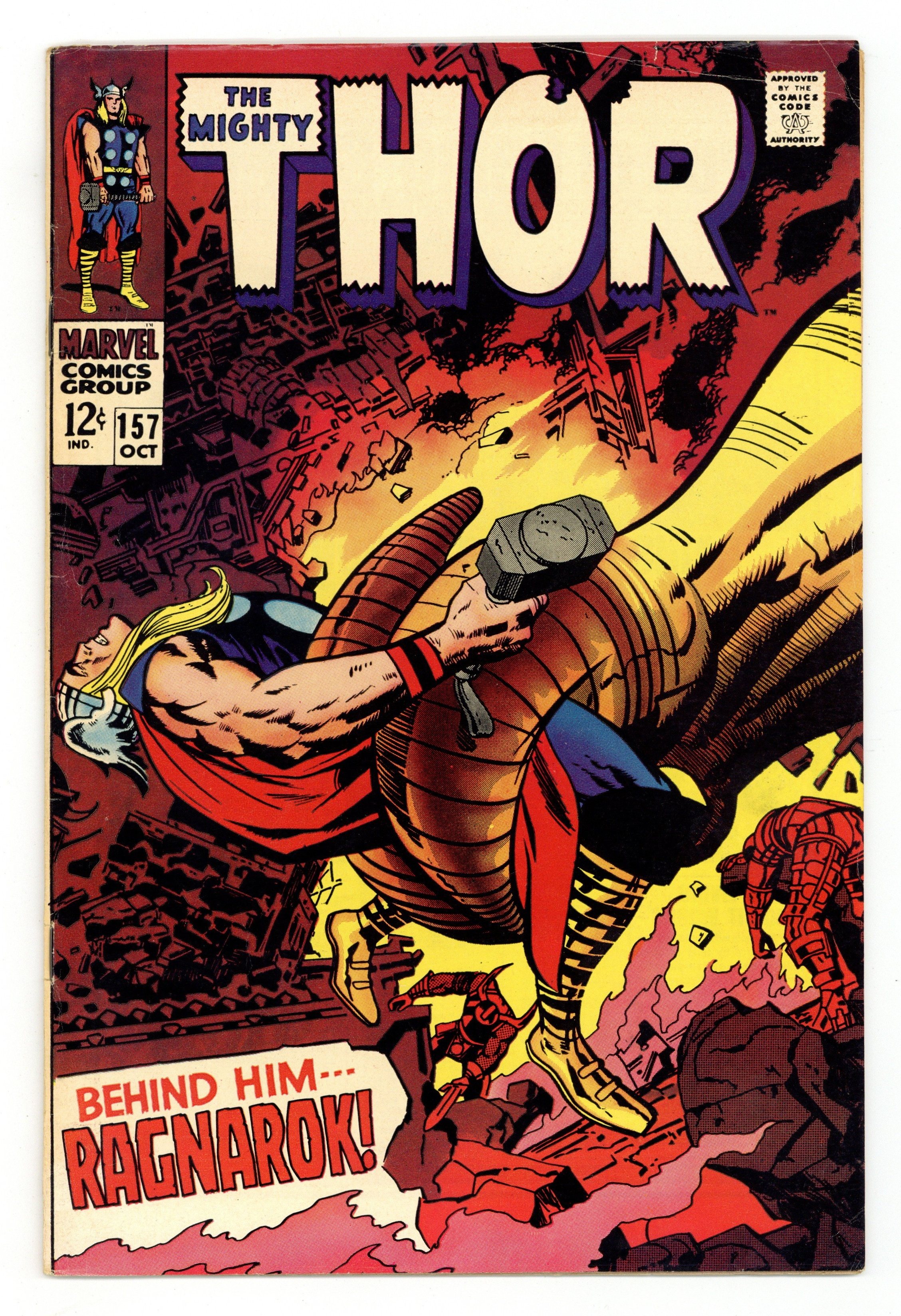 Tags: Marvel Legacy Numbering: Thor (part 157), Thor$16.00Cover pencils by Jack Kirby, inks by Vince Colletta. "Behind Him...Ragnarok!", script by Stan Lee, pencils by Jack Kirby, inks by Vince Colletta; Balder and the Legion of the Lost escape Karnilla and join the battle against Mangog; Odin awakens in time to stop Mangog from drawing the Odinsword. Appearances by Sif, Karnilla, Hogun, Fandral, Volstagg, and Loki. 36 pgs., full color. $0.12. Cover price $0.12.