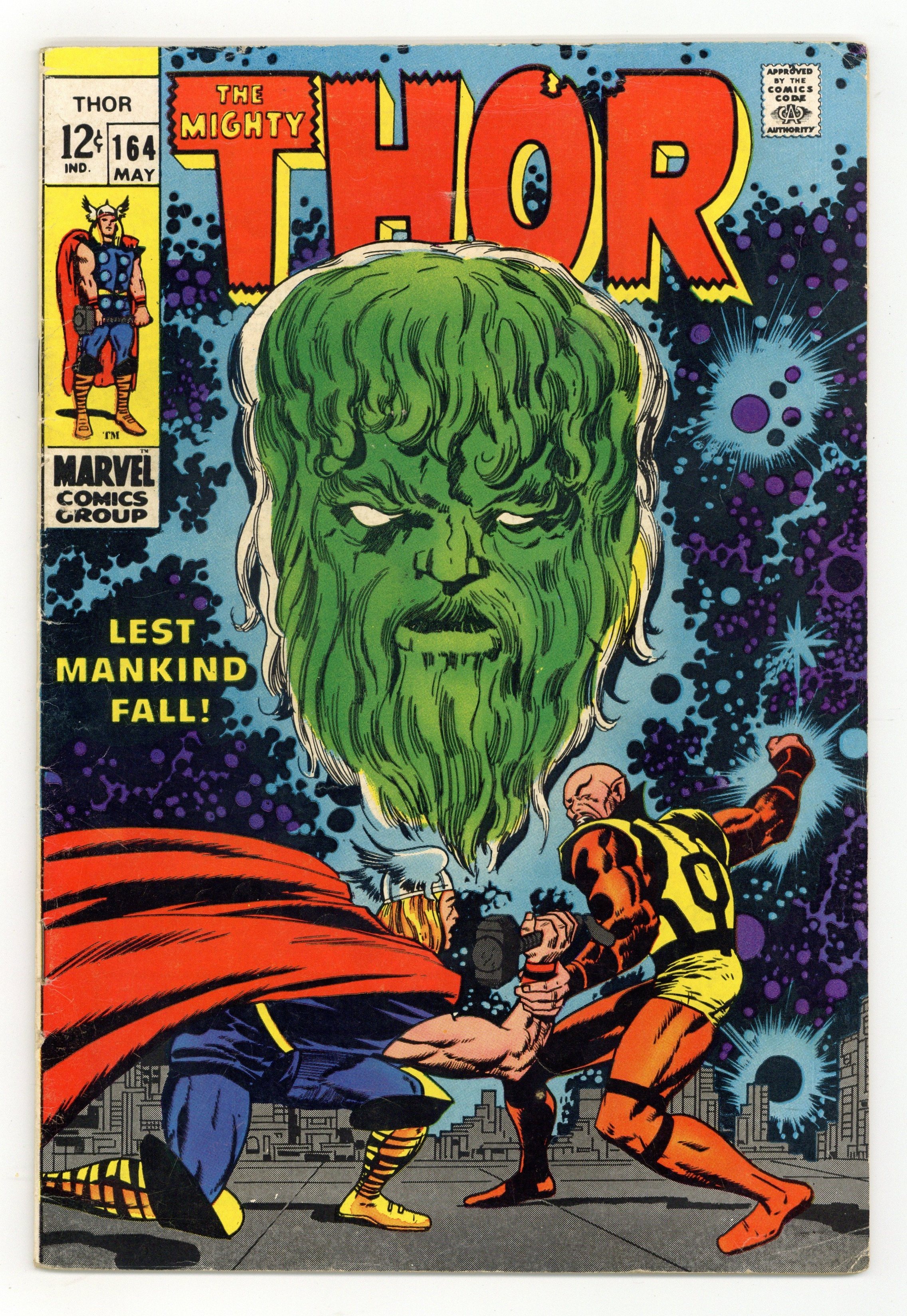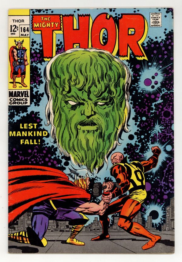 Tags: Marvel Legacy Numbering: Thor (part 164), Thor$16.50Cover pencils by Jack Kirby, inks by Vince Colletta. "Lest Mankind Fall!", script by Stan Lee, pencils by Jack Kirby, inks by Vince Colletta; Trapped in an apocalyptic future with Pluto, God of Death, Sif and Thor find themselves in dire need of back-up; In true god-like fashion, Zeus makes his sweeping entrance; Is the King of the Gods here to support the Asgardians, or Pluto?; Back on Asgard, Balder continues to struggle with stray thoughts of Karnilla, the Norn Queen. Appearances by Balder, Sif, Karnilla, Zeus, and Odin. Re-introduction of Athena (from Red Raven Comics 1, August 1940). Adam Warlock (still in cocoon) cameo. 36 pgs., full color. $0.12. Cover price $0.12.