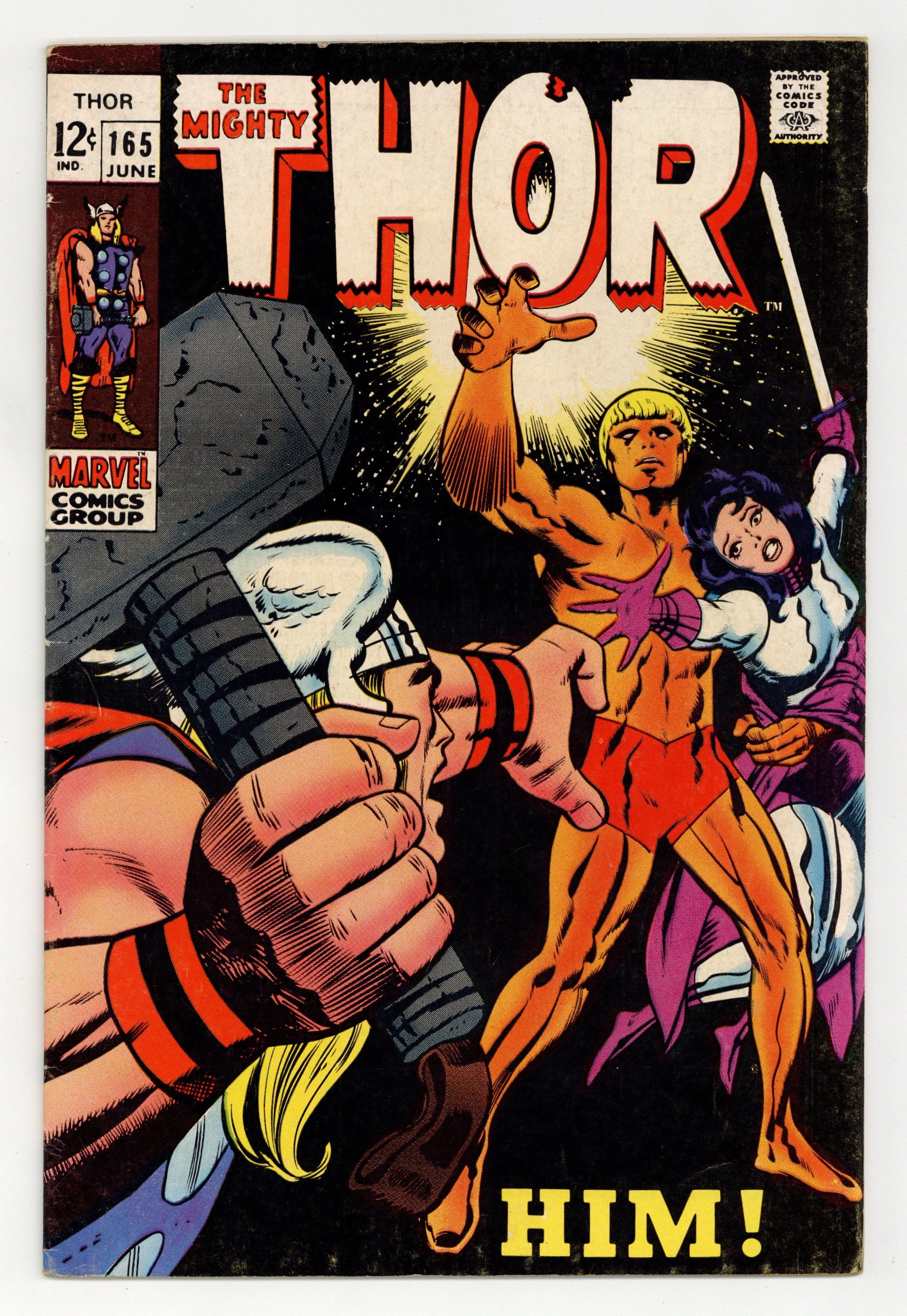 Starts Mar 16 Last 12-cent cover price. Cover pencils by Jack Kirby, inks by Vince Colletta. First full appearance of Adam Warlock in "Him!", script by Stan Lee, pencils by Jack Kirby, inks by Vince Colletta; Balder continues to resist the feminine wiles of Karnilla, and the Norn Queen calls in reinforcements; Meet Haag, a morally-dubious sorceress who has mastered the power of persuasion; Will Balder cave to the sinister love of Karnilla?; Plus, Thor encounters a strange earthling who goes only by the name of "Him." Appearances by Sif and the Watcher. 36 pgs., full color. $0.12. Cover price $0.12.