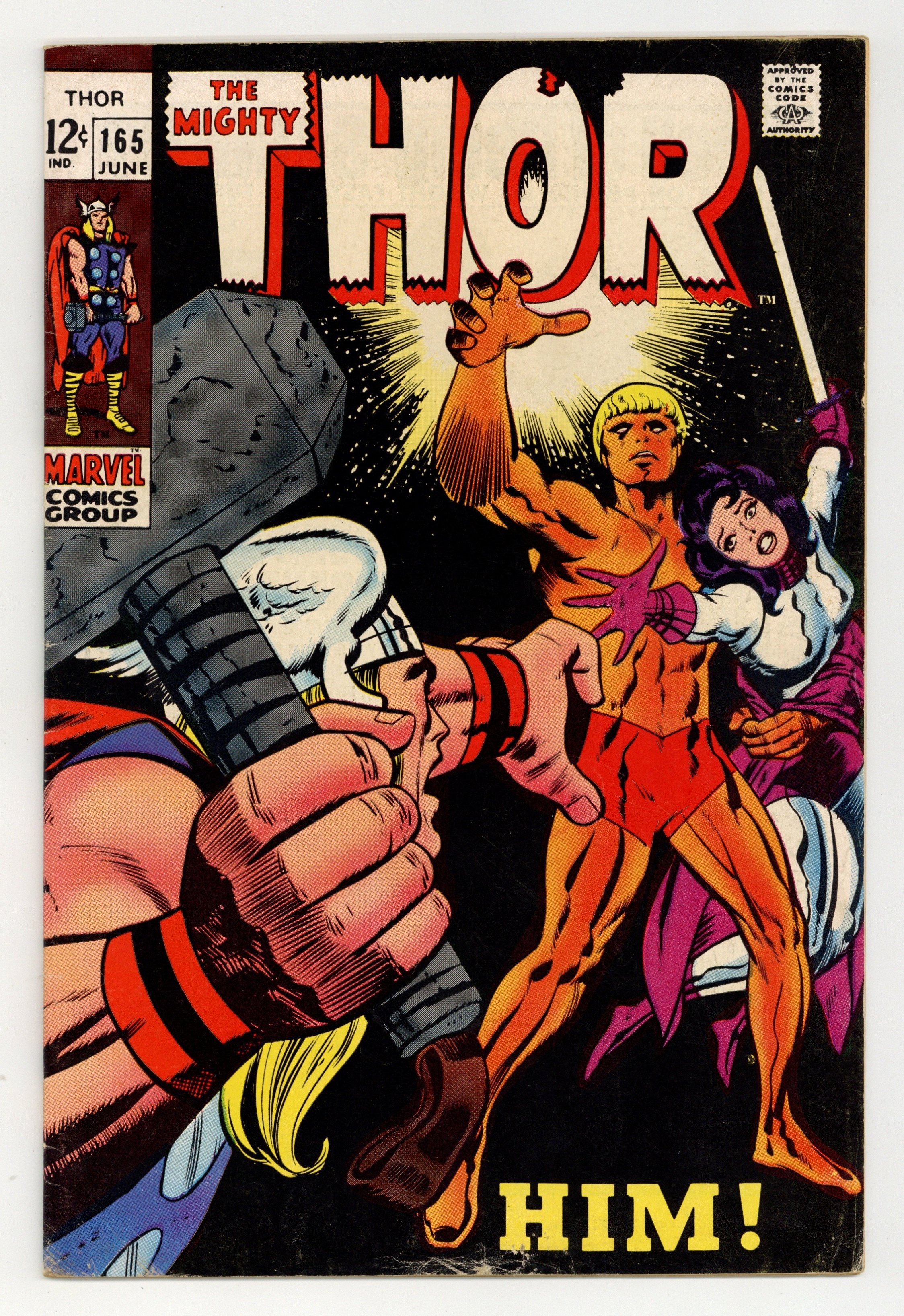 Tags: Marvel Legacy Numbering: Thor (part 165), Thor$110.00Last 12-cent cover price. Cover pencils by Jack Kirby, inks by Vince Colletta. First full appearance of Adam Warlock in "Him!", script by Stan Lee, pencils by Jack Kirby, inks by Vince Colletta; Balder continues to resist the feminine wiles of Karnilla, and the Norn Queen calls in reinforcements; Meet Haag, a morally-dubious sorceress who has mastered the power of persuasion; Will Balder cave to the sinister love of Karnilla?; Plus, Thor encounters a strange earthling who goes only by the name of "Him." Appearances by Sif and the Watcher. 36 pgs., full color. $0.12. Cover price $0.12.