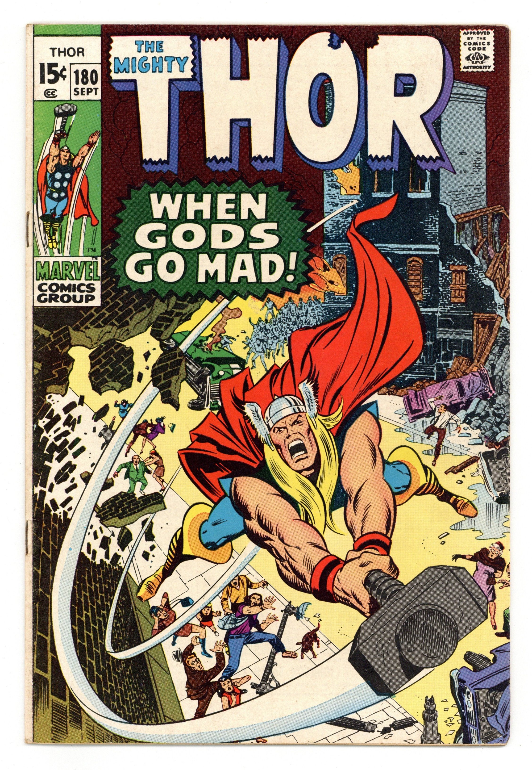 Cover by Neal Adams, Marie Severin, and Joe Sinnott. "When Gods Go Mad!", script by Stan Lee, pencils by Neal Adams, inks by Joe Sinnott; Loki has switched bodies with Thor, and now seeks to ruin Thor's good name by terrorizing the people of Earth; He starts by causing havoc in New York City, however his attempts are countered by Thor (in Loki's body), Balder and Sif who have come to find a way to change the body switch; While in distant Asgard, hearing that Thor has found Loki, Odin becomes furious that the trickster has not been already brought before him and casts his eyes to Earth; Witnessing the battle, and unaware of the body switch, Odin teleports Thor back to Asgard thinking the Thunder God is really Loki. Appearances by Hogun, Fandral, Volstagg, and Mephisto. Galactus cameo. 36 pgs., full color. $0.15. Cover price $0.15.
