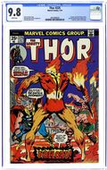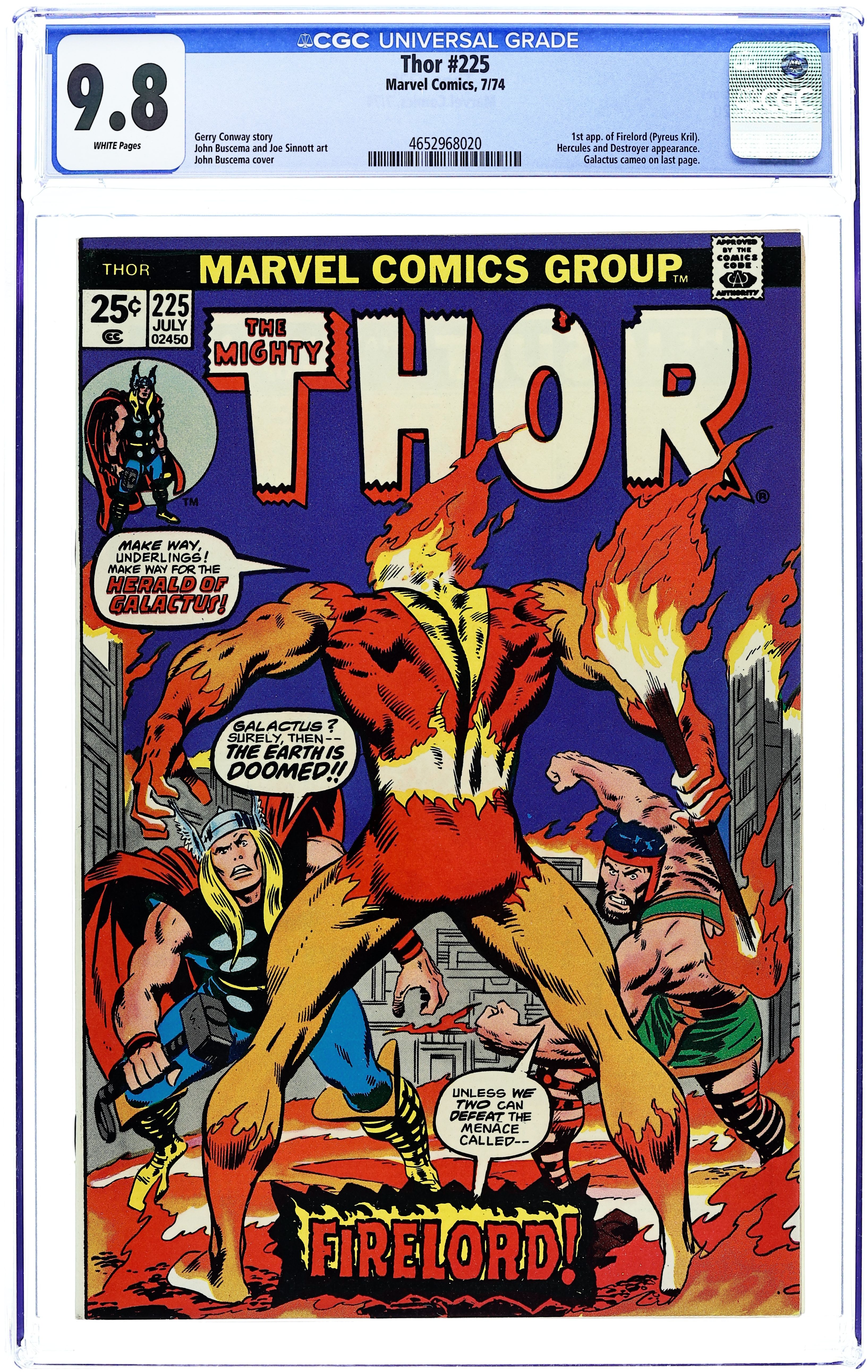 $60.00Cover by John Buscema. First appearance of Firelord in "The Coming of the Firelord!", script by Gerry Conway, pencils by John Buscema, inks by Joe Sinnott; Thor commands Mjolnir to return to him, and so it must; Hercules returns with the body of Holmes, and in drawing close, the spirit returns to his body; While Thor changes back to Blake to check on Krista, Firelord arrives on Earth, and at the selfsame hospital; Hercules and Firelord begin to battle, and Blake's cane is knocked out a window; Blake races to the ground and changes to Thor, and then he stops the battle, realizing who Firelord is - herald to Galactus; Firelord then summons Galactus, and Galactus plans to feast this day. The letters page contains Marvel Value Stamp #17 (Black Bolt by Jack Kirby). Bullpen Bulletins. 36 pgs., full color. $0.25. Cover price $0.25.