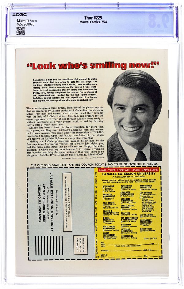 $50.00Cover by John Buscema. First appearance of Firelord in "The Coming of the Firelord!", script by Gerry Conway, pencils by John Buscema, inks by Joe Sinnott; Thor commands Mjolnir to return to him, and so it must; Hercules returns with the body of Holmes, and in drawing close, the spirit returns to his body; While Thor changes back to Blake to check on Krista, Firelord arrives on Earth, and at the selfsame hospital; Hercules and Firelord begin to battle, and Blake's cane is knocked out a window; Blake races to the ground and changes to Thor, and then he stops the battle, realizing who Firelord is - herald to Galactus; Firelord then summons Galactus, and Galactus plans to feast this day. The letters page contains Marvel Value Stamp #17 (Black Bolt by Jack Kirby). Bullpen Bulletins. 36 pgs., full color. $0.25. Cover price $0.25.