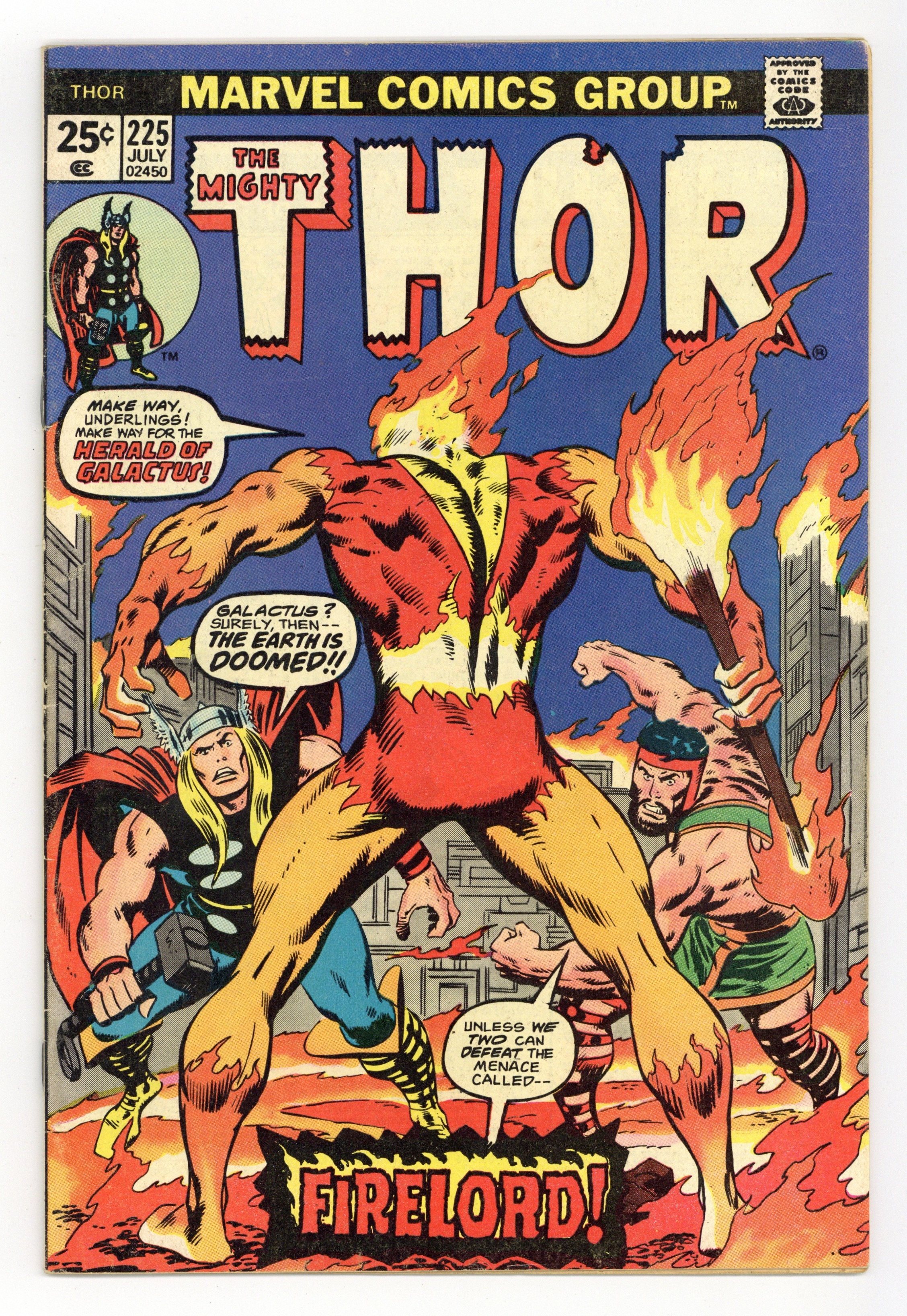 Cover by John Buscema. First appearance of Firelord in "The Coming of the Firelord!", script by Gerry Conway, pencils by John Buscema, inks by Joe Sinnott; Thor commands Mjolnir to return to him, and so it must; Hercules returns with the body of Holmes, and in drawing close, the spirit returns to his body; While Thor changes back to Blake to check on Krista, Firelord arrives on Earth, and at the selfsame hospital; Hercules and Firelord begin to battle, and Blake's cane is knocked out a window; Blake races to the ground and changes to Thor, and then he stops the battle, realizing who Firelord is - herald to Galactus; Firelord then summons Galactus, and Galactus plans to feast this day. The letters page contains Marvel Value Stamp #17 (Black Bolt by Jack Kirby). Bullpen Bulletins. 36 pgs., full color. $0.25. Cover price $0.25.