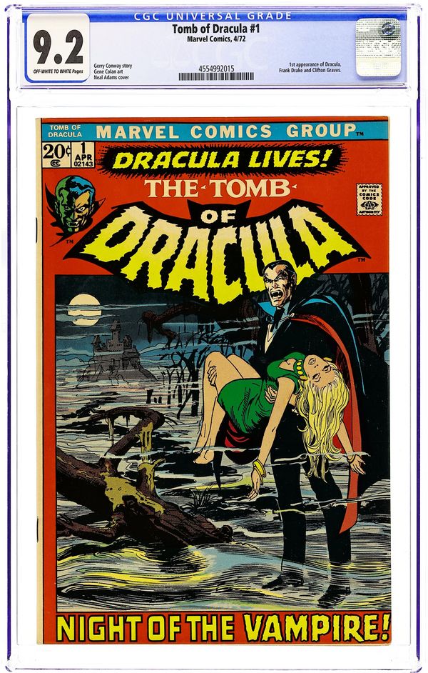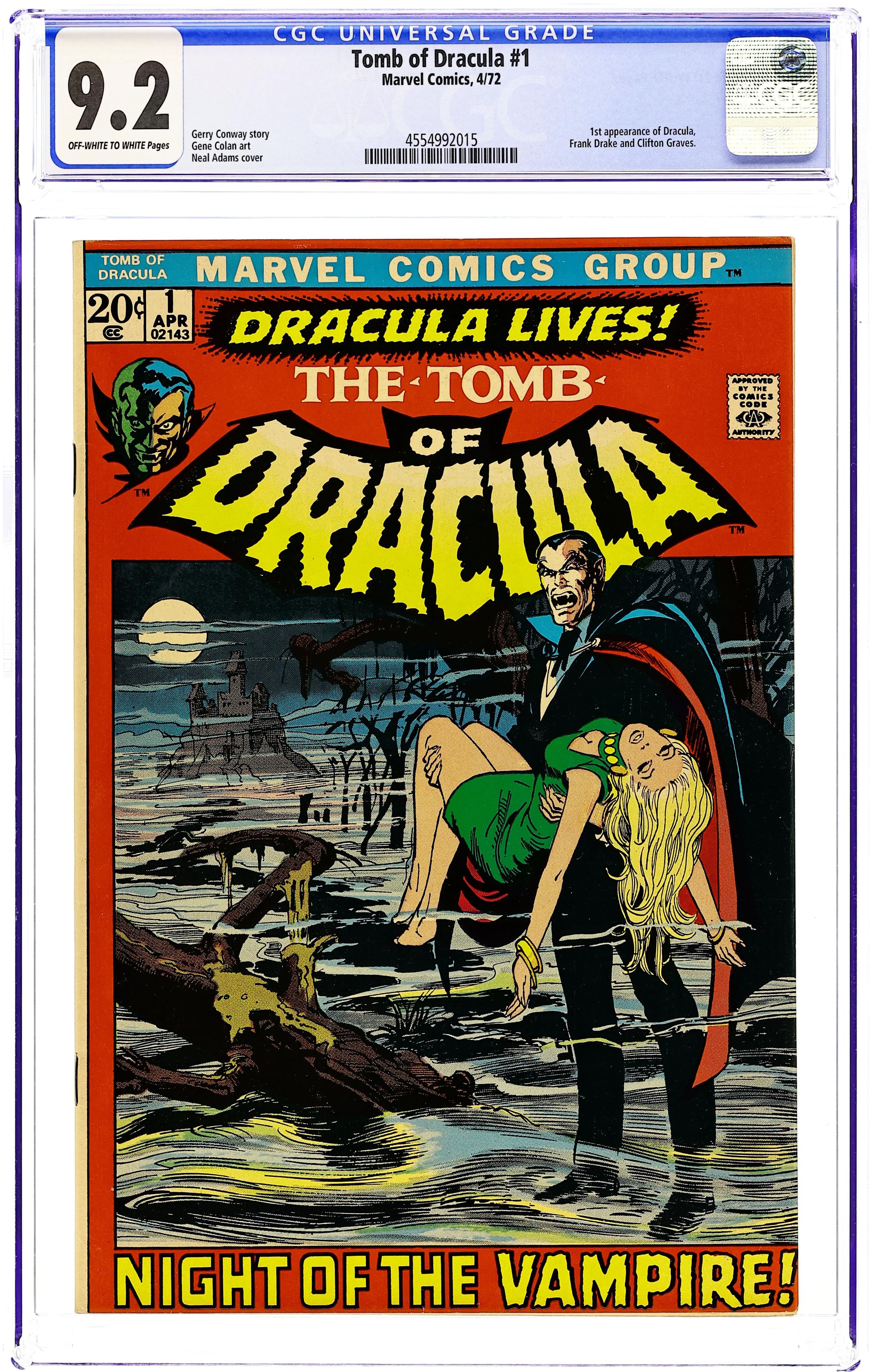 Ends Dec 8 9:47 PM CST Bid History 7 bids Current Bid $81 Your Secret Max Bid If you'd like to bid, please log in or register. 1st appearance of Dracula in a Marvel comic in "Dracula" Written by Gerry Conway. Art by Gene Colan. Cover by Neal Adams. When Frank Drake finds himself drawn to a mysterious castle in the mountains of Transylvania, he accidentally reawakens an ancient curse and unleashes a powerful force for evil onto the world. Dracula, Lord of the Vampires, stalks the earth once more! 32 pages, FC. NOTE: 1st appearance of Frank Drake. Cover price $0.20.