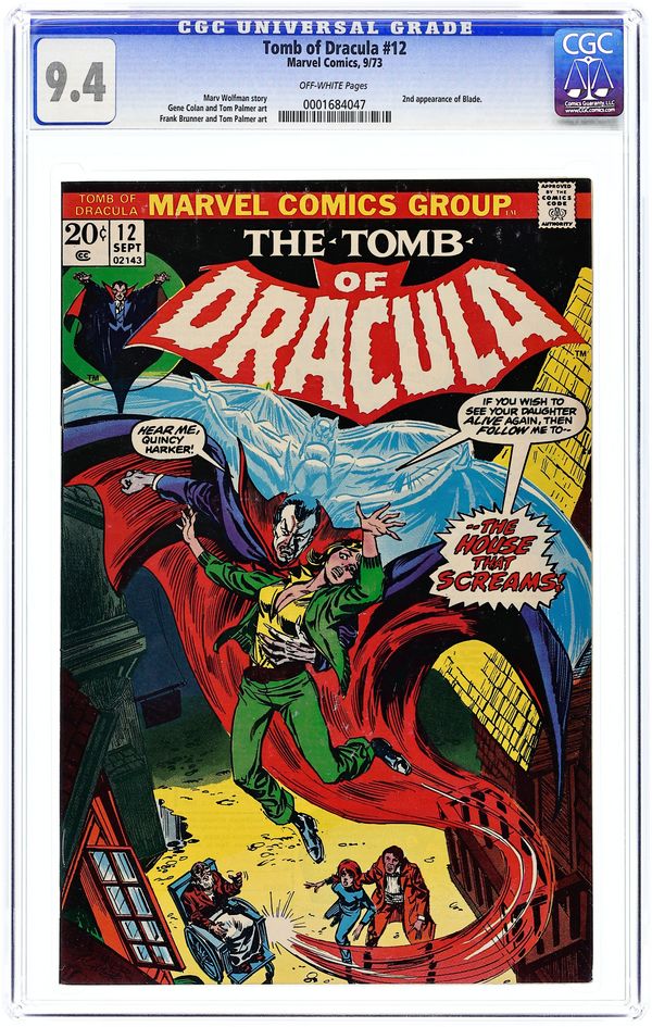 Tags: Vampires$21.00"Night of the Screaming House!" Written by Marv Wolfman. Art by Gene Colan and Tom Palmer. Cover by Frank Brunner and Tom Palmer. Blade returns! But even with the Daywalker's help, Drake, Harker, and the rest of Dracula's enemies are rocked tot heir core when one of their own falls to the curse of the Lord of Vampires! 32 pages, FC. NOTE: This issue marks the beginning of the regular creative team of Wolfman/Colan/Palmer which continues through the end of the series, with issue 70. Cover price $0.20.