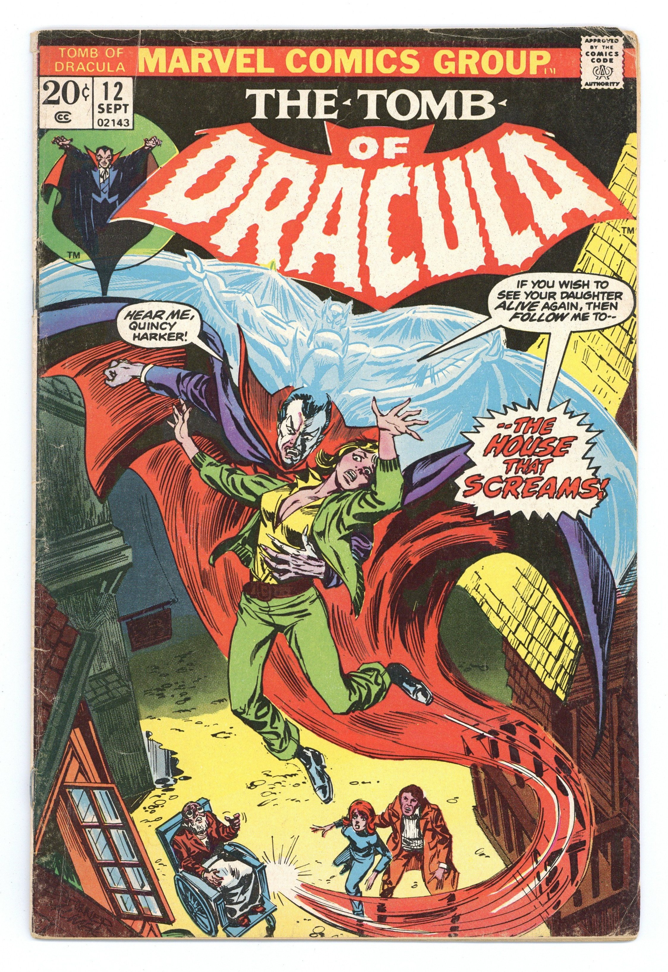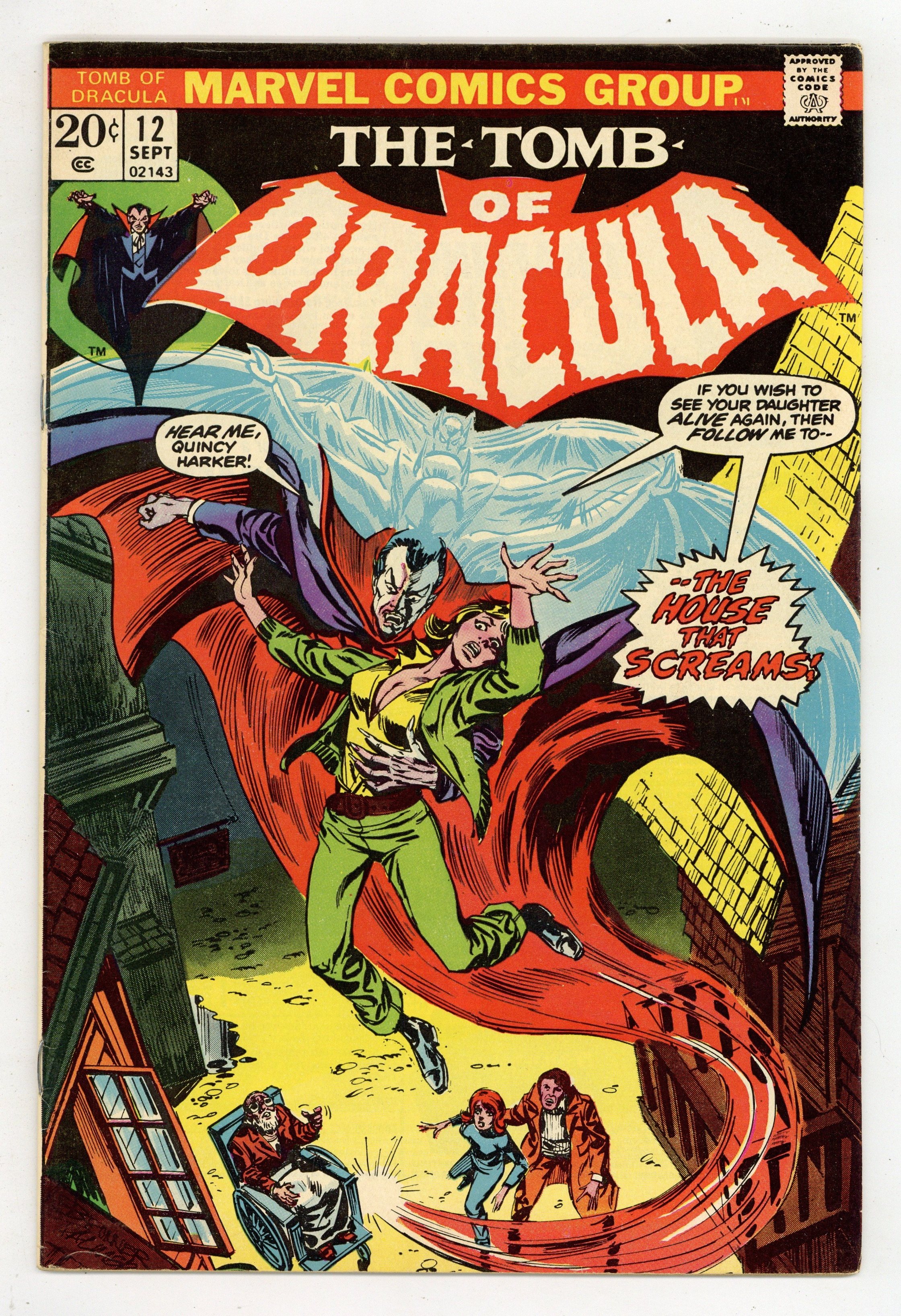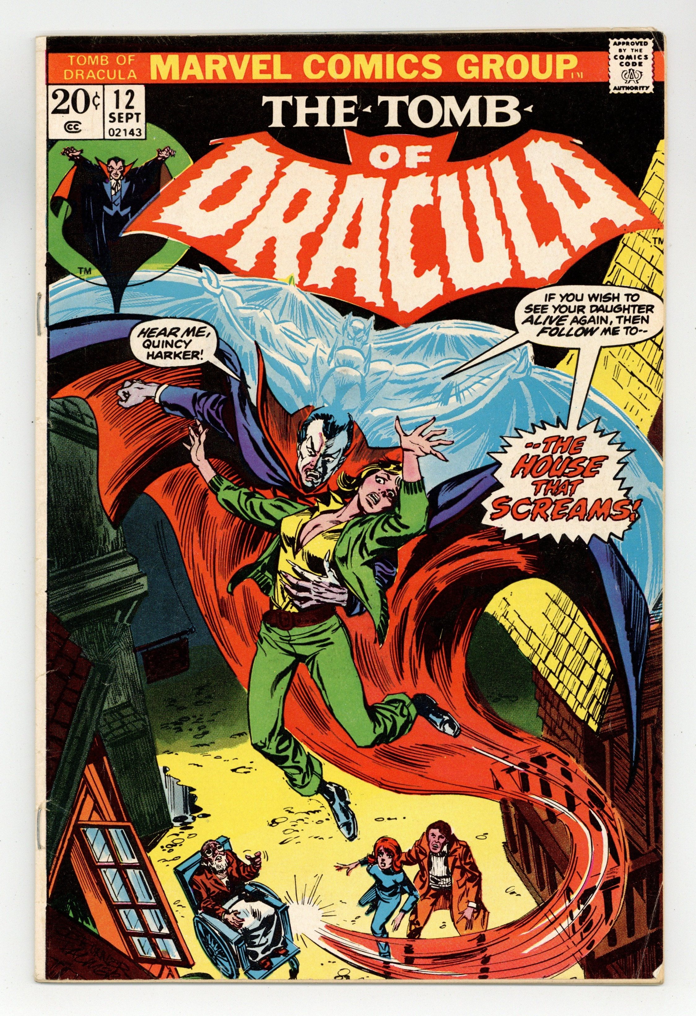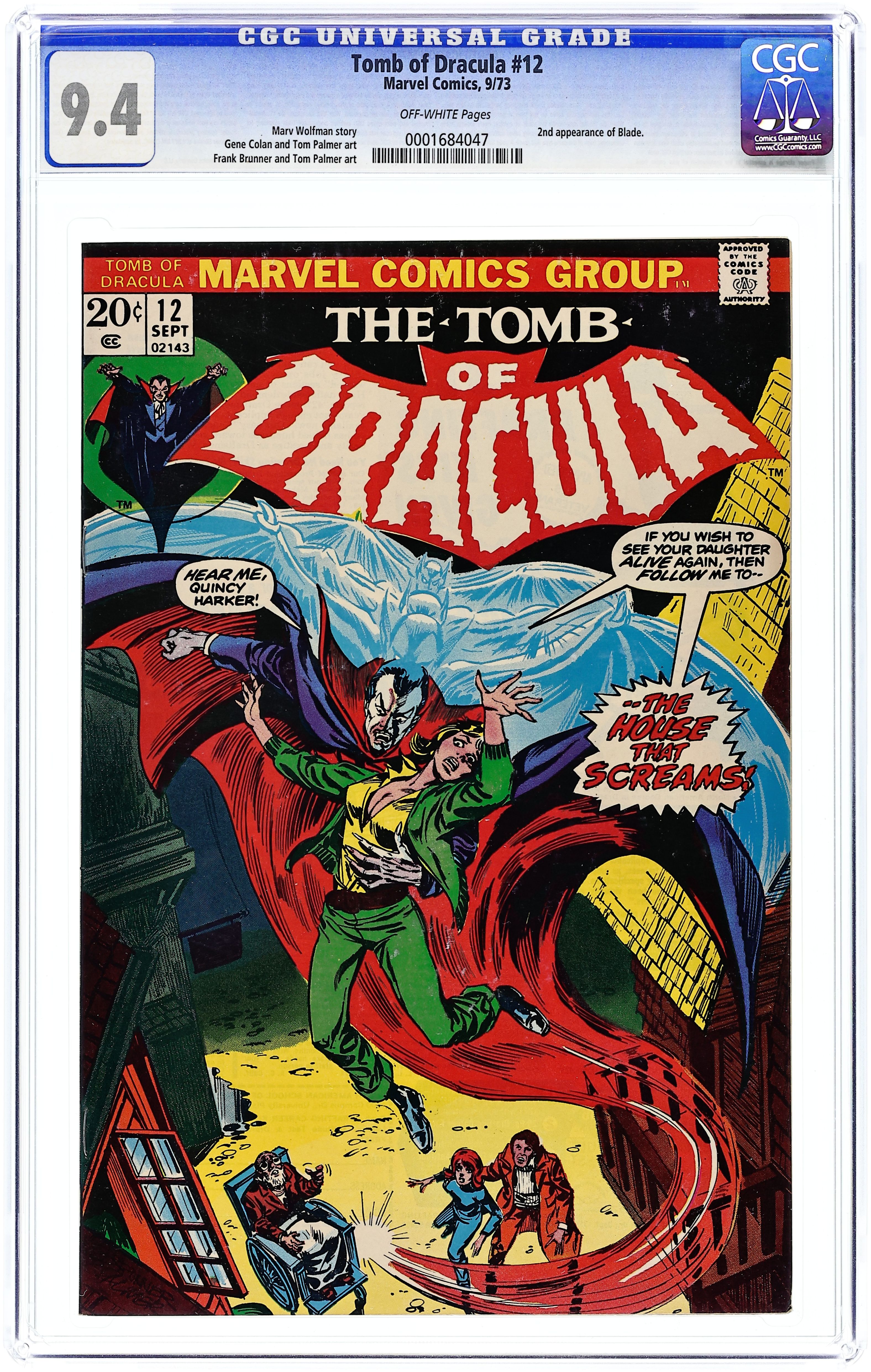 "Night of the Screaming House!" Written by Marv Wolfman. Art by Gene Colan and Tom Palmer. Cover by Frank Brunner and Tom Palmer. Blade returns! But even with the Daywalker's help, Drake, Harker, and the rest of Dracula's enemies are rocked tot heir core when one of their own falls to the curse of the Lord of Vampires! 32 pages, FC. NOTE: This issue marks the beginning of the regular creative team of Wolfman/Colan/Palmer which continues through the end of the series, with issue 70. Cover price $0.20.