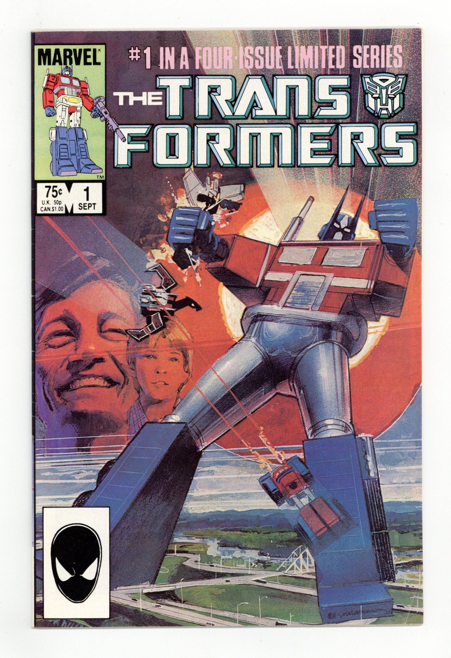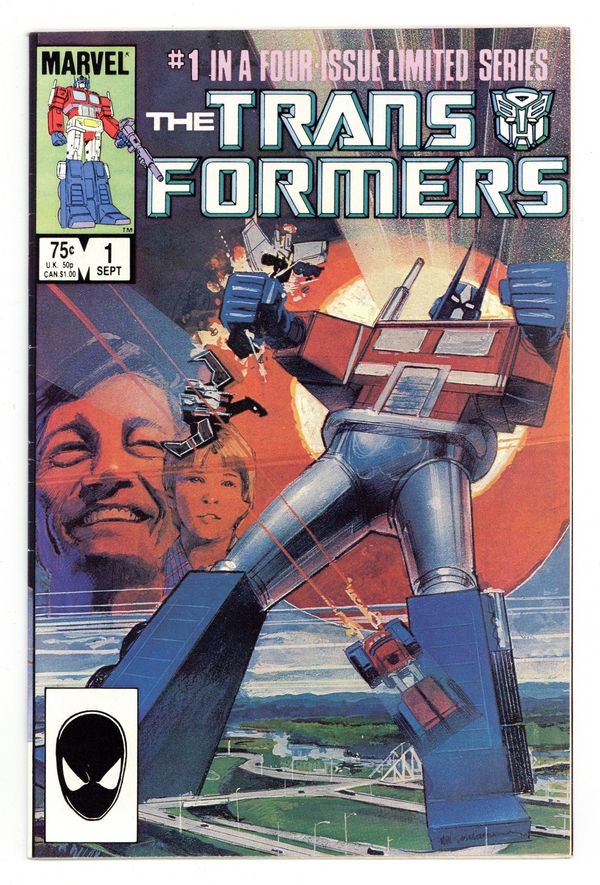 Starts Apr 4 Direct Edition. "The Transformers!" Part 1 of 4. Story by Bill Mantlo and Ralph Macchio. Pencils by Frank Springer. Inks by Kim DeMulder. Cover by Bill Sienkiewicz. Based on the extremely popular toyline and cartoon from the early eighties. For centuries, deep in space, on the techno-organic planet of Cybertron, a war has raged. This battle between the benevolent and peace loving Autobots, led by the heroic Optimus Prime, and the malevolent militaristic Decepticons, led by the dangerous Megatron, has now spilled over to the planet Earth. These Robots in Disguise will continue their eternal struggle and mankind is now caught in the middle. NOTE: This series was originally intended to be a four issue limited series. This is a first printing. All 2nd or 3rd printings have a 2nd, 3rd printing notice on inside at bottom of indicia on first/splash page. 2nd printings were done for most issues from #1 to #9. Cover price $0.75.