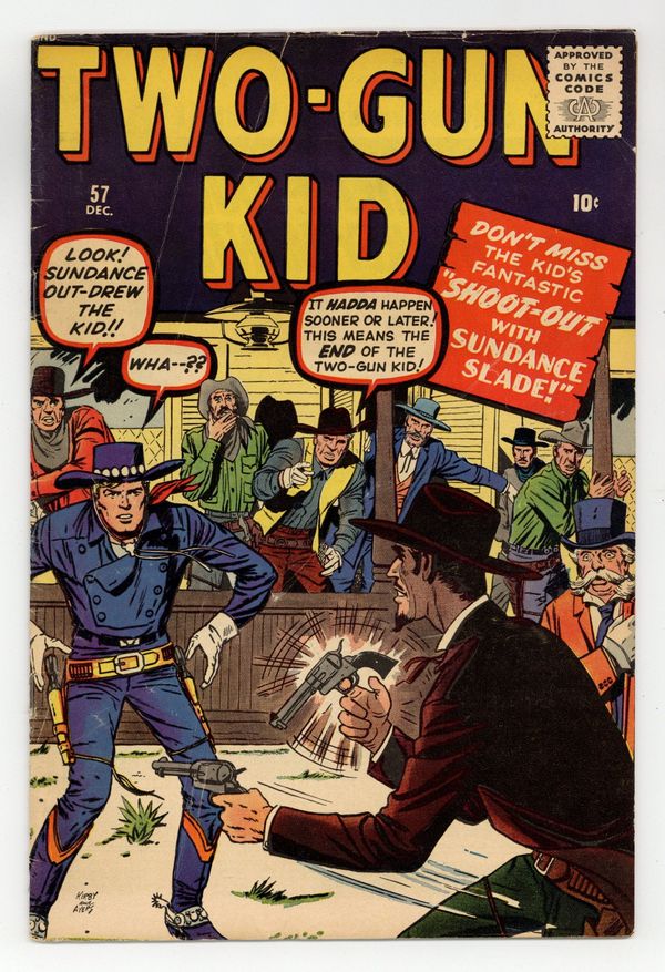 $32.00Cover pencils by Jack Kirby, inks by Dick Ayers. "Shootout with Sundance Slade, Chapter 1," script by Stan Lee, art by John Severin; The Two-Gun Kid investigates the source of gunfire outside the town of Abilene, where a bunch of armed men are trying to run innocent citizens out of town. "Six-Gun Shy" text story. "Sundance Outdraws the Kid, Chapter 2," script by Stan Lee, art by John Severin. "He Wore a Star," script by Stan Lee, pencils by Jack Kirby, inks by Dick Ayers. "The Man Who Hated Guns," script by Stan Lee, art by John Severin; The town of Red Rock is visited by a traveling preacher named Brown, who calls on the men of the town to give up their guns as honest men do not use weapons. 36 pgs., full color. $0.10. Cover price $0.10.