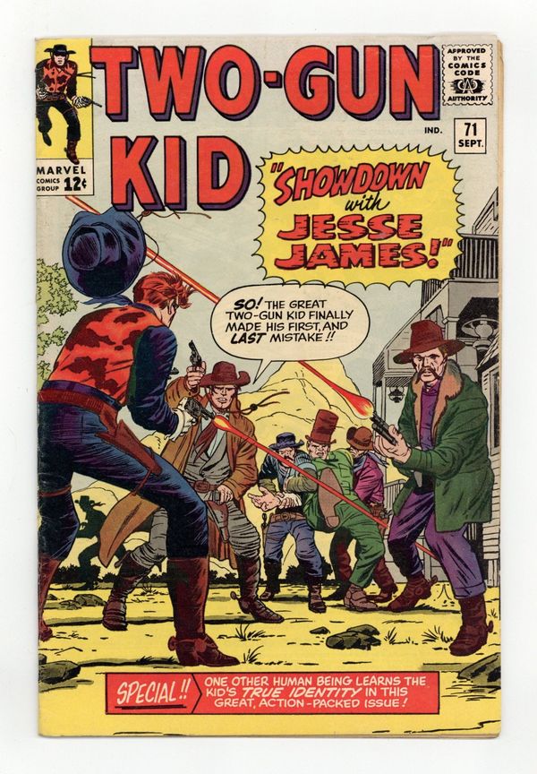 $24.00Cover by Jack Kirby and Dick Ayers. Stories by Stan Lee and Larry Lieber. Art by Dick Ayers, Larry Lieber and George Roussos. The Two-Gun Kid finally makes his first and last mistake! And one other human being learns the Kid's true identity in "Showdown with Jesse James!" by Stan Lee, Dick Ayers and George Roussos. Also in this issue: Back-up story "Action at Arrow Rock!" by Lee (plot), Larry Lieber (script/pencils) and Roussos (inks). 32 pages, full color. Cover price $0.12.