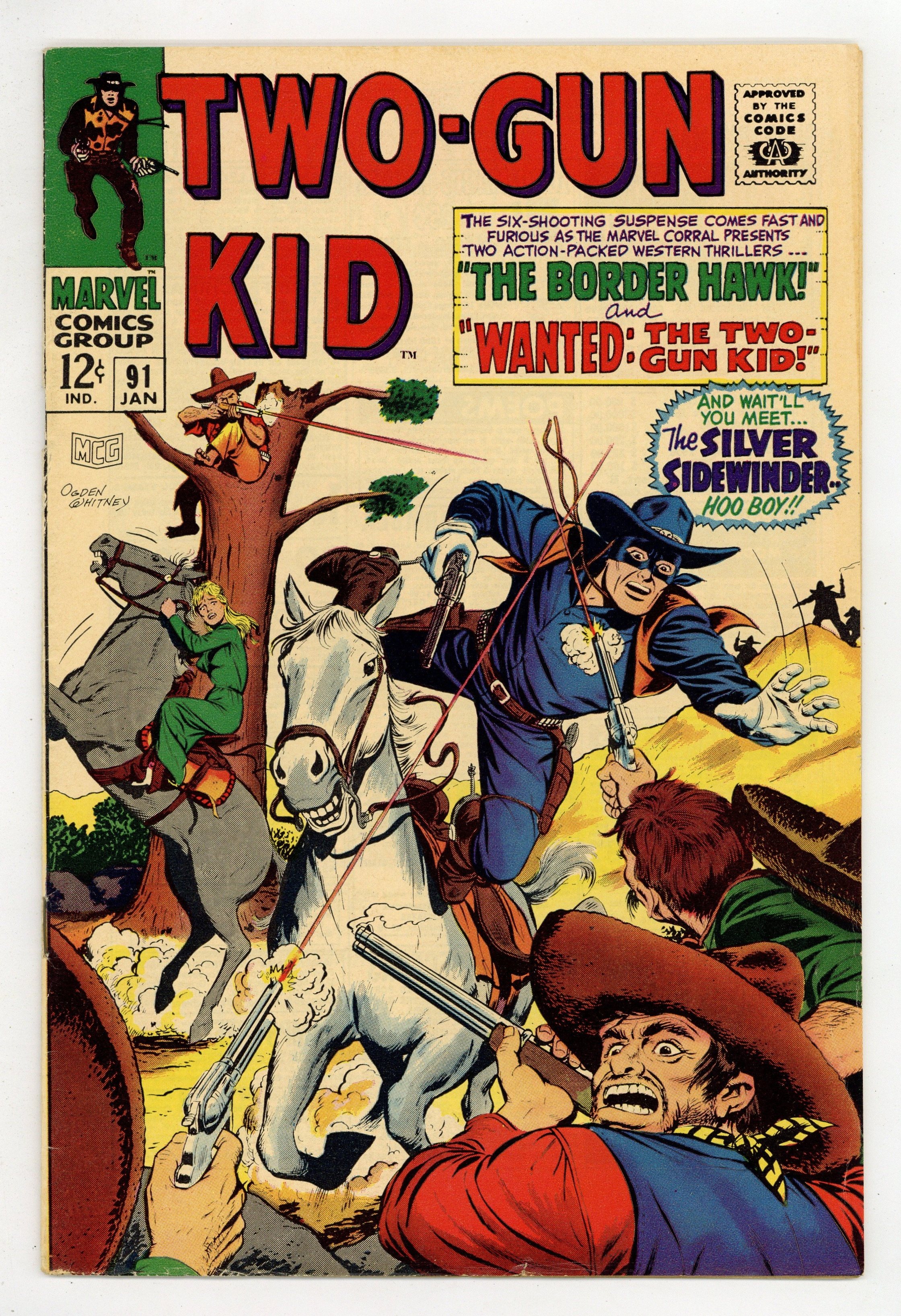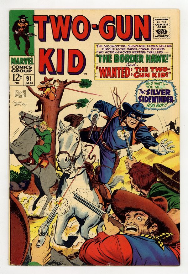 Cover by Ogden Whitney. Stories by Raymond Marais, Gary Friedrich, Ron Whyte and Bill Everett. Art by Ogden Whitney and Bill Everett. The six-shooting suspense comes fast and furious as the Marvel corral presents two action-packed Western thrillers starring the Two-Gun Kid: "On the Trail of...the Border Hawk!" by Raymond Marais and Ogden Whitney and "Wanted: The Two-Gun Kid!" (featuring the introduction of the Silver Sidewinder) by Gary Friedrich, Ron Whyte and Whitney. Also in this issue: Back-up story "The Medicine-Man" by Bill Everett. 32 pages, full color. Cover price $0.12.