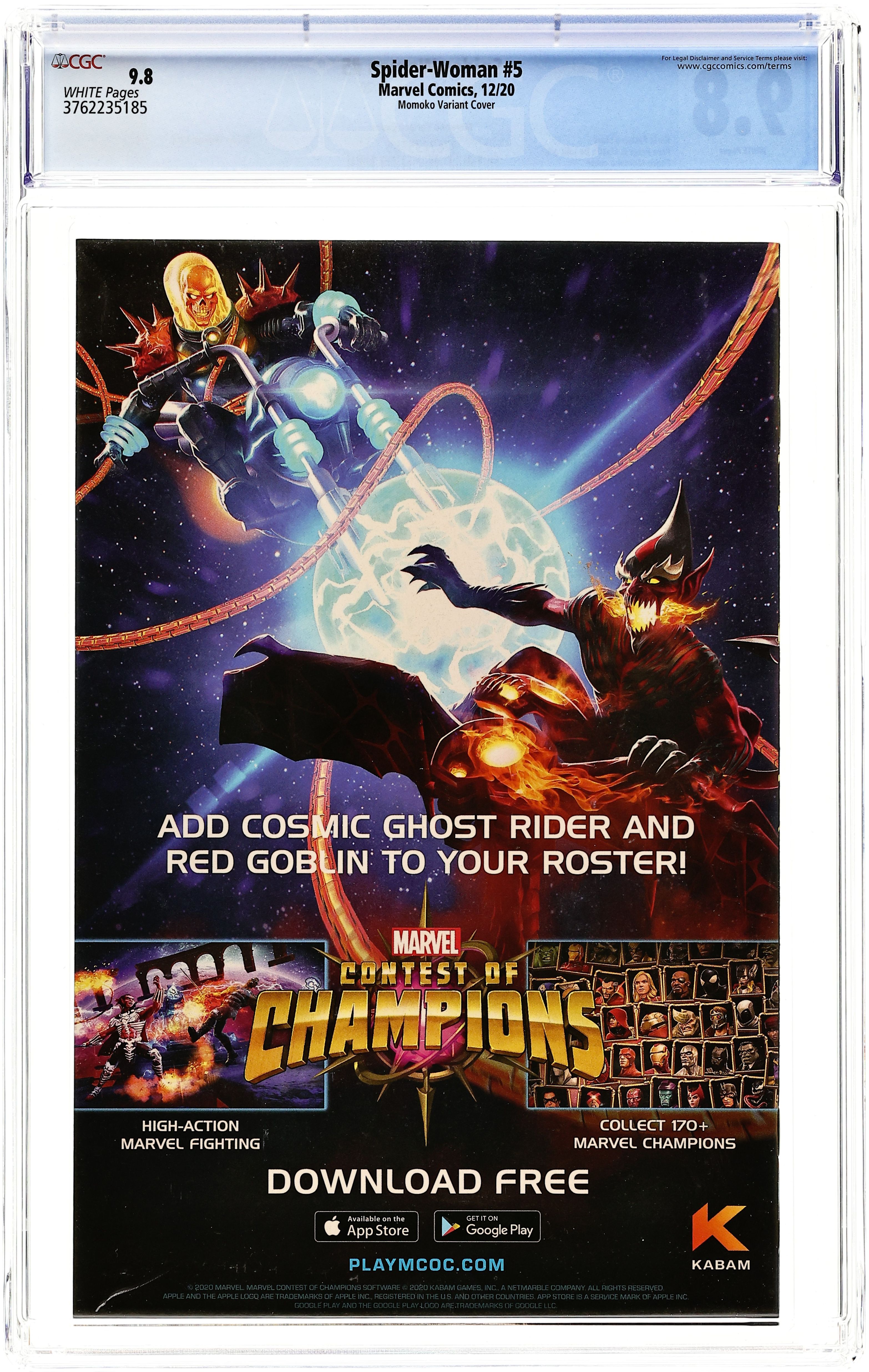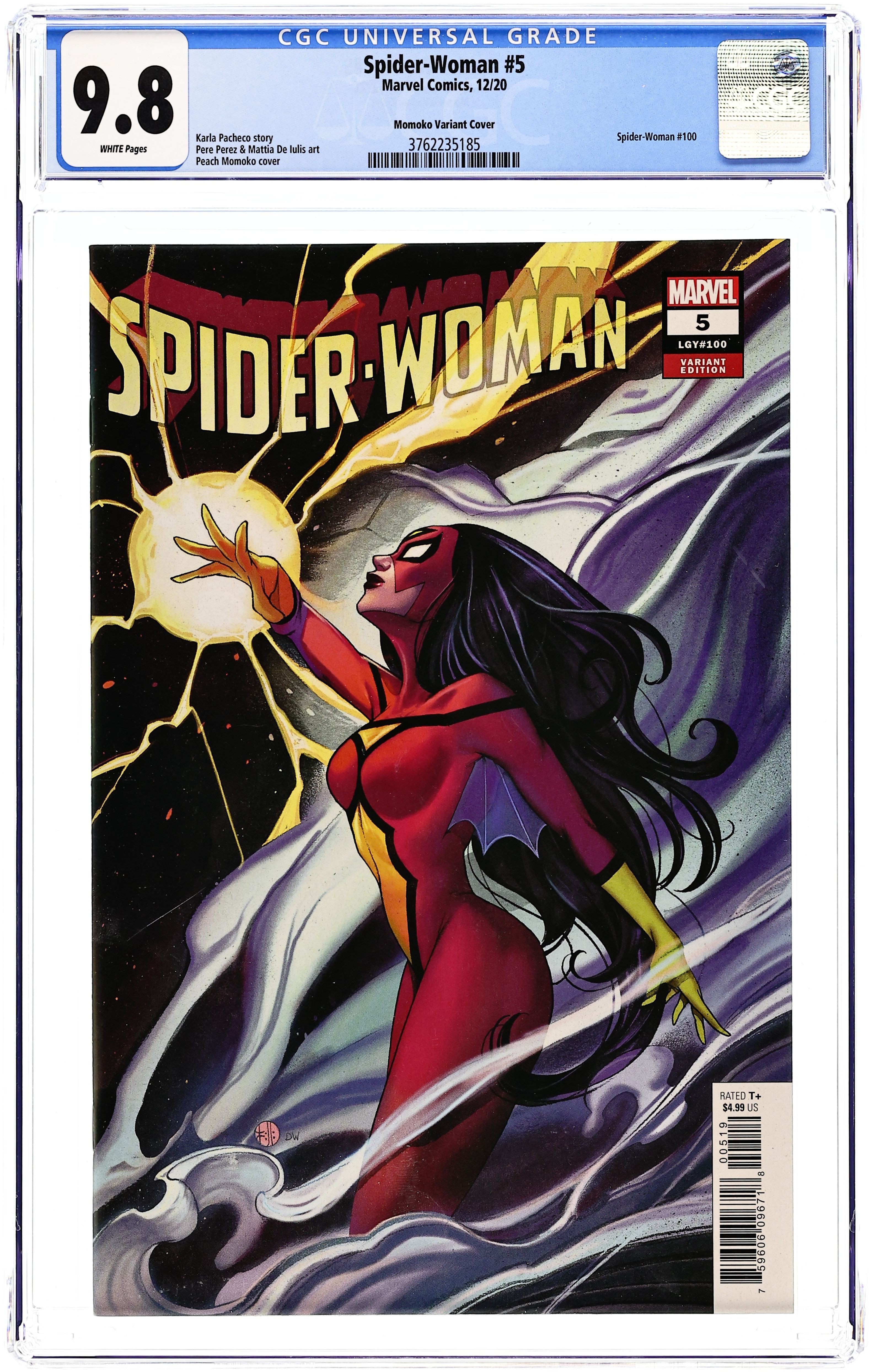 Written by Karla Pacheco. Art by Pere Perez and Mattia De Iulis. Cover by Peach Momoko. With not just her life but her family's on the line, Spider-Woman takes desperate action! As her own body turns against her and with her enemies so close to home, can Jess hold herself together in time to save everyone?! An unmissable blockbuster 100th issue with all the stops and no punches pulled! 36 pages, full color. Rated T+ Cover price $4.99.