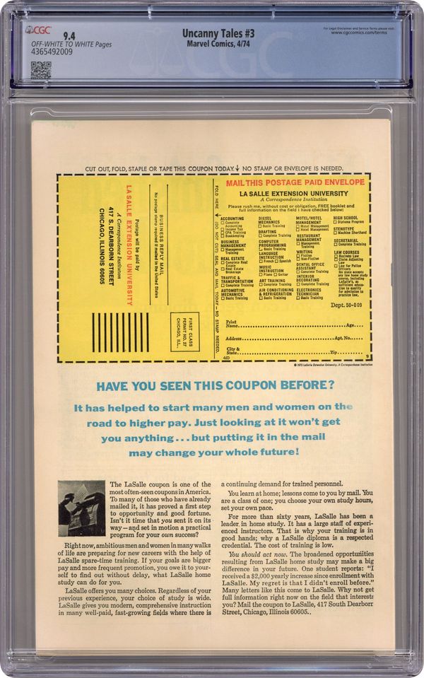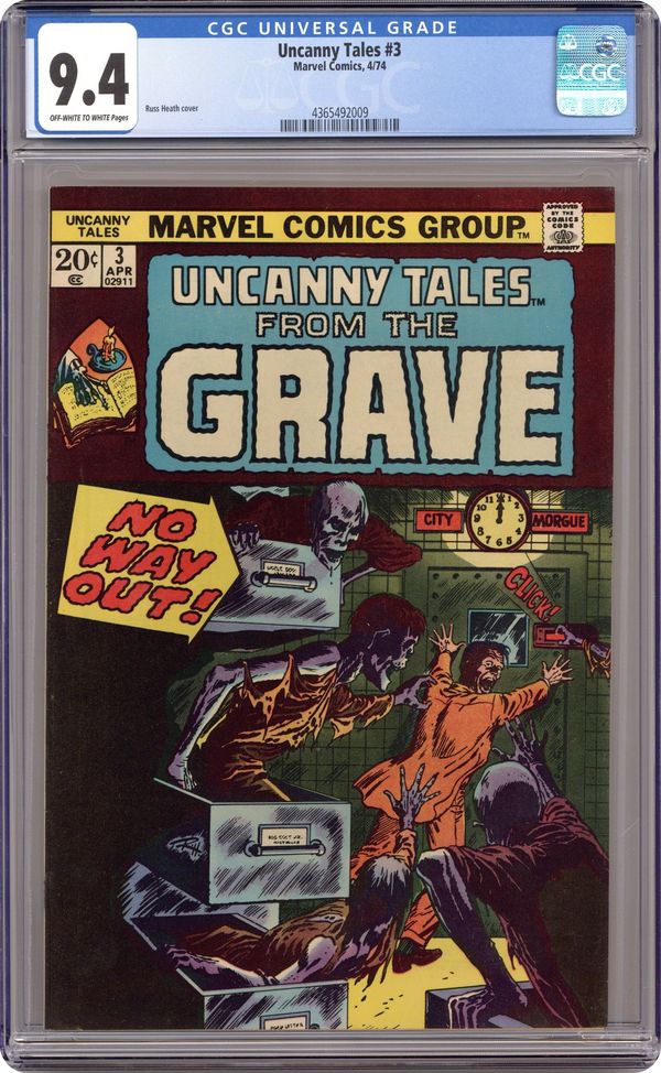 Last 20-cent cover price. All reprints. Cover art by Russ Heath. "The Storm" (from Strange Tales #8), art by Vic Carrabotta; A killer hijacks a plane to escape the police; The pilot turns out to be Satan and he lands the plane in Hell. "This Way Out" (from Adventures into Weird Worlds #17), art by Carmine Infantino and Carl Burgos (last panel only); In a hospital prison ward, a condemned killer's other occupant in the room tells him that there are no bars on the window; The killer attempts to escape through the window, but the other patient in the room turns out to be Death and the window looks into the execution chamber. "The Little Monsters" (from Marvel Tales #114), art by Tony DiPreta; A nephew visits his uncle on an African plantation to ask for help with his gambling debts; When the uncle refuses, he resolves to murder him for the inheritance. "The Pharaoh Walks" (from Uncanny Tales #38) , script by Carl Wessler, art by Manny Stallman; A bookkeeper who resents his job rides an Egyptian solar ship into the beyond where the Pharaoh makes him his bookkeeper for all eternity. 36 pgs., full color. Cover price $0.20.