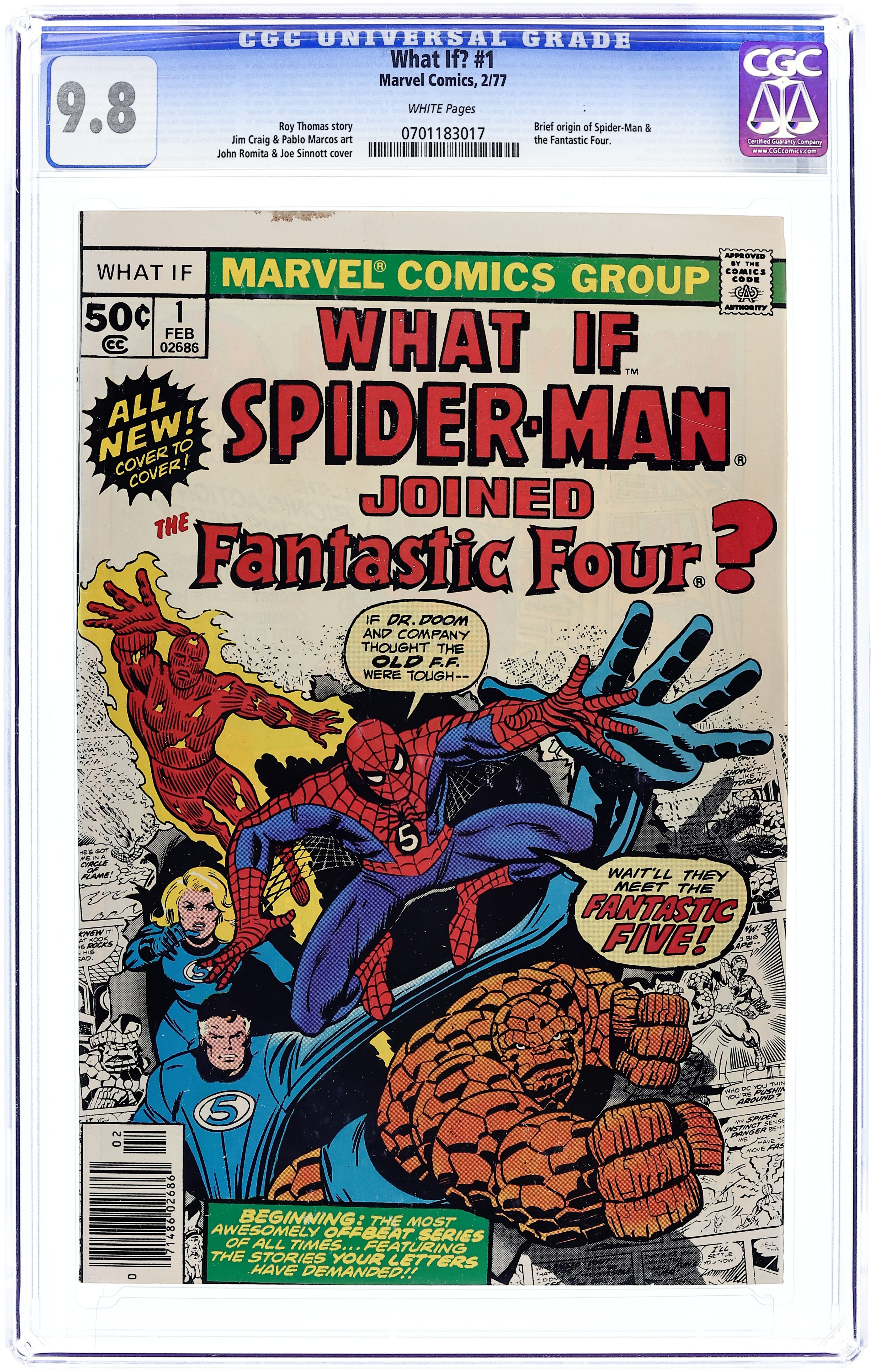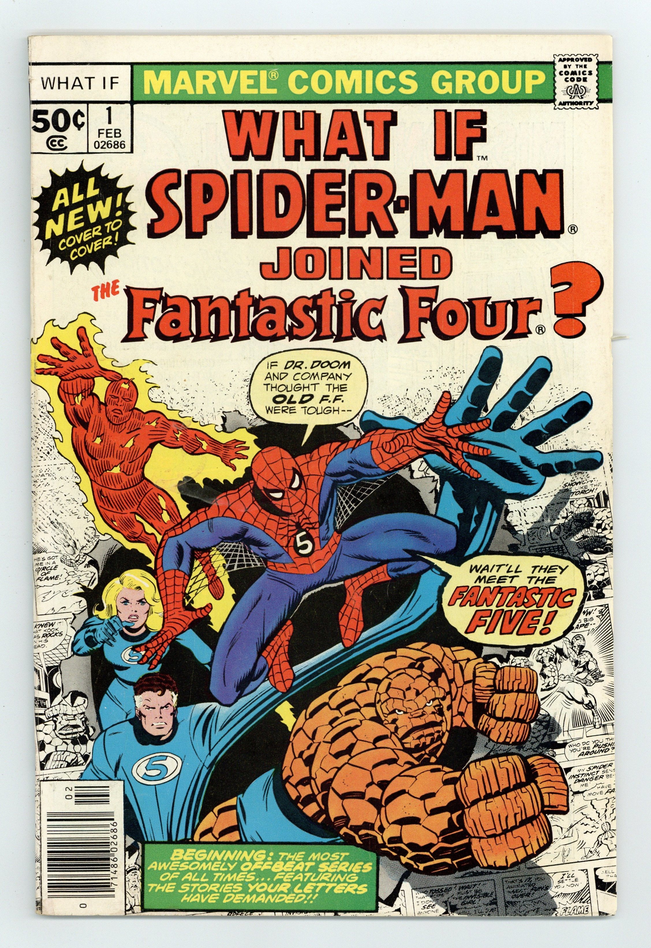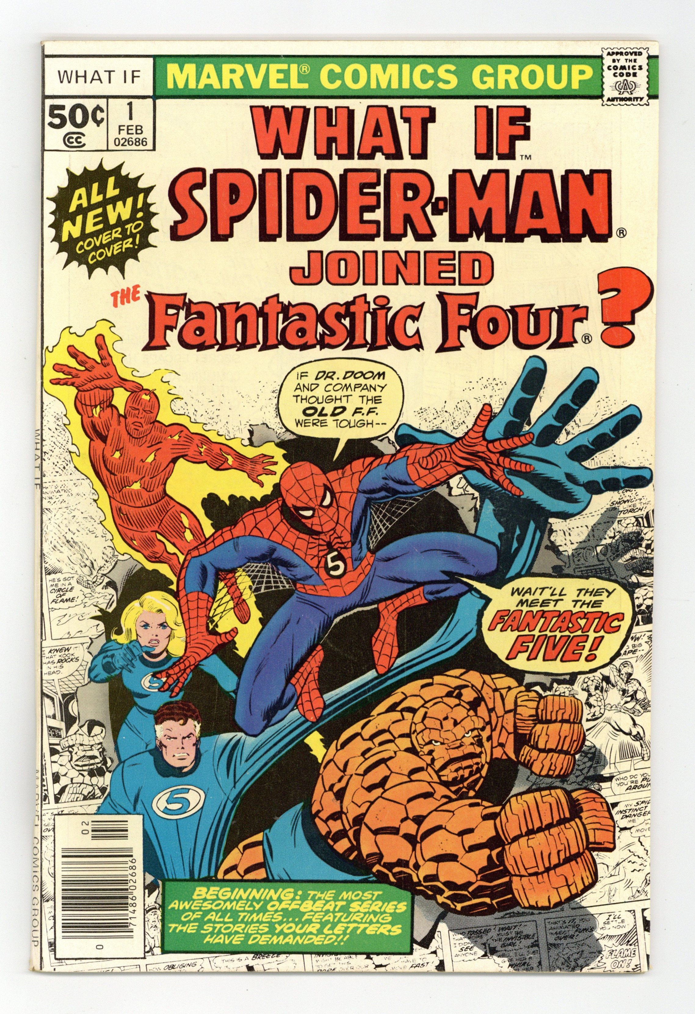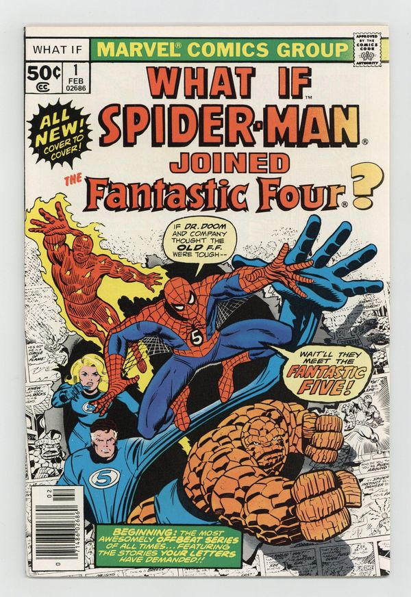 Starts Dec 15 Cover by Ron Wilson and Joe Sinnott. What if Spider-Man Joined the Fantastic Four? Script by Roy Thomas, pencils by Jim Craig, inks by Pablo Marcos; Spider-Man becomes a member of the FF; Cameos by Killraven, the Squadron Supreme, and Deathlok. Hostess Fruit Pie ad with the Hulk, pencils by Dave Cockrum. Ad for Richochet Racers with Spider-Man and Captain America. Roy Thomas discusses how the title came about. 52 pgs. Cover price $0.50.