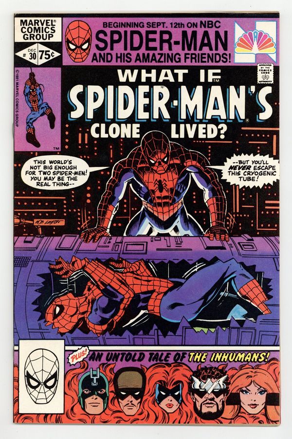 $18.50"What If...Spider-Man's Clone had Survived?" Script by Bill Flanagan. Art by Rich Buckler (breakdowns), Jim Mooney (finishes), and Pablo Marcos (finishes). Cover by Bob Layton. In the classic Amazing Spider-Man 149, the Spider-Clone perished in battle vs. the Jackal. But now the Watcher presents an alternate reality in which Spider-Man's clone survives the harrowing encounter at Shea Stadium that fateful afternoon. After the explosion that killed the Jackal, the Spider-Clone frees Ned Leeds, scoops up the other web-slinger, and asks the Gwen Stacy clone to call the police! The Spider-Clone takes the real Spider-Man back to Professor Warren's laboratory for safekeeping! In the days ahead, the clone attempts to resume Peter Parker's normal life, but his awkward encounters with Joe Robertson, Betty Brant, and Glory Grant make him realize that something is terribly wrong! Once the clone comes to grips with his true self, he frees the genuine wall-crawler! And together Spider-Man and the Spider-Clone fight and defeat the Kingpin! It looks like the start of a beautiful friendship! Flashback cameos by Gwen Stacy and the Green Goblin. Backup story: "Moving Day!" Script by Peter Gillis. Art by Ron Wilson (breakdowns) and Joe Sinnott (finishes). In this untold tale of the Marvel Universe, the Inhumans pack up and move the Great Refuge to the Himalayan Mountains! Appearances by Black Bolt, Medusa, Karnak, Gorgon, Crystal, and the Eternals. (Notes: The original clone saga took place in Amazing Spider-Man 141-151. Many years later this What If story became reality in the mainstream Marvel Universe via the controversial second clone saga that ran through the Spider-Man titles from 1994 to 1996. Both stories were reprinted in 2008 in the trade paperback: What If? Classic 5.) 52 pages. Cover price $0.75.