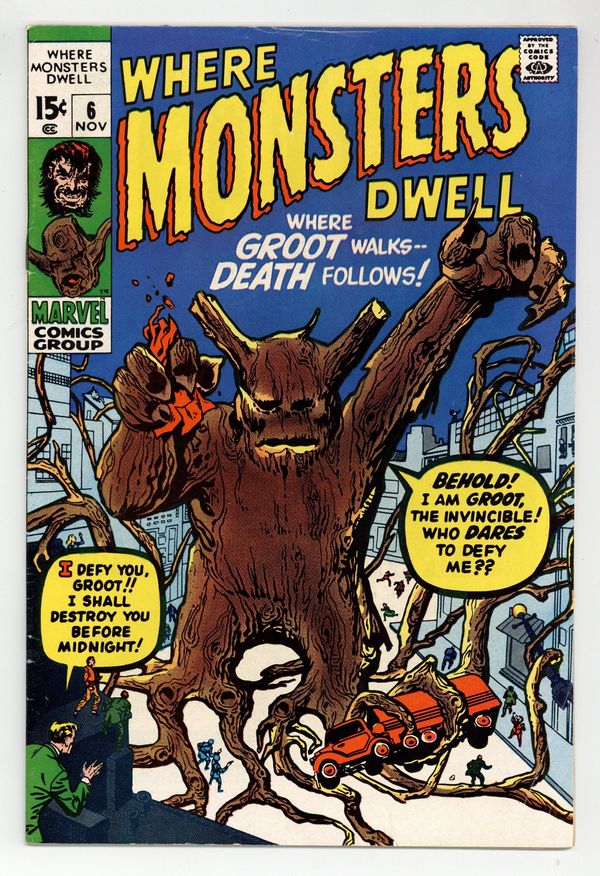 Cover pencils by Jack Kirby, inks by Steve Ditko. I Challenged...Groot! The Monster from Planet X!, pencils by Jack Kirby, inks by Dick Ayers; The monarch of Planet X arrives on Earth in order to capture a town for experimental purposes back on his home world. I Dared to Look Into the Beyond!, pencils by Jack Kirby, inks by Steve Ditko; A scientist builds a time machine to travel into the future. He believes that he has travelled to the past, demonstrating that the future does not yet exist, but in fact he saw a future in which Earth was abandoned. My Friend Is...Not Quite Human!, art by Steve Ditko; A misogynist wood-carver falls in love with his sculpture and has himself transformed into wood, but his refusal to pay a gypsy mystic leads to her making the wooden figure human out of spite. When the Saucer Strikes!, art by Paul Reinman. All reprints. 36 pgs. $0.15. Cover price $0.15.