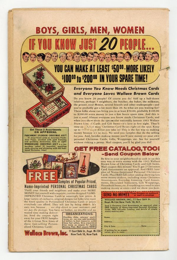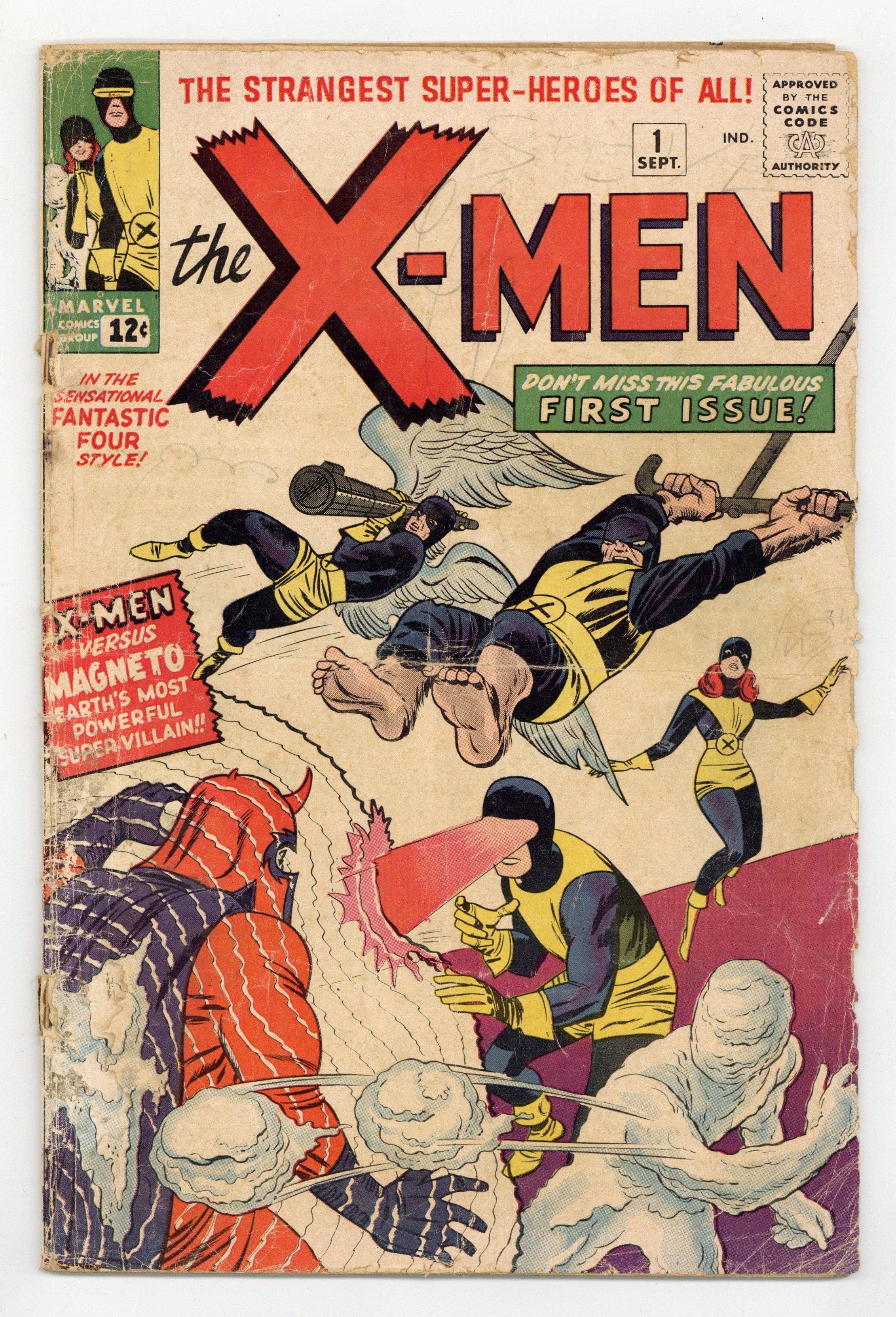 Cover pencils by Jack Kirby, inks by Sol Brodsky. X-Men, script by Stan Lee, pencils by Jack Kirby, inks by Paul Reinman; After a day of training and meeting Jean Grey, a new student at Professor X's school, the X-Men go one their first assignment--stopping a mutant named Magneto from talking over an Air Force base. Full page house ads for Amazing Spider-Man #4 and Sgt. Fury and His Howling Commandos #3. This is it, the first issue of the Uncanny X-Men, and even in the beginning, there was Magneto, the Earth's most powerful super villain. Conceived by Stan Lee and Jack Kirby, this first issue will always remain one of the core books within the Marvel Comics mythos. This is Stan and Jack making history and legend, although no one knew it at the time. First appearances of Professor X, Cyclops, Iceman, the Angel, the Beast, Marvel Girl, and Magneto. 36 pgs. $0.12. Cover price $0.12.