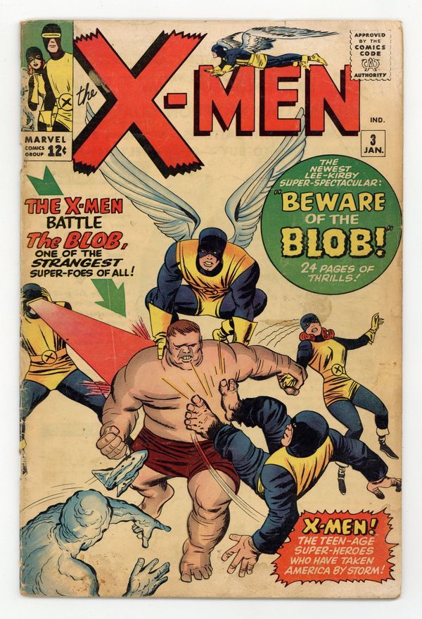 First appearance of the Blob. Cover pencils by Jack Kirby. Beware of the Blob!, script by Stan Lee, pencils by Jack Kirby, inks by Paul Reinman; Professor X detects a new mutant and sends the X-Men to investigate; They arrive at a carnival and encounter the Blob, a very fat sideshow attraction who can bounce bullets off of his malleable hide as well as anchor himself to the earth and become immovable; The X-Men bring him back to the mansion as a potential member but the Blob spurns their invitation and returns to the carnival; Realizing that the Blob knows their secret, the X-Men lure him back to the mansion where Xavier wipes his memory. 36 pgs. $0.12. Cover price $0.12.