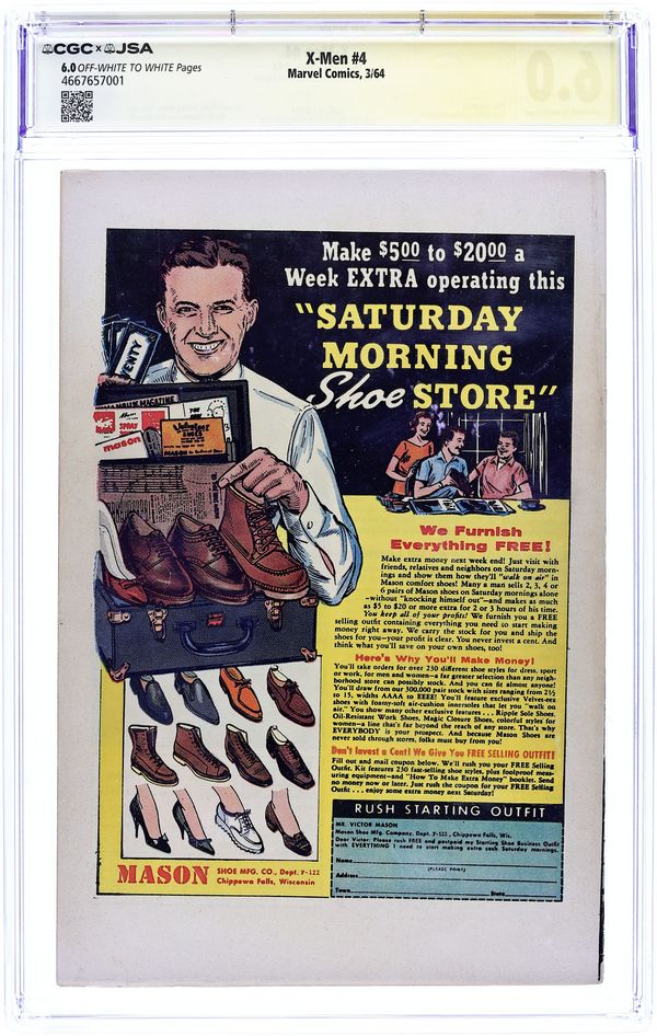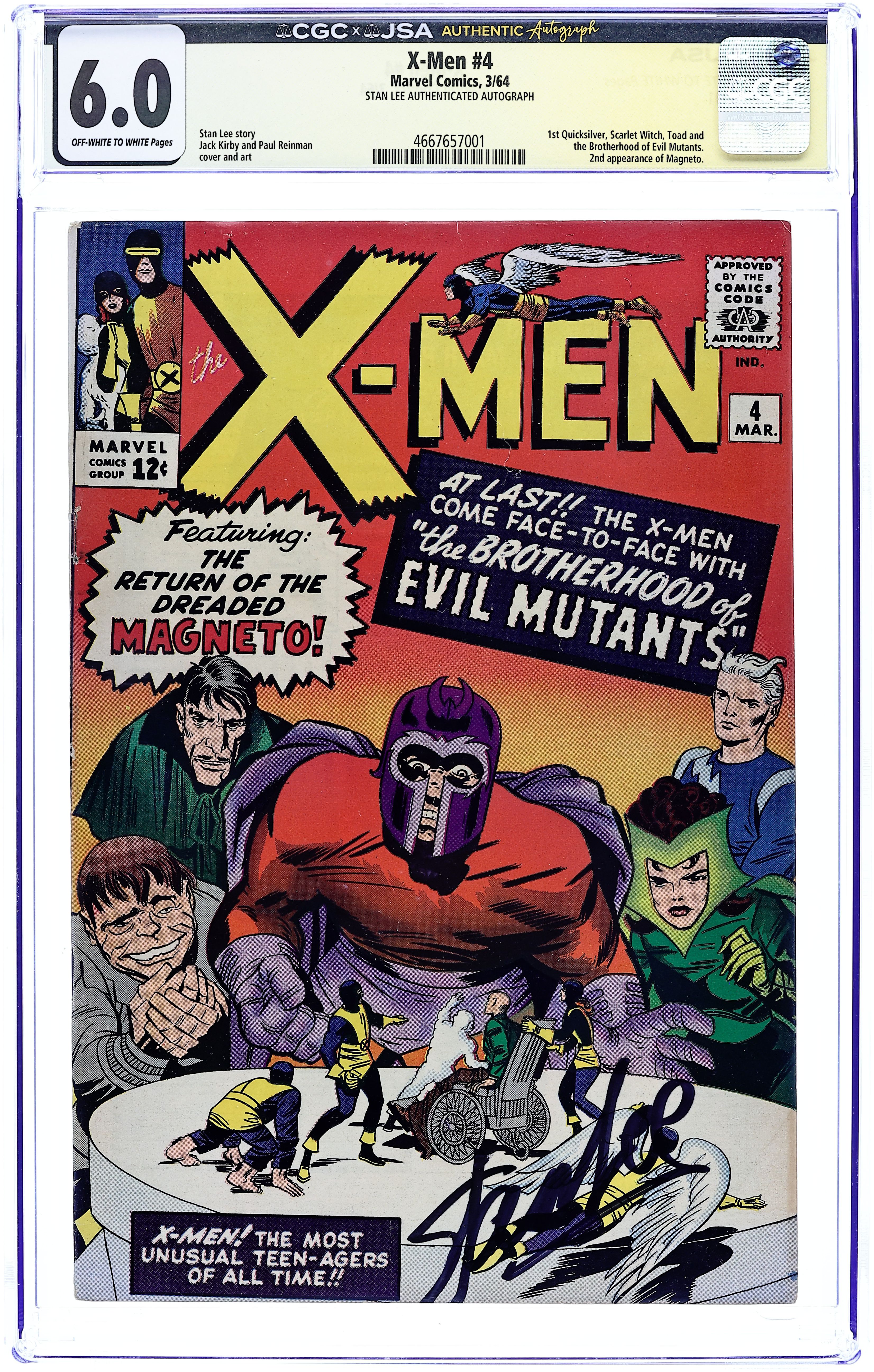 Ends Apr 15 8:40 PM CST Bid History 14 bids Current Bid $2,572 Your Secret Max Bid If you'd like to bid, please log in or register. Quicksilver, Scarlet Witch, Mastermind, and Toad appear for the 1st time, and Magneto makes his 2nd appearance. Cover pencils by Jack Kirby. The Brotherhood of Evil Mutants!, script by Stan Lee, pencils by Jack Kirby, inks by Paul Reinman; Magneto and his new Brotherhood of Evil Mutants steals a freighter and uses it to take over the South American nation of Santo Marco; The X-Men invade and take the country back; Xavier is caught in an explosion and loses his mental powers. 36 pgs. Cover price $0.12.