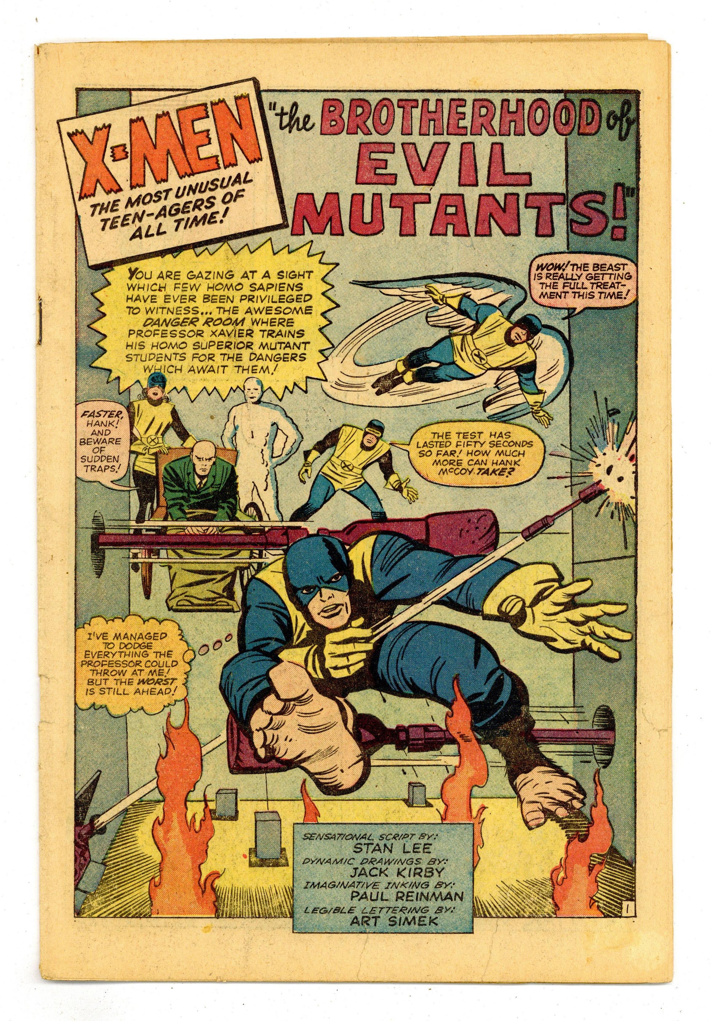 Quicksilver, Scarlet Witch, Mastermind, and Toad appear for the 1st time, and Magneto makes his 2nd appearance. Cover pencils by Jack Kirby. The Brotherhood of Evil Mutants!, script by Stan Lee, pencils by Jack Kirby, inks by Paul Reinman; Magneto and his new Brotherhood of Evil Mutants steals a freighter and uses it to take over the South American nation of Santo Marco; The X-Men invade and take the country back; Xavier is caught in an explosion and loses his mental powers. 36 pgs. Cover price $0.12.