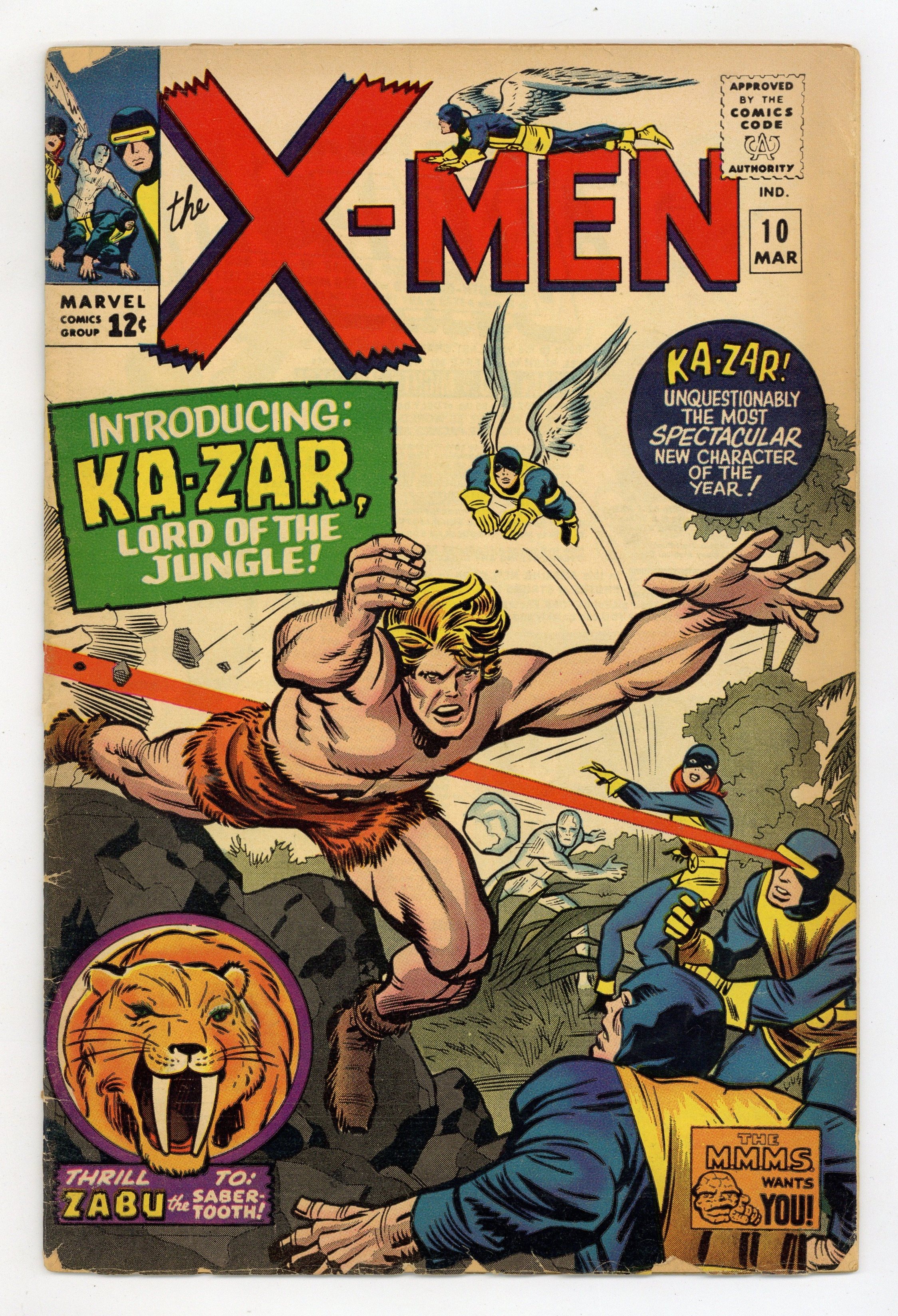 Cover pencils by Jack Kirby, inks by Chic Stone. The Coming of Ka-Zar, script by Stan Lee, pencils by Jack Kirby, inks by Chic Stone; Even though he is not a mutant, Xavier allows the X-Men to travel to Antarctica and enter the Savage Land to investigate the noble savage, Ka-Zar; They end up having to save Jean and Warren from being sacrificed by the savage Swamp Men; 1st Silver Age Ka-Zar. (The original Ka-Zar appeared in Marvel Comics #1 and Marvel Mystery Comics between 1939 andf 1942.) 36 pgs. $0.12. Cover price $0.12.