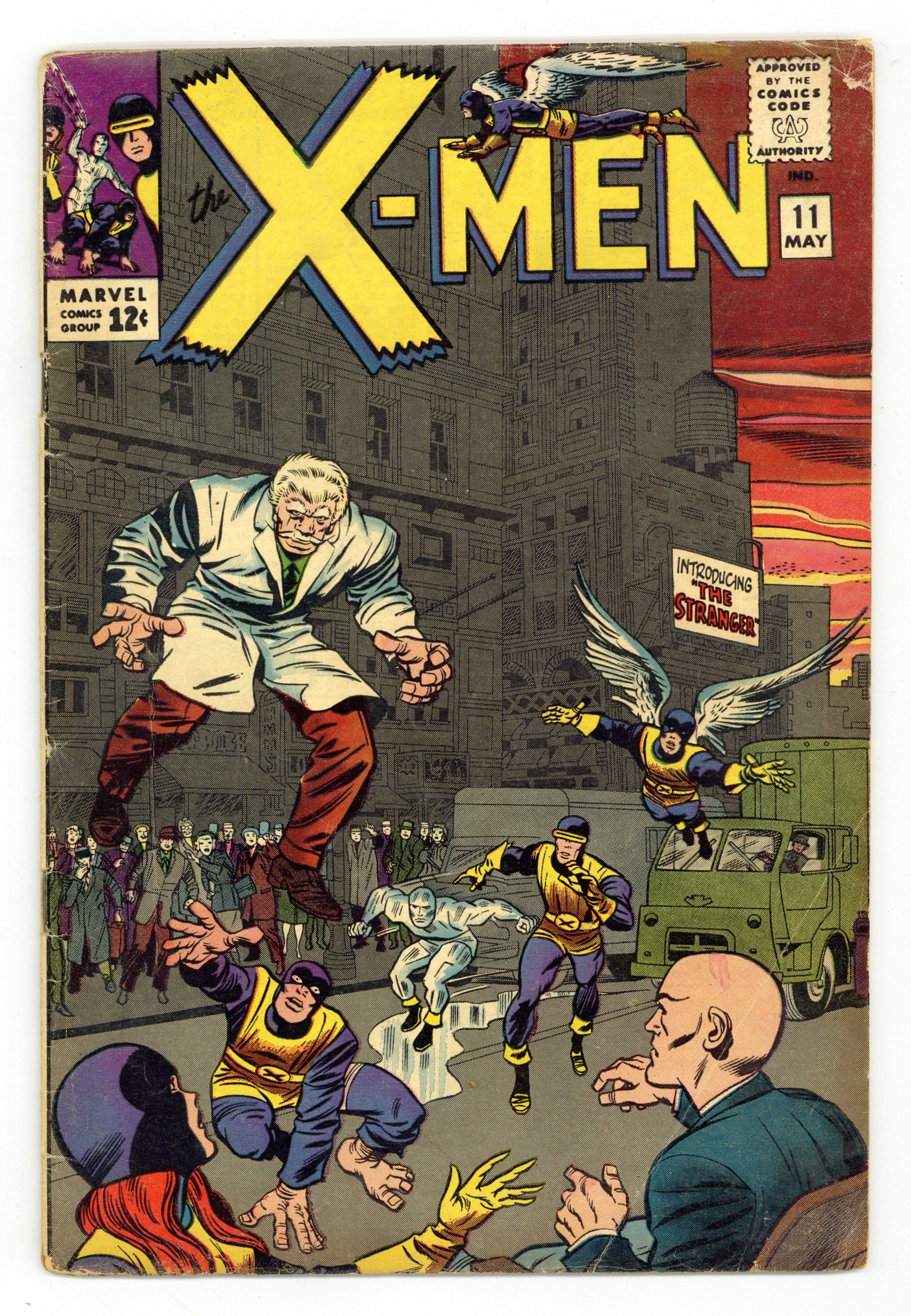 First appearance of the Stranger. Cover pencils by Jack Kirby, inks by Chic Stone. The Triumph of Magneto!, script by Stan Lee, pencils by Jack Kirby, inks by Chic Stone; Xavier detects an exteremely powerful entity that has arrived on earth and sends the X-Men to investigate; The Stranger tries to acclimate himself to earth customs but runs across Magneto and the Brotherhood; The X-Men arrive on the scene and battle the Brotherhood but the Stranger leaves with Magneto and Toad in the conflict; Without a leader, Quicksilver and the Scarlet Witch decide to return home to Central Europe; The X-Men encounter the Stranger once again and Xavier realizes he is an alien; The Stranger explains that he has been collecting mutants from across the universe and takes Magneto and Toad away with him into space. 36 pgs. $0.12. Cover price $0.12.