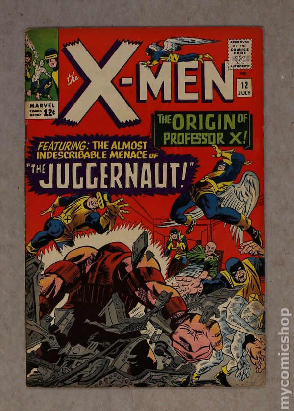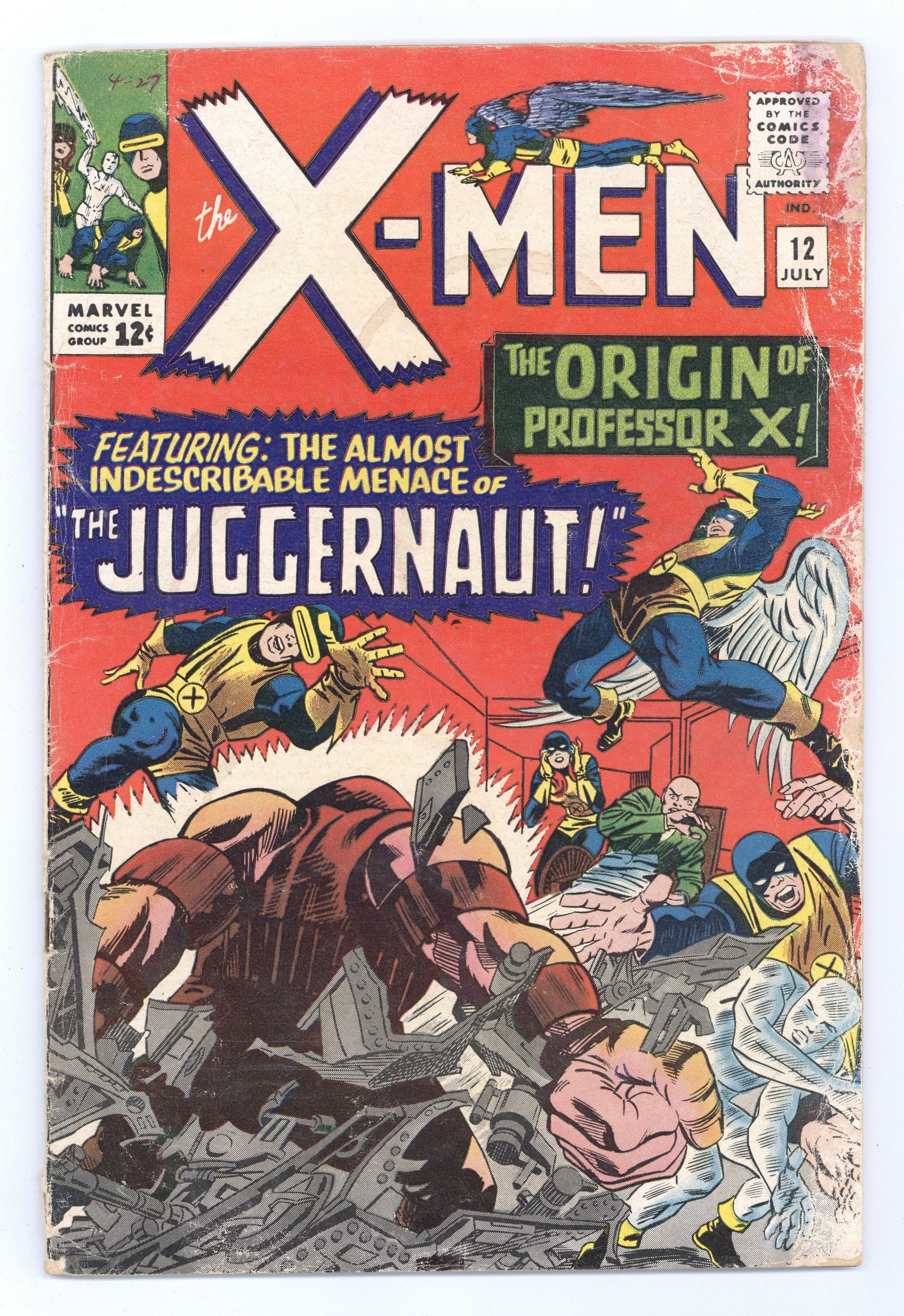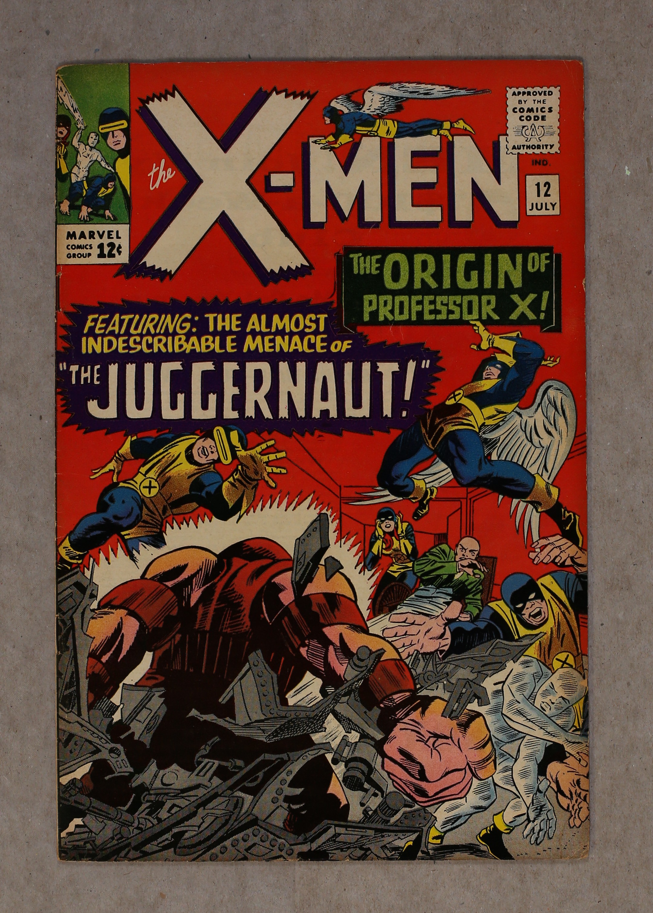 Cover pencils by Jack Kirby, inks by Frank Giacoia. The Origin of Professor X!, script by Stan Lee, pencils by Jack Kirby (layouts) and Alex Toth (pencils), inks by Vince Colletta; Cerebro detects a powerful mutant and Xavier fears that he knows who it is; The X-Men prepare the mansion for an all out assault; As the mysterious villain batters his way through the mansion's defenses, Professor X tells his students his origin story and how his step-brother changed from tormenting bully to an unstoppable Juggernaut; 1st appearance of the Juggernaut. 36 pgs. $0.12. Cover price $0.12.