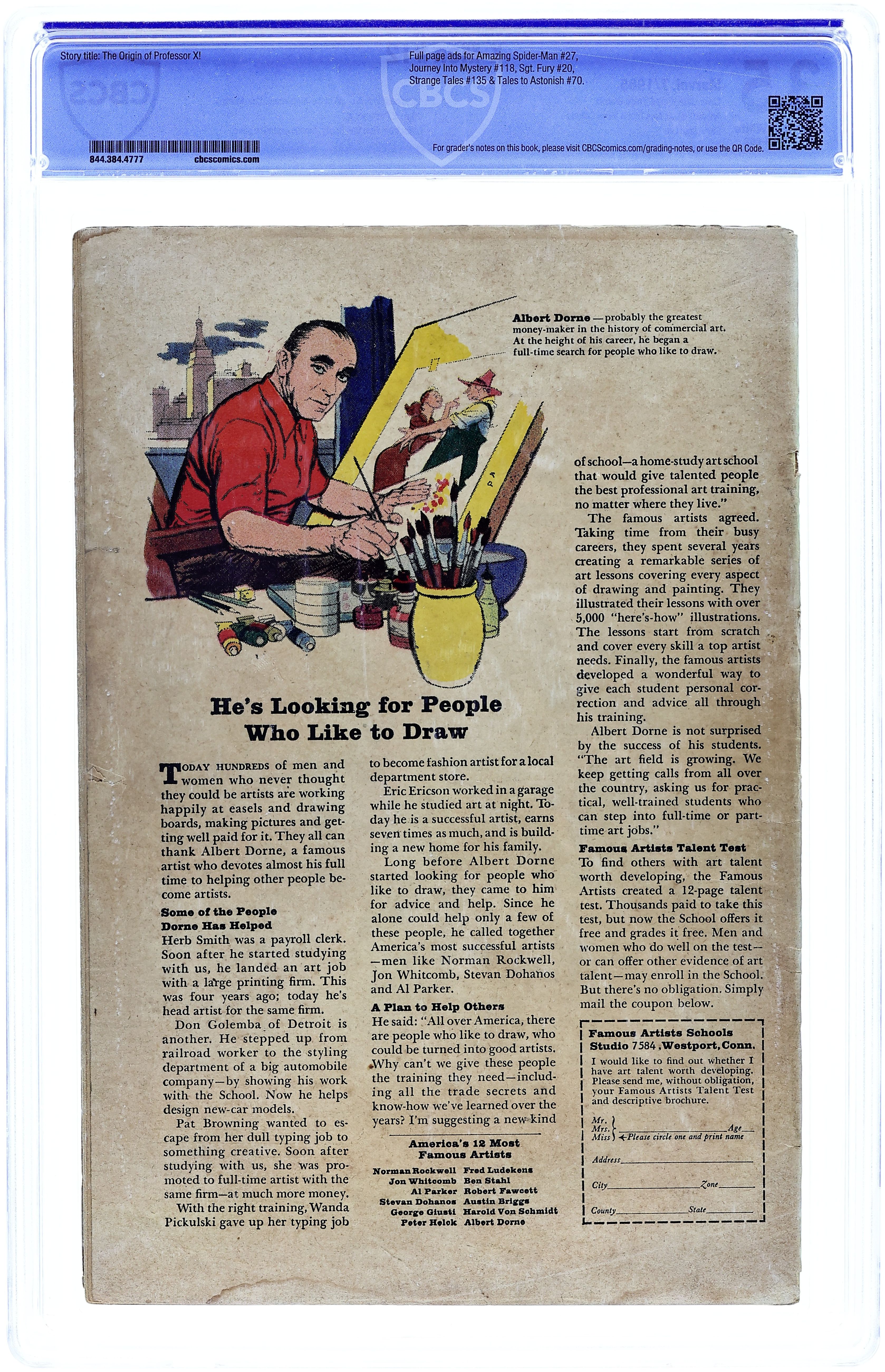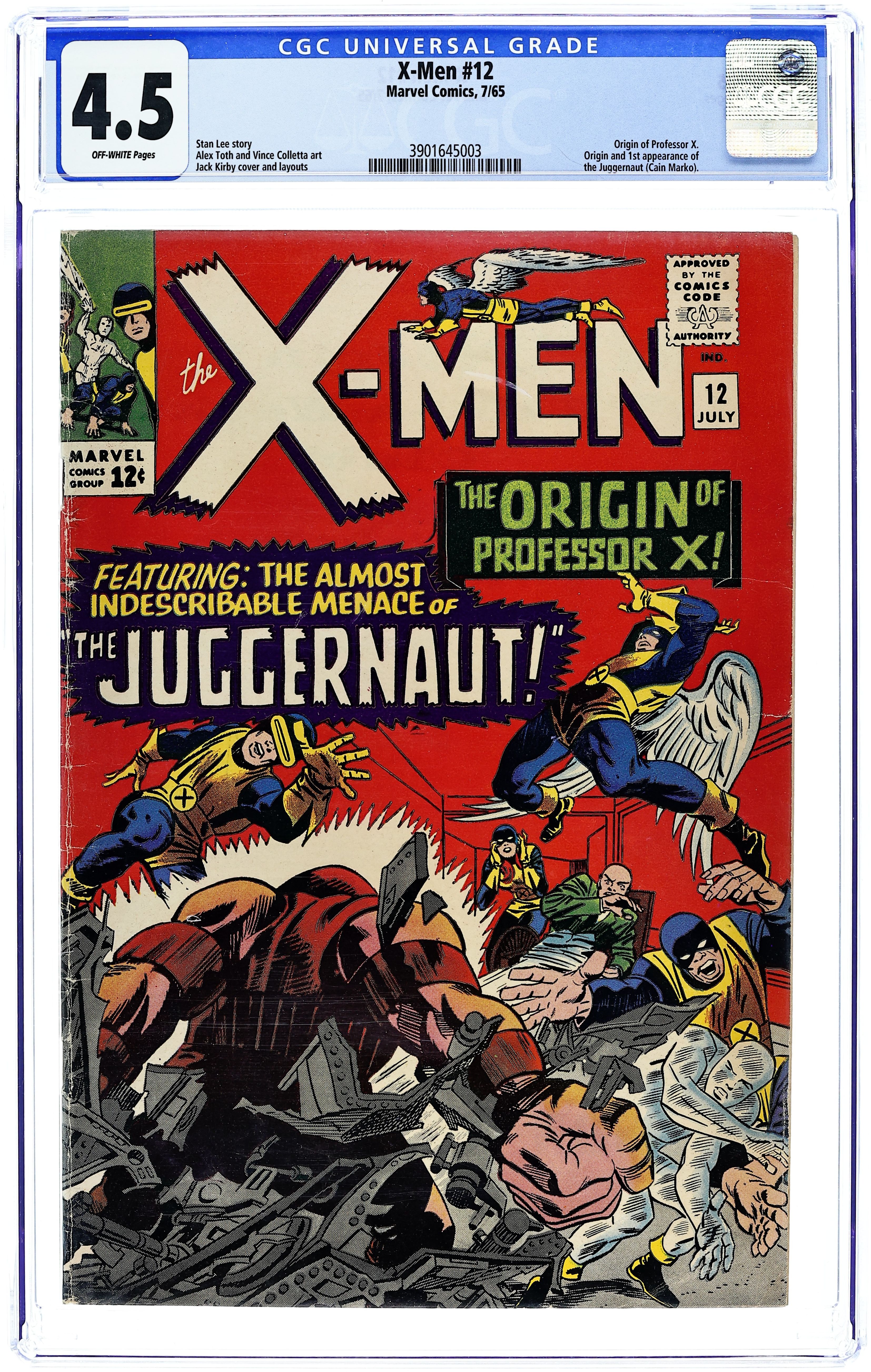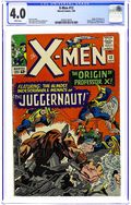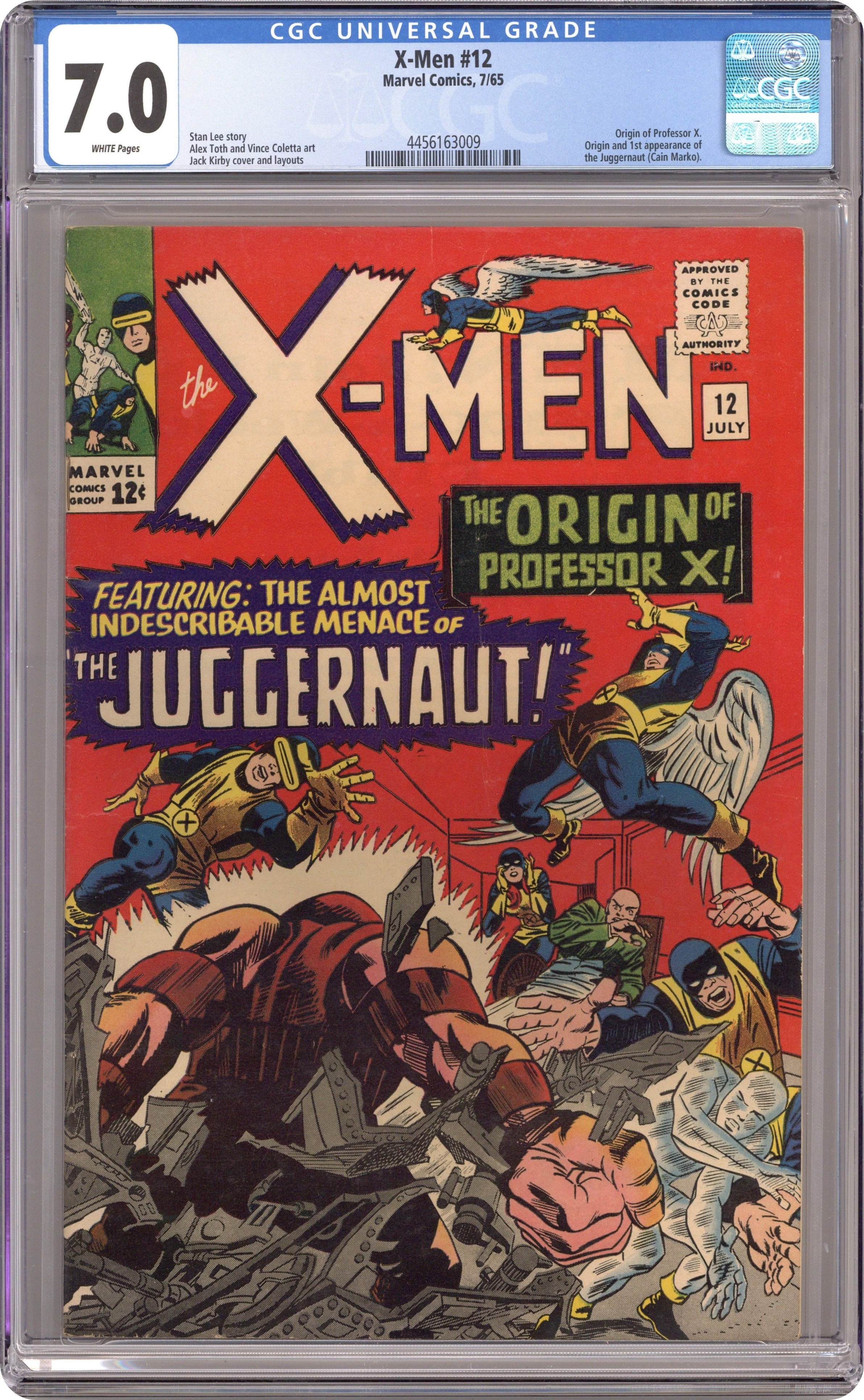 Cover pencils by Jack Kirby, inks by Frank Giacoia. The Origin of Professor X!, script by Stan Lee, pencils by Jack Kirby (layouts) and Alex Toth (pencils), inks by Vince Colletta; Cerebro detects a powerful mutant and Xavier fears that he knows who it is; The X-Men prepare the mansion for an all out assault; As the mysterious villain batters his way through the mansion's defenses, Professor X tells his students his origin story and how his step-brother changed from tormenting bully to an unstoppable Juggernaut; 1st appearance of the Juggernaut. 36 pgs. $0.12. Cover price $0.12.