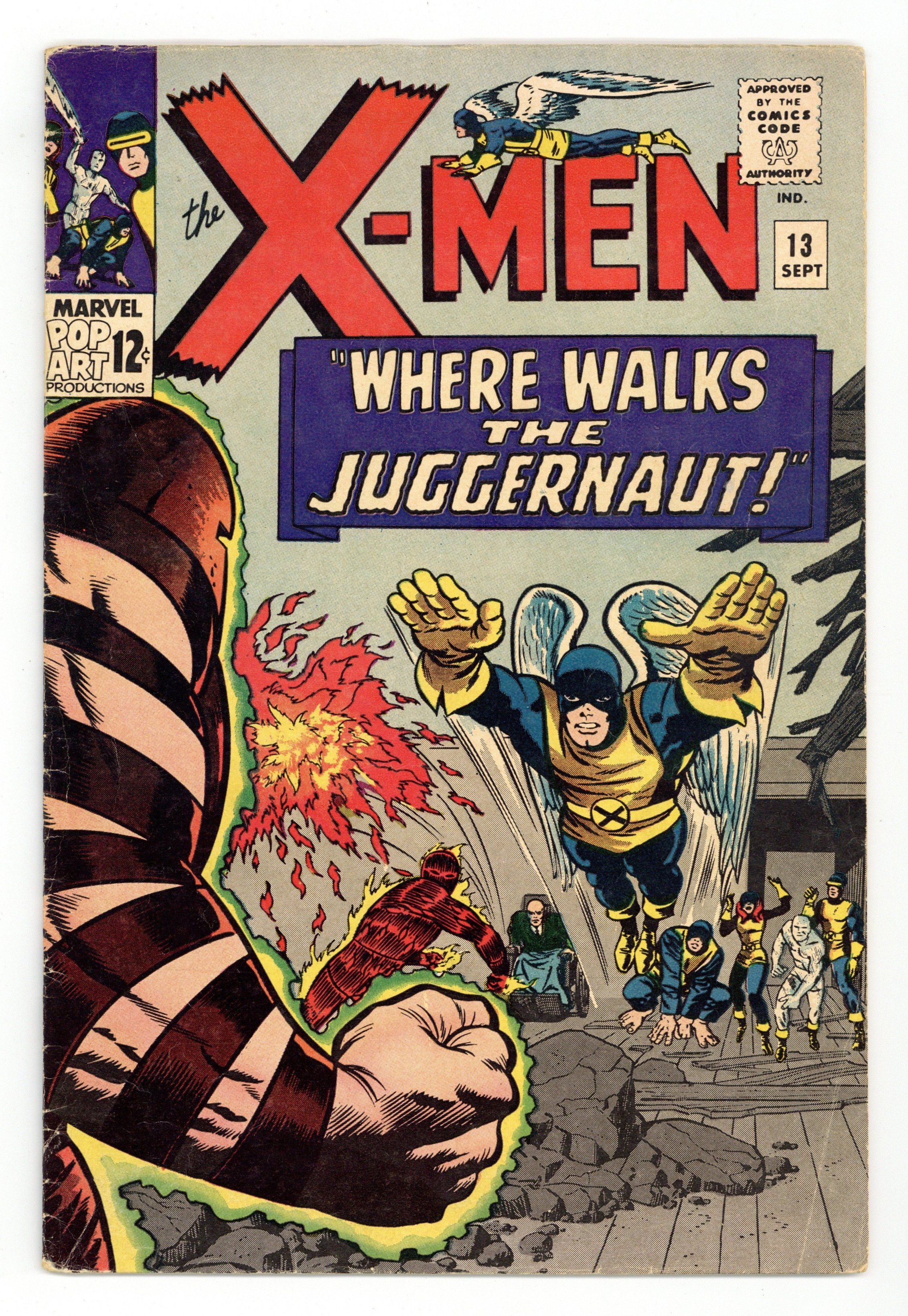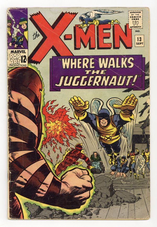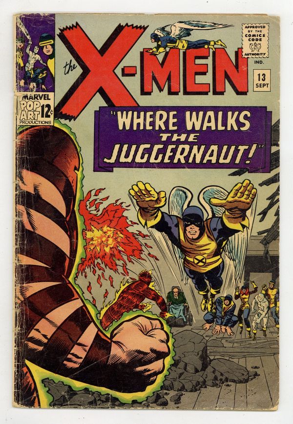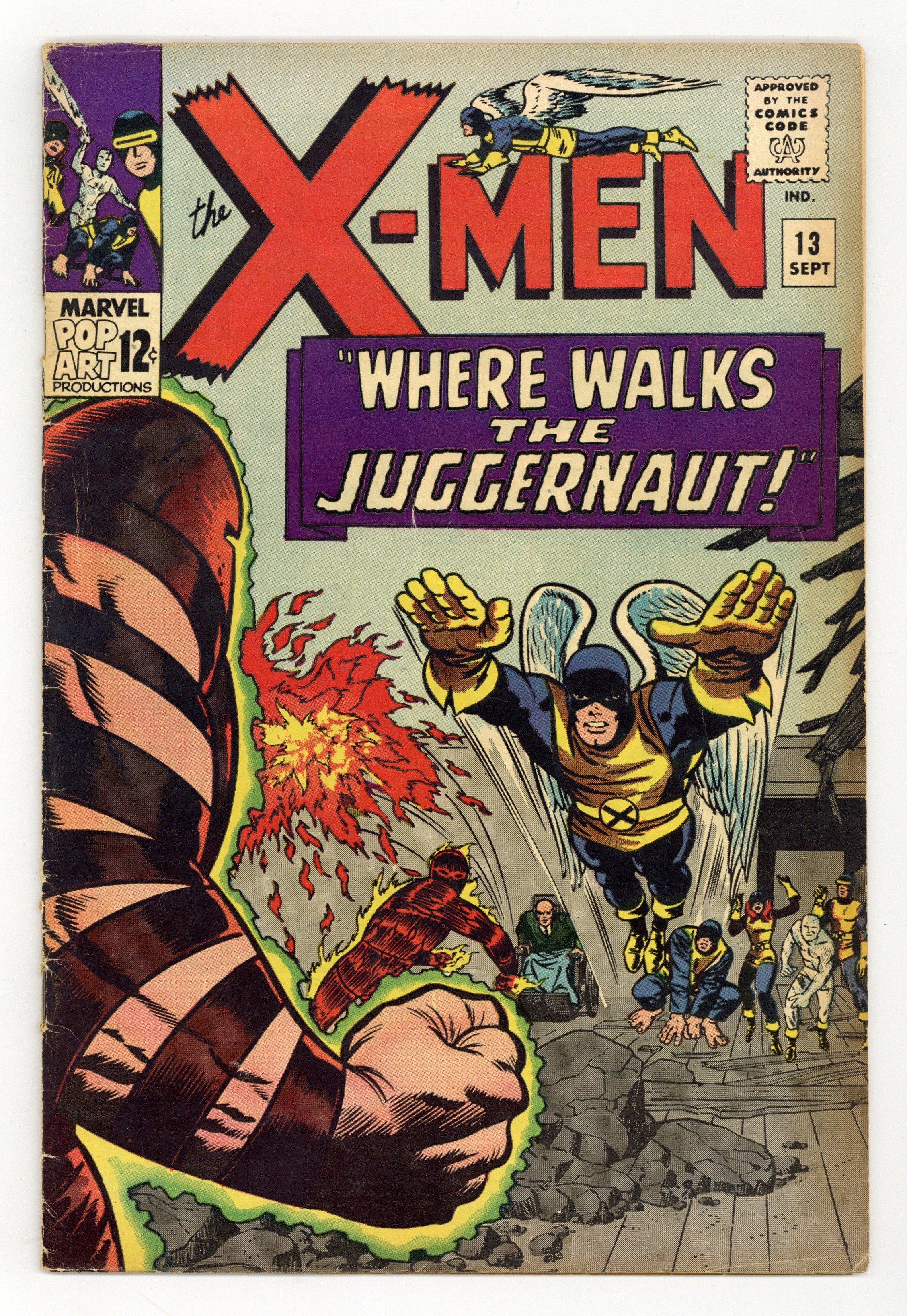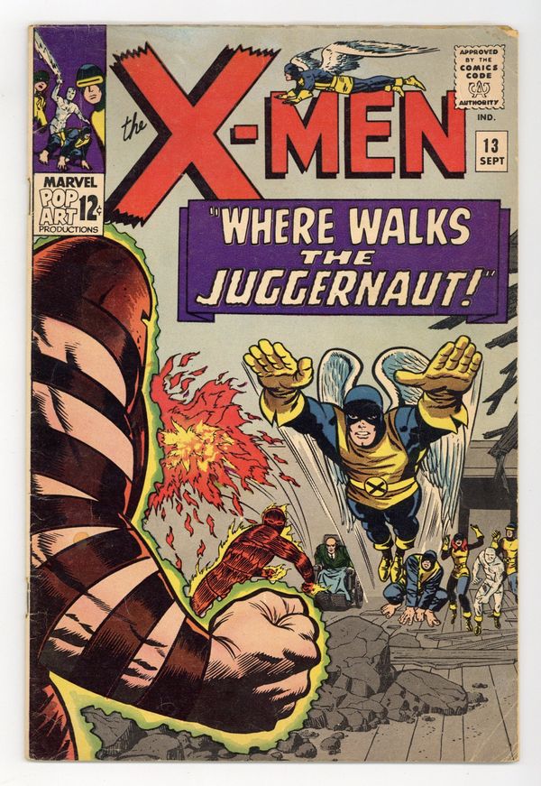 Cover pencils by Jack Kirby, inks by Joe Sinnott. Where Walks the Juggernaut!, script by Stan Lee, pencils by Jack Kirby (layouts) and Werner Roth [as Jay Gavin], inks by Joe Sinnott; Juggernaut has invaded the mansion and the X-Men struggle to take down Xavier's unstoppable half-brother; Human Torch lends a hand and Professor X is able to bring his brother down. 36 pgs. $0.12. Cover price $0.12.