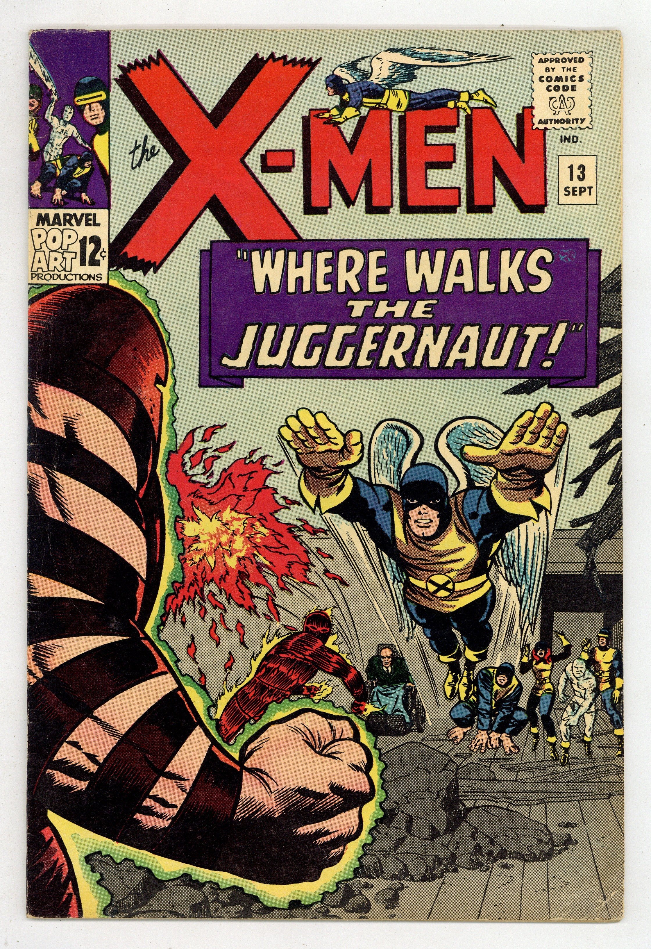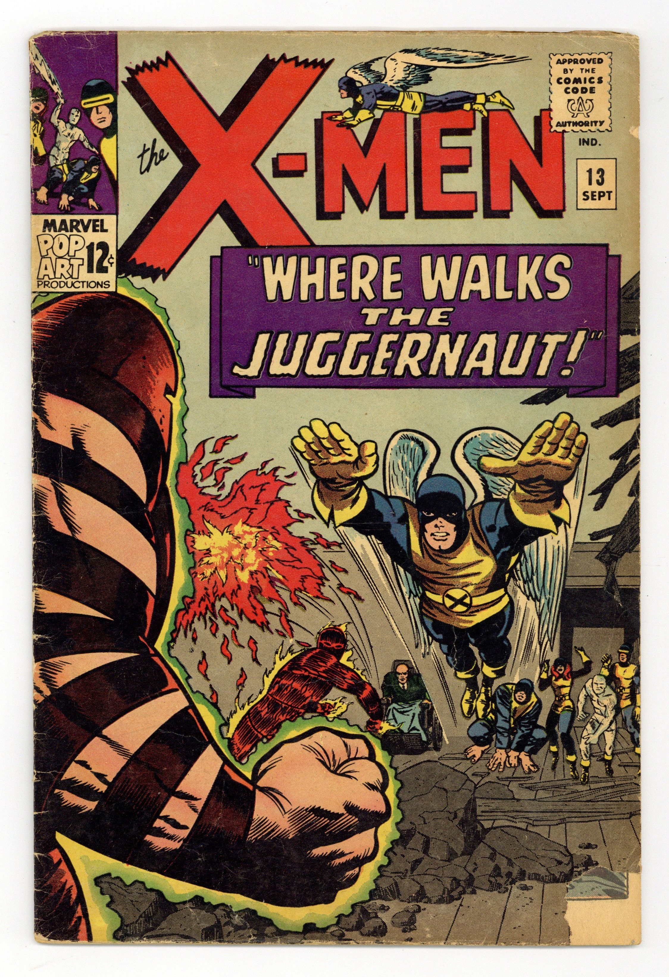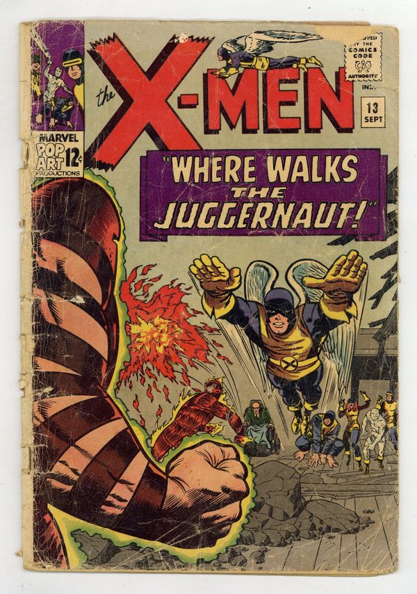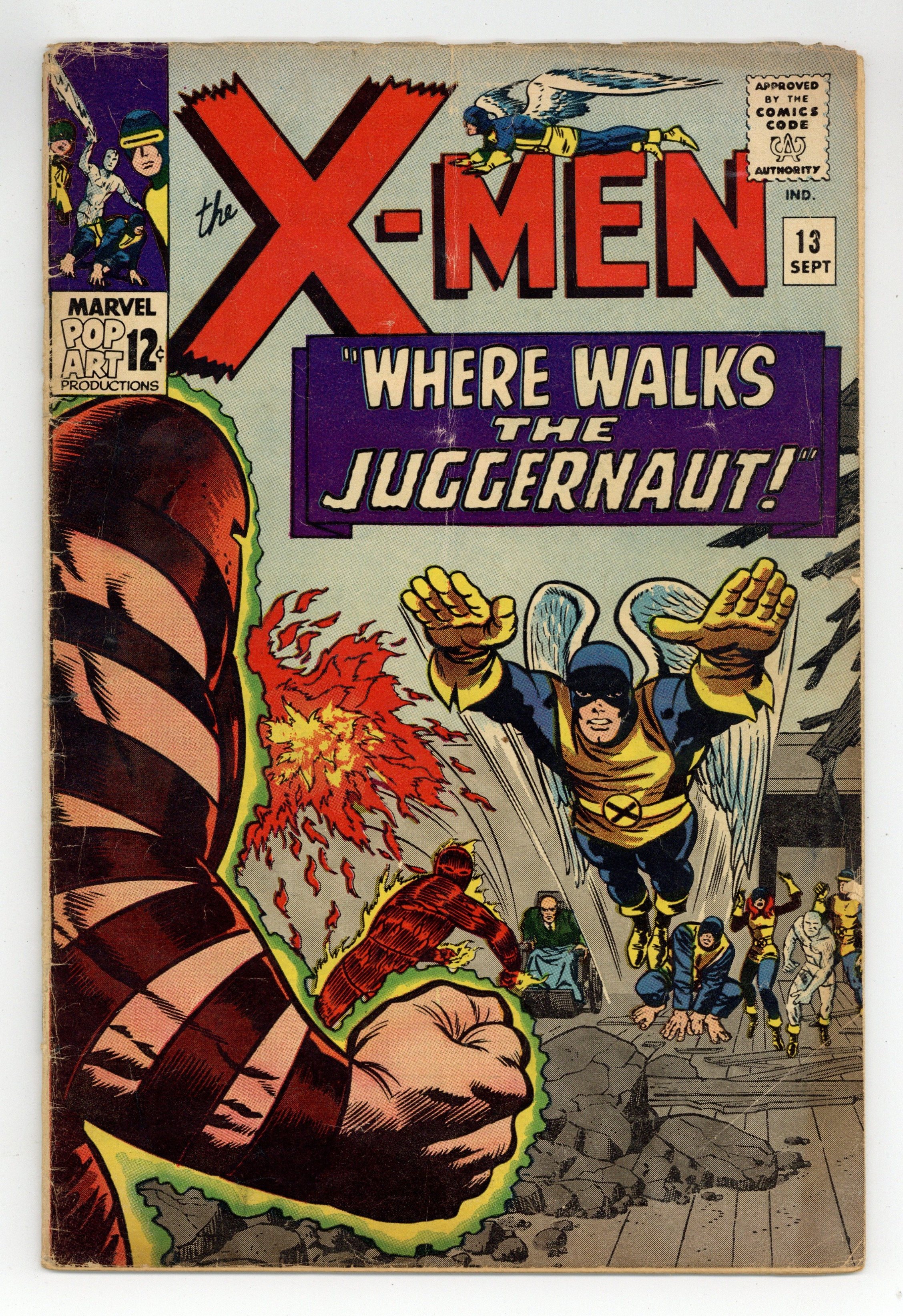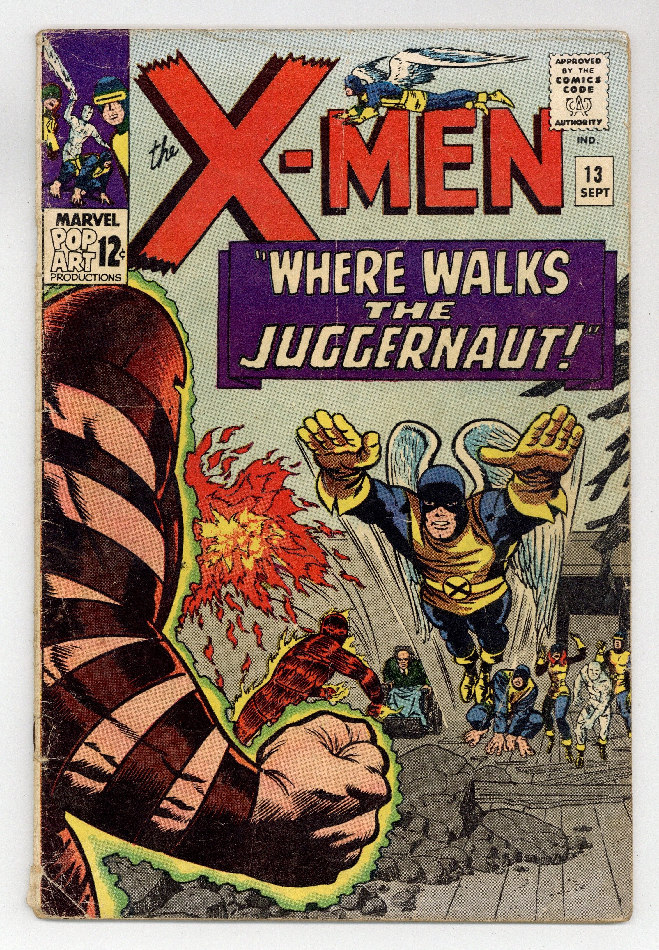 Cover pencils by Jack Kirby, inks by Joe Sinnott. Where Walks the Juggernaut!, script by Stan Lee, pencils by Jack Kirby (layouts) and Werner Roth [as Jay Gavin], inks by Joe Sinnott; Juggernaut has invaded the mansion and the X-Men struggle to take down Xavier's unstoppable half-brother; Human Torch lends a hand and Professor X is able to bring his brother down. 36 pgs. $0.12. Cover price $0.12.