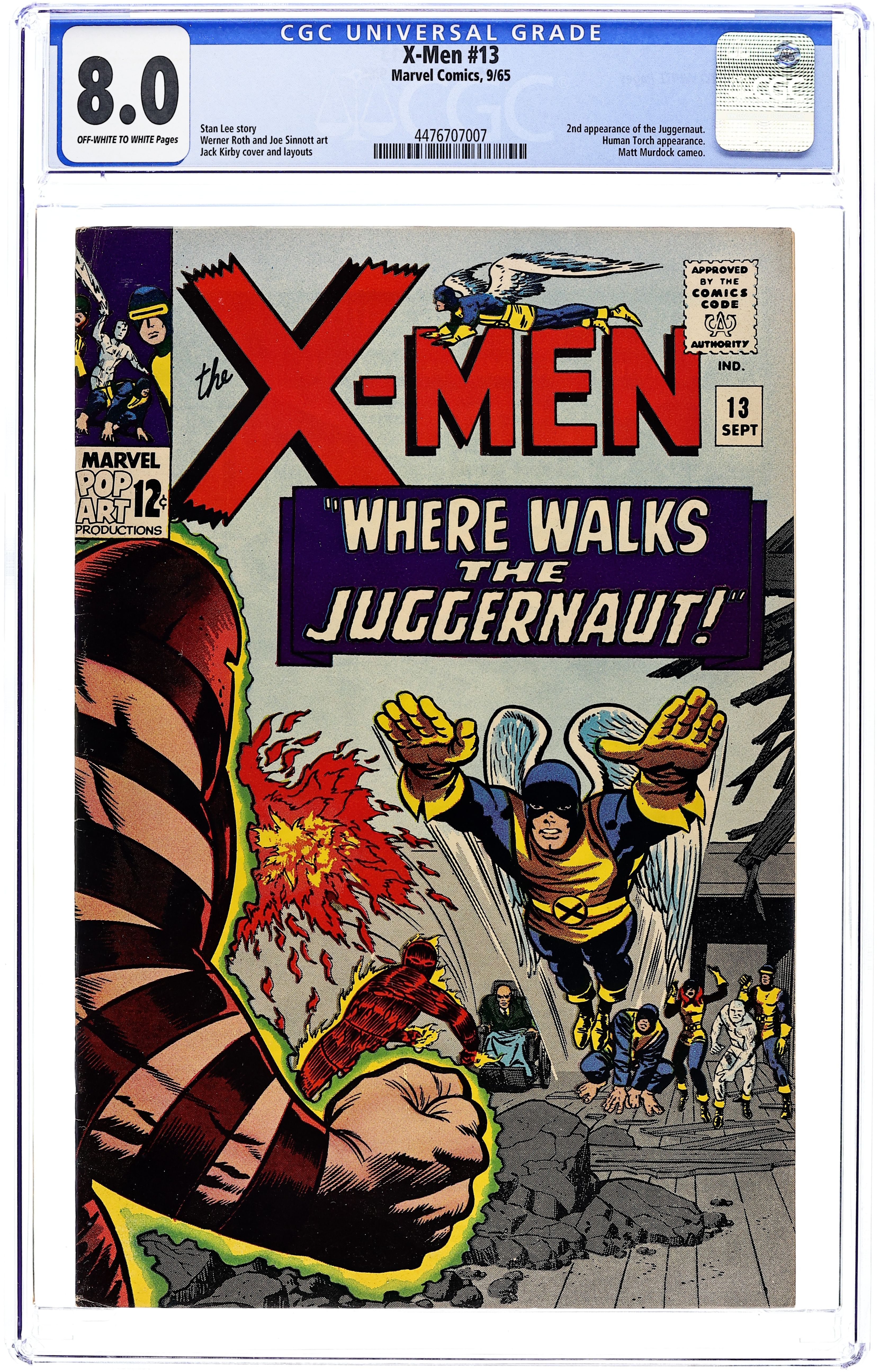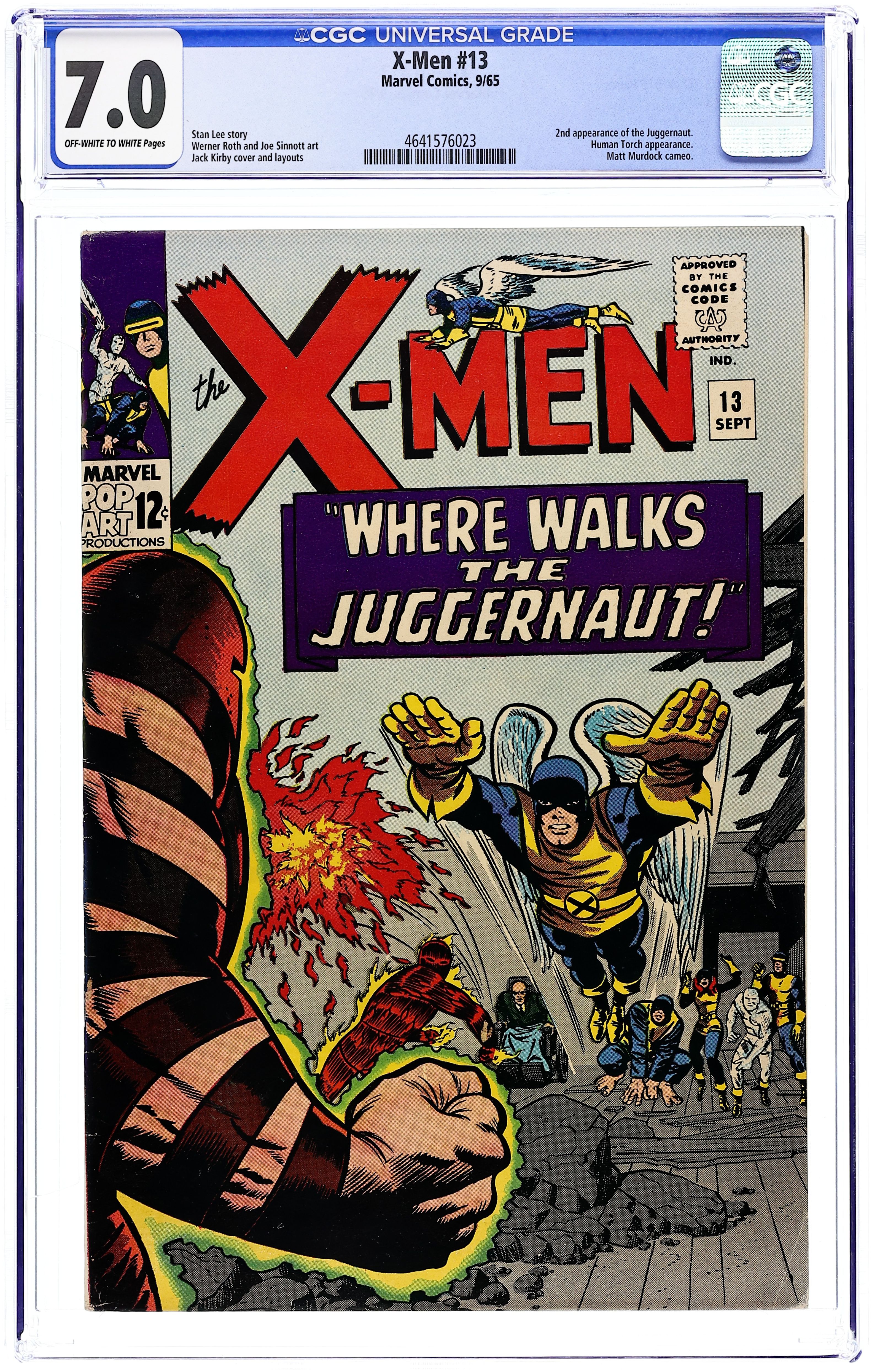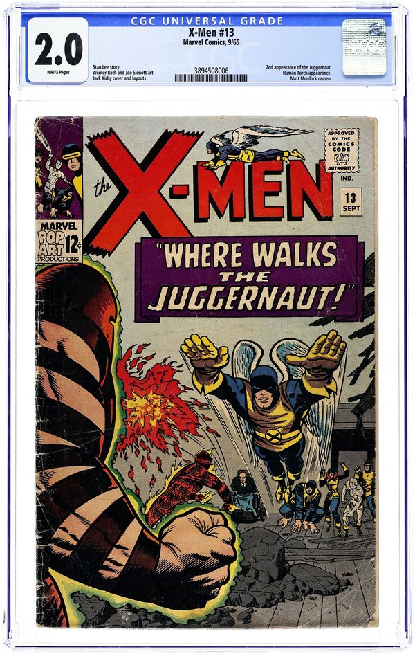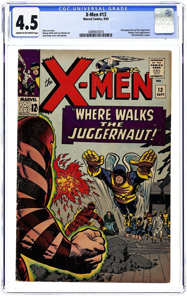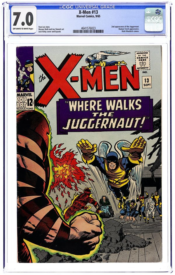 Cover pencils by Jack Kirby, inks by Joe Sinnott. Where Walks the Juggernaut!, script by Stan Lee, pencils by Jack Kirby (layouts) and Werner Roth [as Jay Gavin], inks by Joe Sinnott; Juggernaut has invaded the mansion and the X-Men struggle to take down Xavier's unstoppable half-brother; Human Torch lends a hand and Professor X is able to bring his brother down. 36 pgs. $0.12. Cover price $0.12.