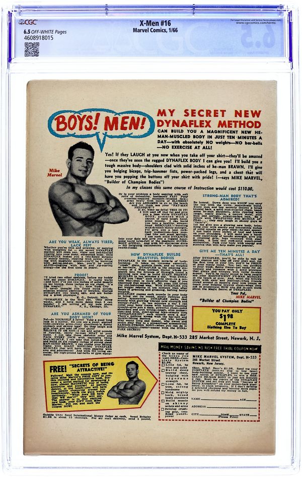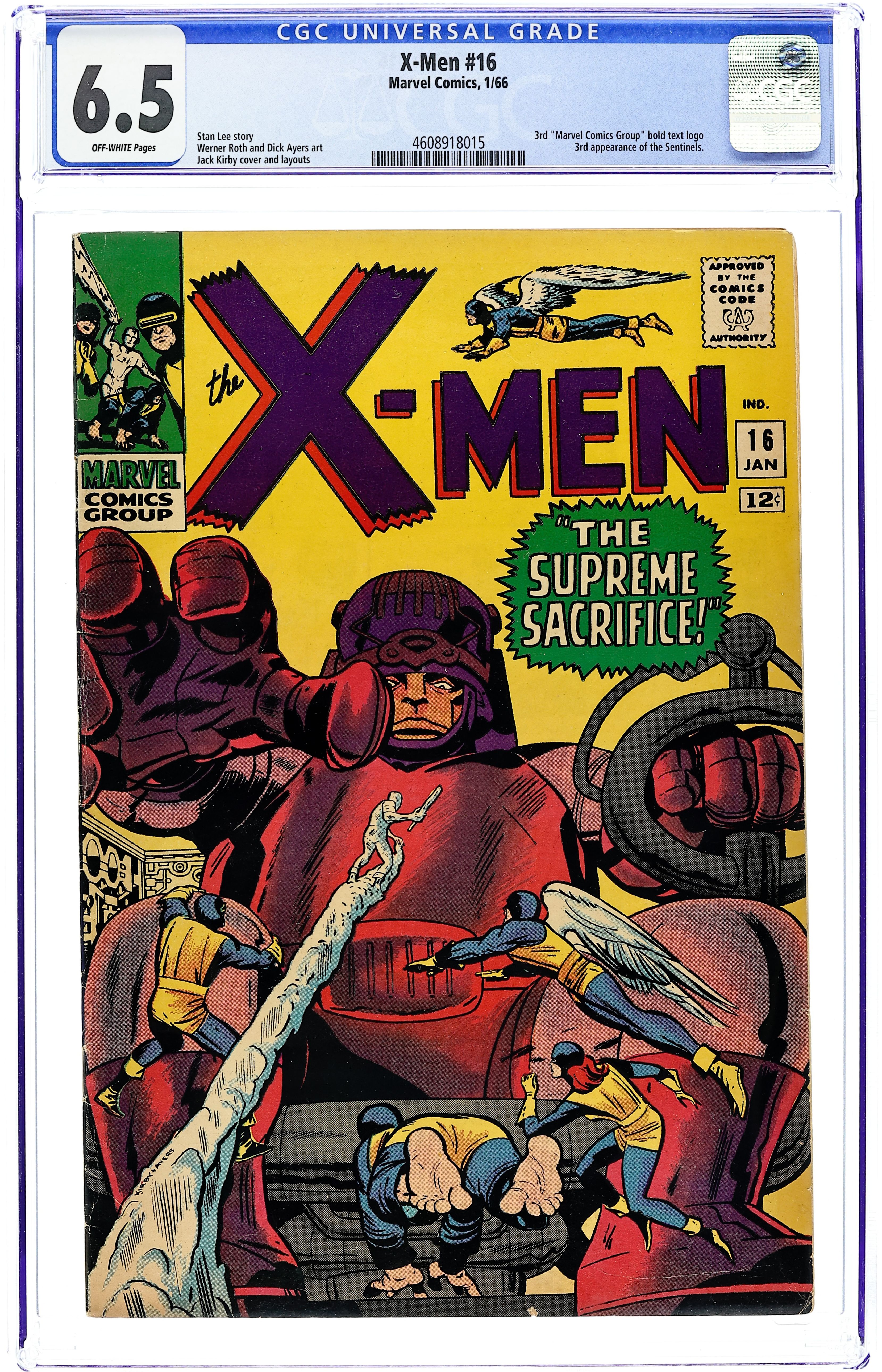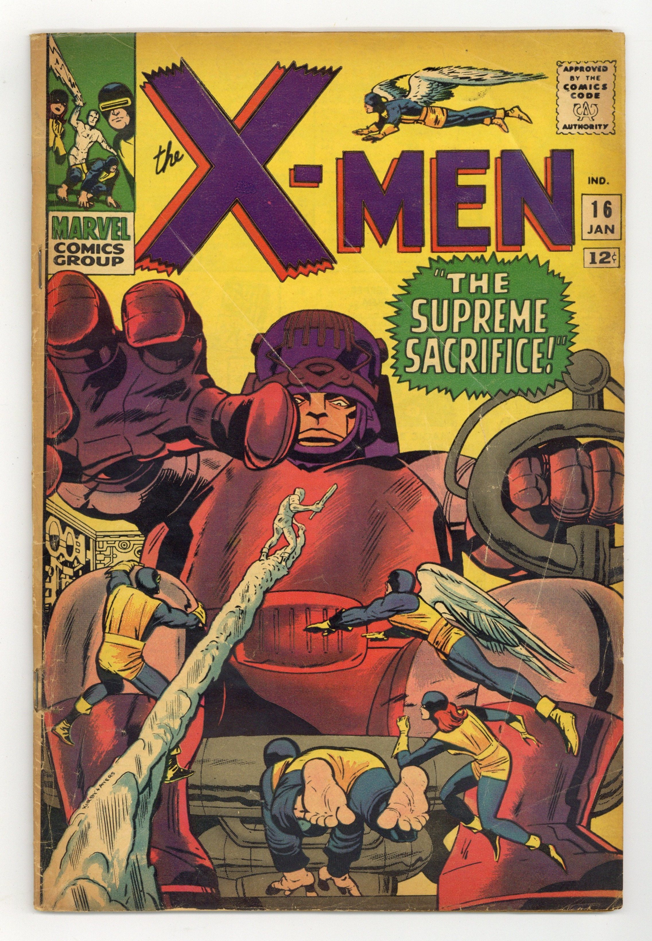 Cover pencils by Jack Kirby, inks by Dick Ayers. The Supreme Sacrifice!, script by Stan Lee, pencils by Jack Kirby (layouts) and Werner Roth [as Jay Gavin] (pencils), inks by Dick Ayers; With the X-Men captured, Xavier heads back to investigate a fallen Sentinel to try and figure out what stopped it; The X-Men escape and battle the Sentinels but it is the timely intervention of Professor X and the self sacrifice of Dr. Trask that stops Master Mold and saves the day. 36 pgs. $0.12. Cover price $0.12.