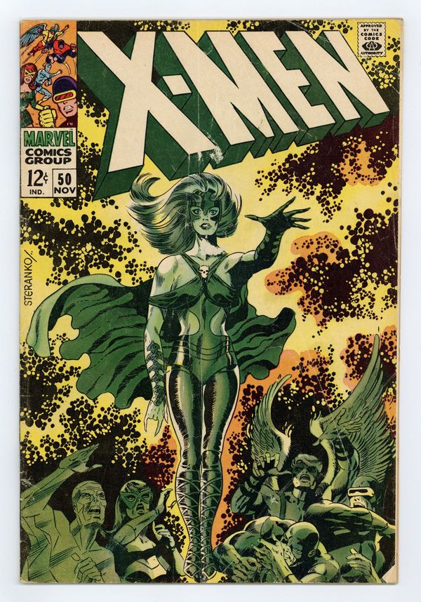 Ends Apr 15 8:47 PM CST Bid History 9 bids Current Bid $280 Your Secret Max Bid If you'd like to bid, please log in or register. Cover art by Jim Steranko. City of Mutants, script by Arnold Drake, pencils by Jim Steranko, inks by John Tartaglione; Mesmero captures Lorna Dane and Iceman; Mesmero tells everyone that Lorna Dane is Magneto's daughter. This Boy--This Bombshell!--The Origins of the Uncanny X-Men, script by Arnold Drake, pencils by Werner Roth, inks by John Verpoorten; the story of young Hank McCoy. 36 pgs. $0.12. Cover price $0.12.
