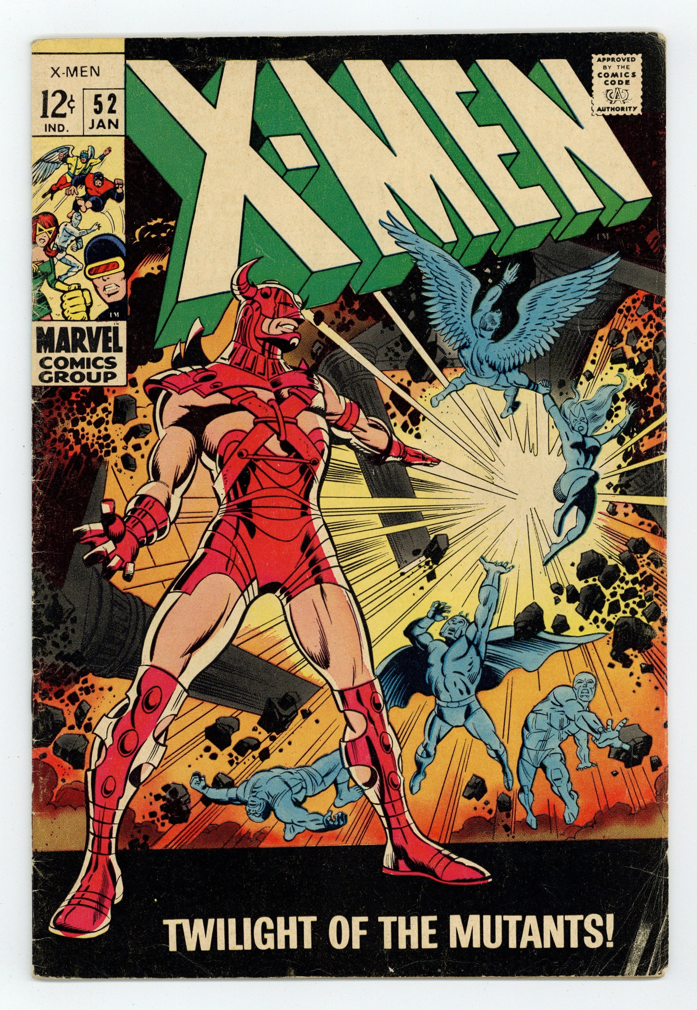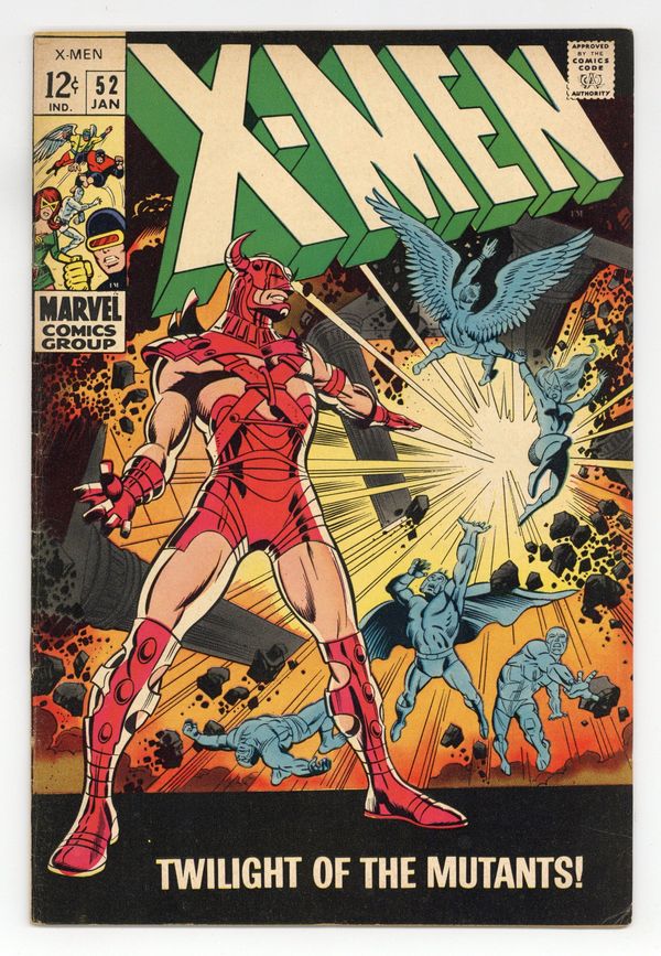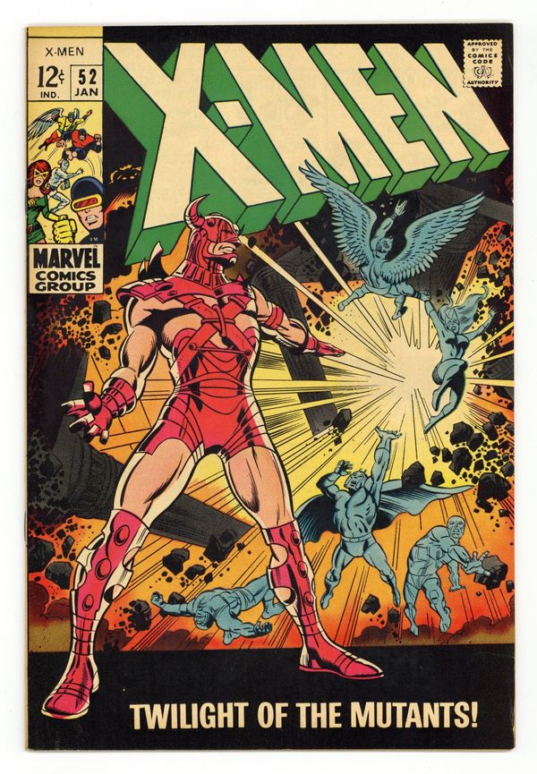 Cover pencils by Marie Severin, inks by Joe Sinnott. Twilight of the Mutants!, script by Arnold Drake, pencils by Don Heck and Werner Roth, inks by John Tartaglione; Eric the Red attacks Mesmero and his army; Eric defeats Mesmero and heads toward Magneto, who is injured; Marvel Girl, Angel, and Beast break into Mesmero's headquarters; Iceman gets caught in trap intended for Mesmero. The Crimes of the Conquistador!--The Origins of the Uncanny X-Men, script by Arnold Drake, pencils by Werner Roth, inks by John Verpoorten; Beast's origin continued. 36 pgs. $0.12. Cover price $0.12.