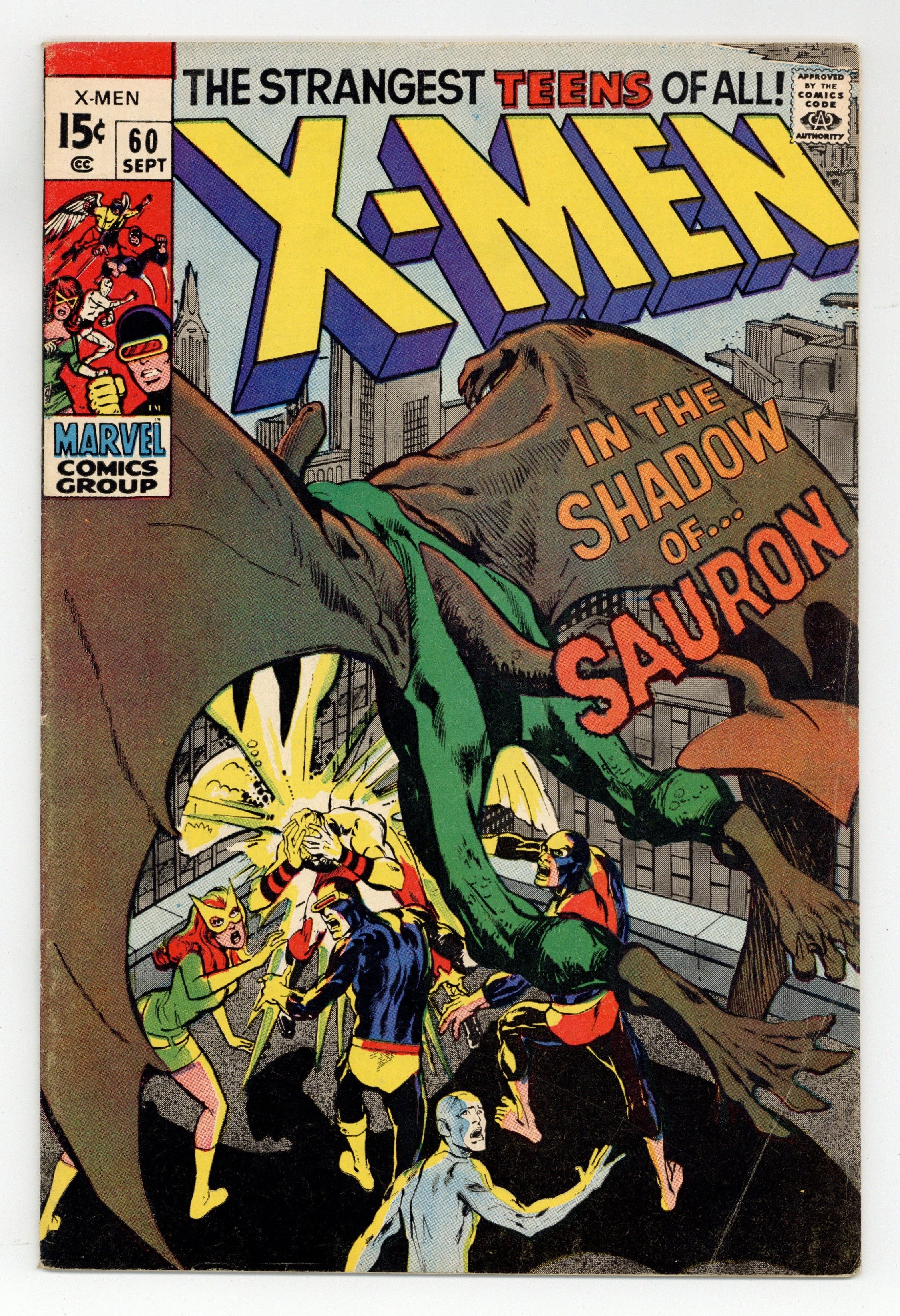 1st Printing. 1st appearance of Sauron. Cover pencils by Neal Adams. In the Shadow of...Sauron!, script bny Roy Thomas, pencils by Neal Adams, inks by Tom Palmer, colors by Neal Adams; The X-Men take an injured Havok to be treated by one of Xavier's old buddies, Dr. Karl Lykos; Lykos is an energy vampire and drains mutant life energy from Havok, turning himself into the evil Sauron; Angel takes off to investigate the flying dinosaur and is hypnotized by Sauron's powers. Letter from comics creator Don McGregor. 36 pages, full color. NOTE: JC Penney reprint exits. Can be identified by having X-Men on Video ad on back cover. Cover price $0.15.