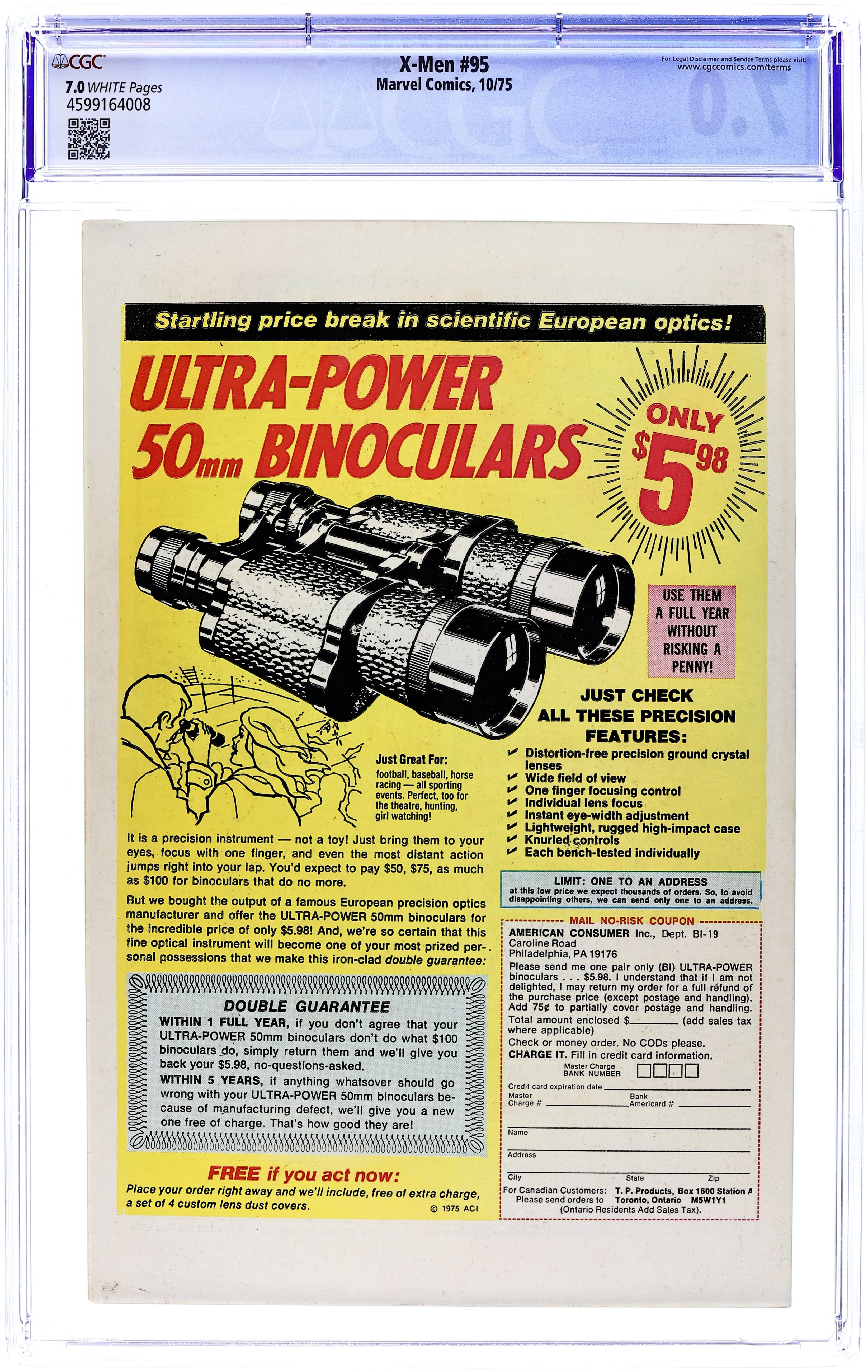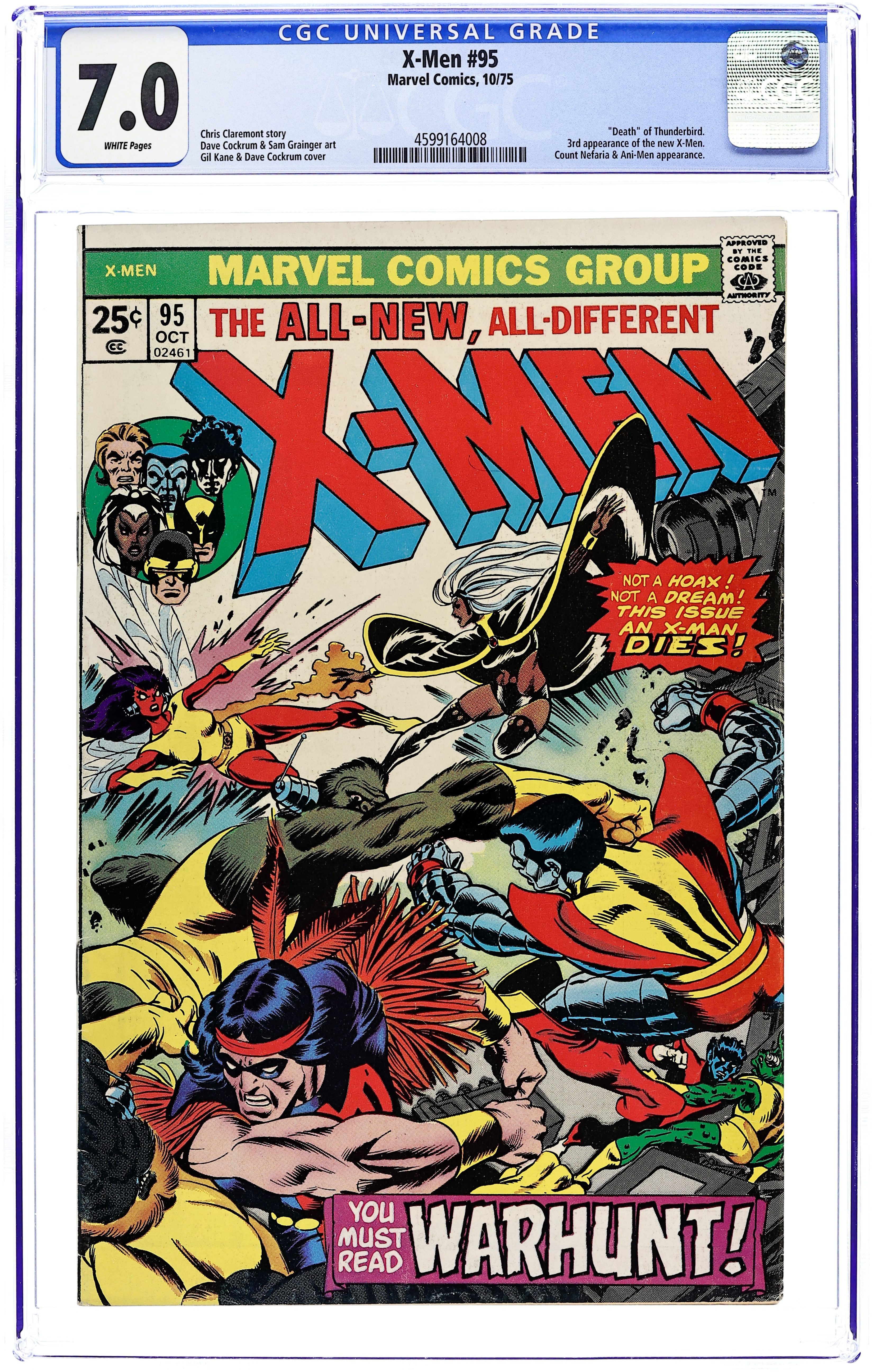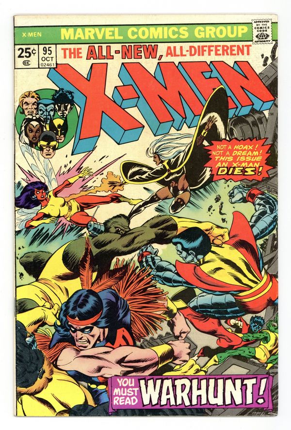 "Warhunt!" Part 2 of 2. Story by Chris Claremont and Len Wein. Art by Dave Cockrum and Sam Grainger. Cover by Gil Kane. In order to stop the sinister madman Count Nefaria from raining nuclear Armageddon down upon the world, the new X-Men must fight their way through the Count's mutated bodyguards - the Ani-Men! Plus, one X-Man makes the ultimate sacrifice! NOTE: Death of Thunderbird I. 36 pgs. Cover price $0.25.
