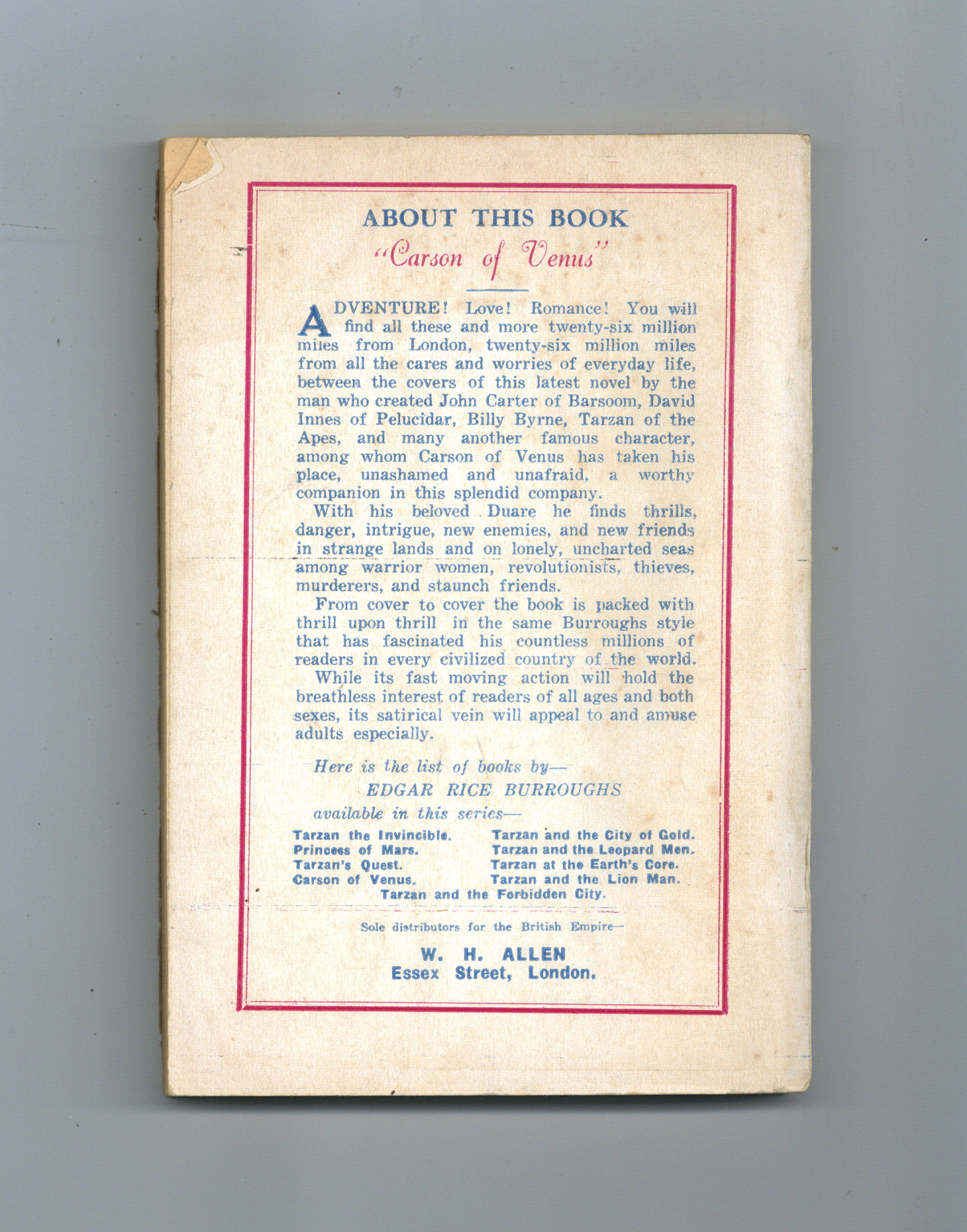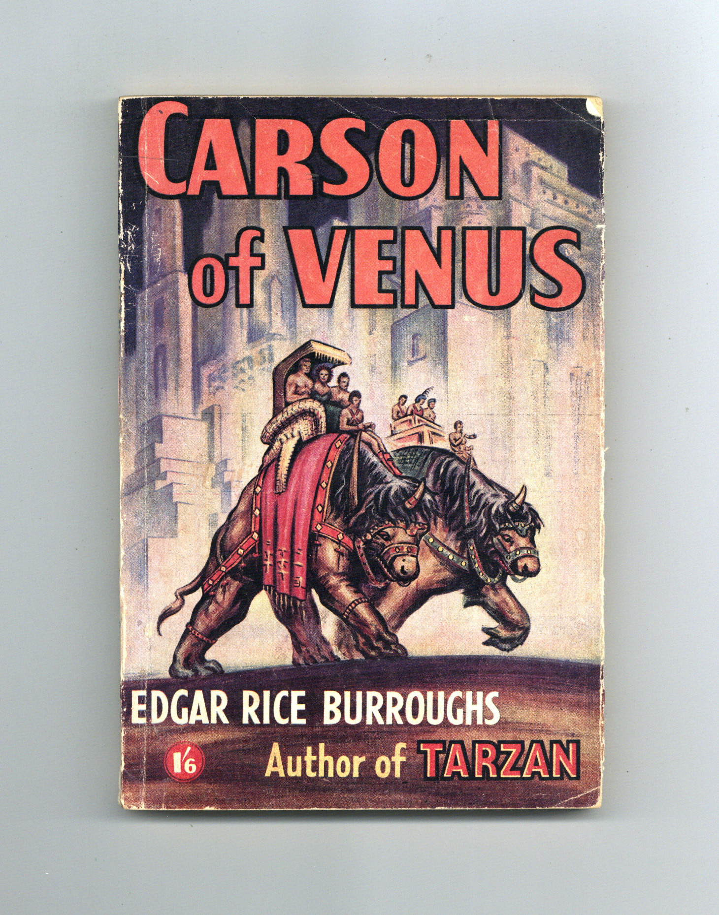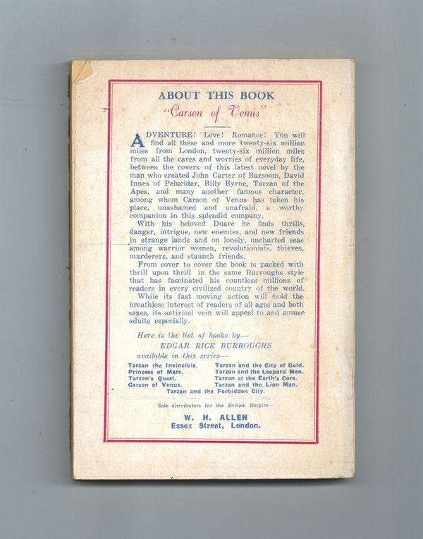 First printing, 1950. UK edition. Written by Edgar Rice Burroughs. Cover by John Coleman Burroughs. Novel of Carson Napier's adventures on Venus with the lovely Duare by his side. 5-in. x 7 1/4-in., 136 pages, B&W.