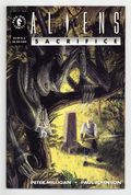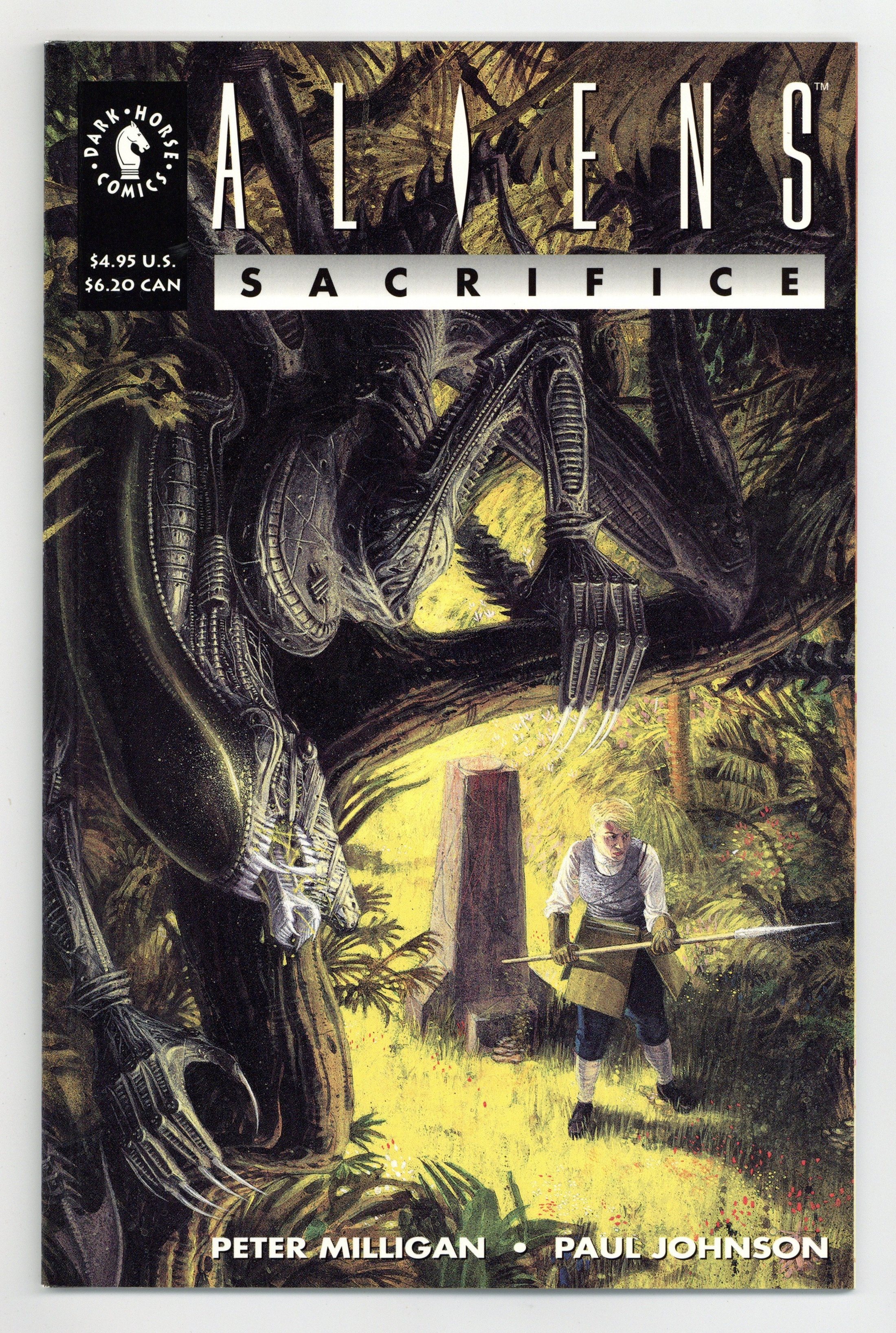 Written by PETER MILLIGAN. Art & cover by PAUL JOHNSON. Collecting the story originally serialized in Dark Horse UK's Aliens title, Aliens: Sacrifice is a one-shot presenting perhaps the most emotionally powerful Aliens tale you will ever read. Stranded on an isolated planet, Ann McKay takes shelter in a remote village that is being terrorized by an Alien. She soon discovers that its inhabitants are hiding a horrifying secret from her. But to discover the truth she has to face her own innermost demons...and try to save the souls of the villagers at the same time! Cover price $4.95.