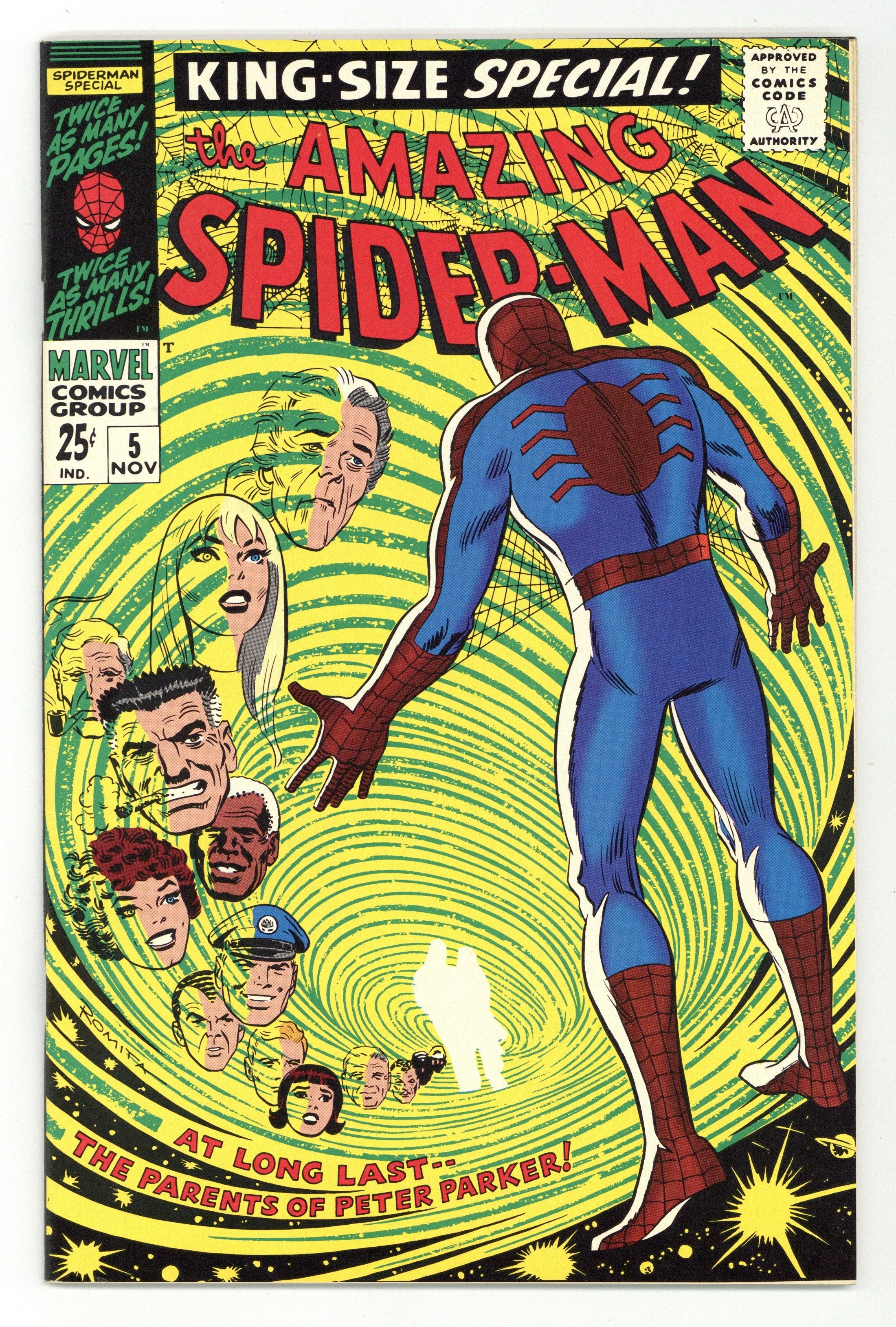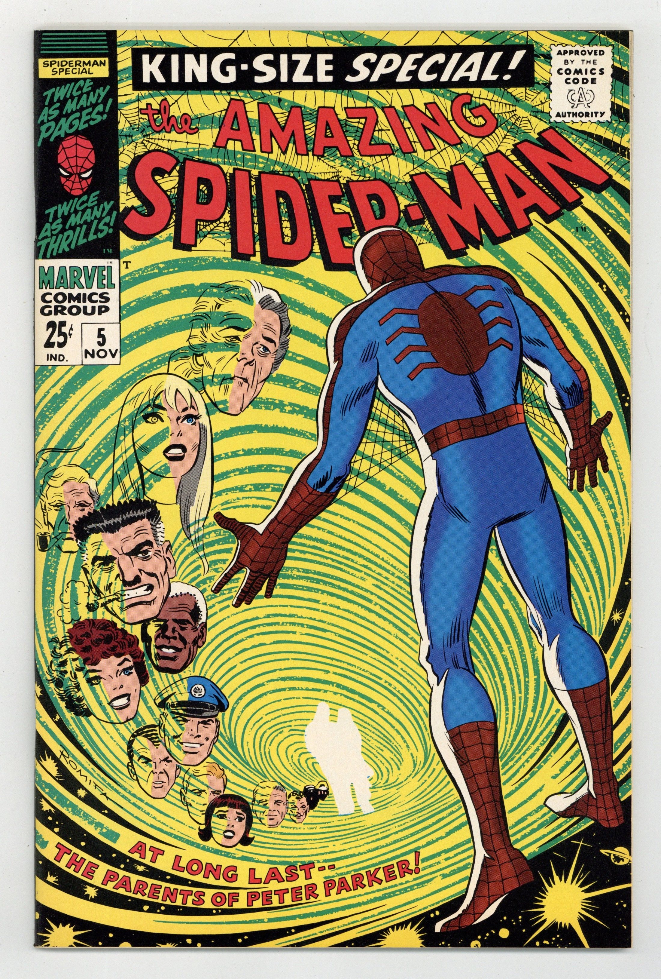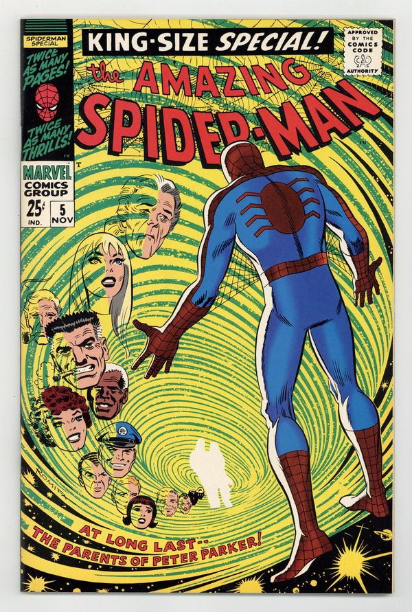 1993 reprint available only through JC Penney. Full color, 68 pages, standard paper stock. First appearance of Peter Parker's parents in a new 40-page story, "The Parents of Peter Parker!" Script by Stan Lee, pencils by Larry Lieber, inks by Mickey Demeo, "consulting" by John Romita Sr. Guest starring the Red Skull; Fantastic Four cameo. 3-page back-up story, "Here We Go-a-Plotting!" starring Lee, Lieber, and Romita. NOTE: Has low print run. Can be identified by having a Stridex ad on back cover. Cover price $0.25.