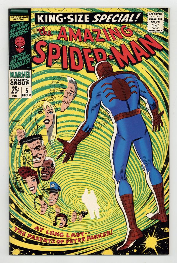 $21.001993 reprint available only through JC Penney. Full color, 68 pages, standard paper stock. First appearance of Peter Parker's parents in a new 40-page story, "The Parents of Peter Parker!" Script by Stan Lee, pencils by Larry Lieber, inks by Mickey Demeo, "consulting" by John Romita Sr. Guest starring the Red Skull; Fantastic Four cameo. 3-page back-up story, "Here We Go-a-Plotting!" starring Lee, Lieber, and Romita. NOTE: Has low print run. Can be identified by having a Stridex ad on back cover. Cover price $0.25.