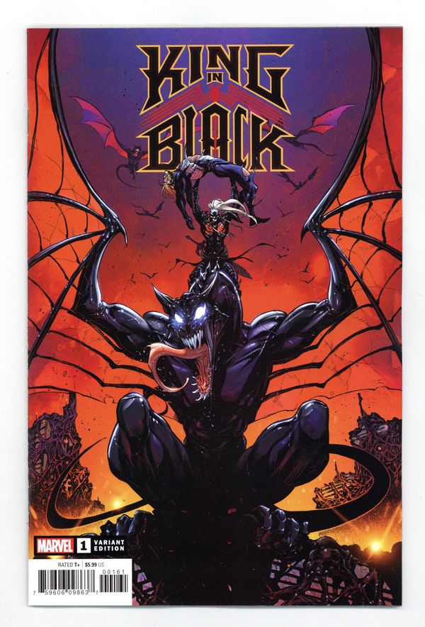 Tags: King in Black (part 1)$11.00Limited 1 for 50 Retailer Incentive Variant Cover. Written by Donny Cates. Art by Ryan Stegman and JP Mayer. Cover by Iban Coello. DARKNESS REIGNS! After a campaign across the galaxy, Knull's death march arrives to Earth and, worse yet, he hasn't come alone! With an army of hundreds of thousands of symbiote dragons at his command, the King in Black is a force unlike any Earth's heroes have ever faced. EDDIE BROCK, A.K.A. VENOM has seen firsthand the chaos that even one of Knull's symbiotic monsters can wreak - will he survive an encounter with the God of the Abyss himself? From Donny Cates, Ryan Stegman, JP Mayer, Frank Martin and VC's Clayton Cowles comes the definitive chapter in their two-year-long VENOM saga that changed everything you thought you knew about symbiotes! 56 pages, full color . Rated T+ Cover price $5.99.