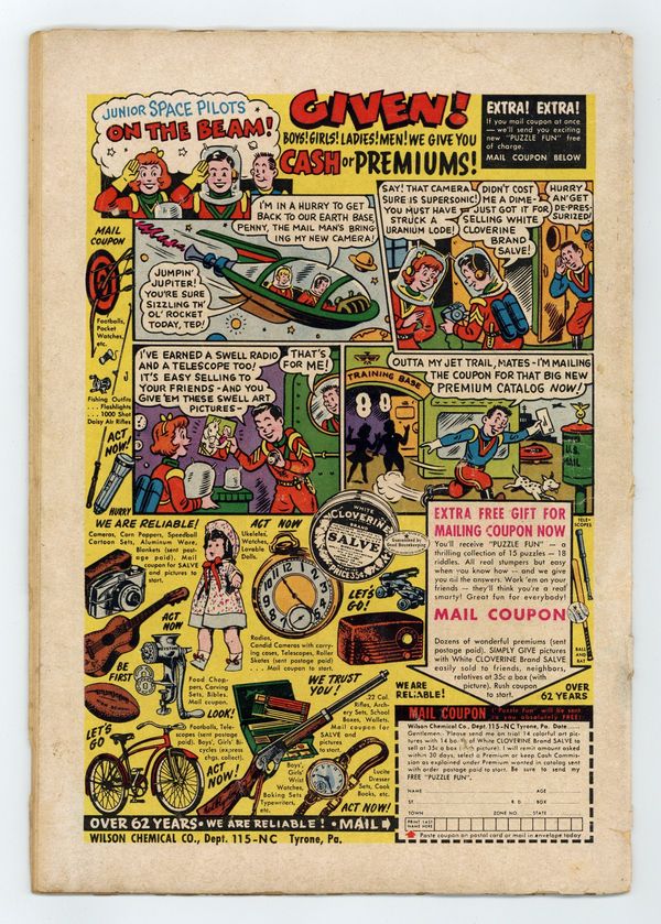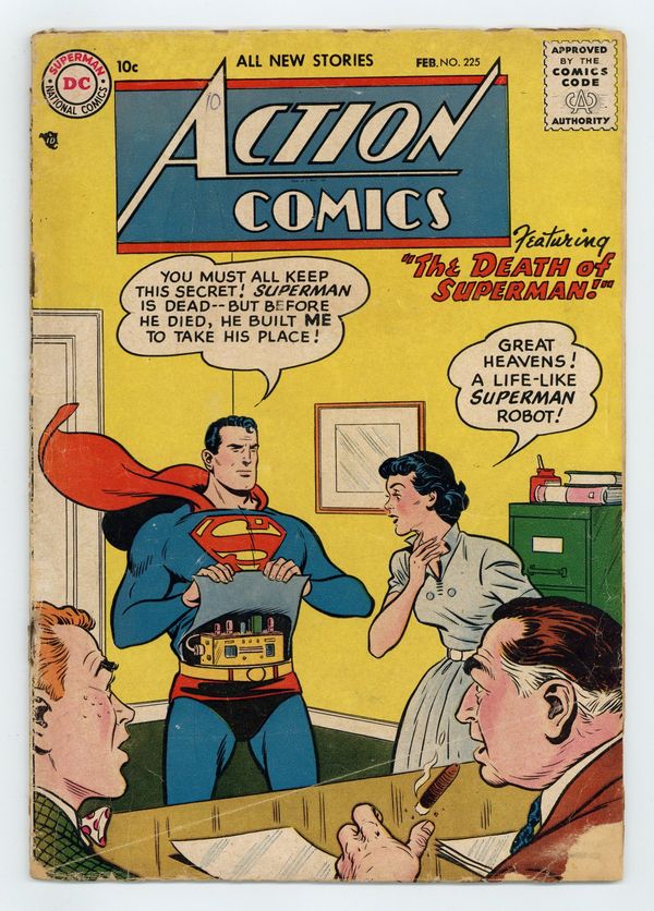 Cover by Al Plastino. "The Death of Superman," pencils by Wayne Boring, inks by Stan Kaye; A Superman robot comes to the Daily Planet and reveals to Perry White, Lois Lane, and Jimmy Olsen that the real Superman is dead. "The Doomed Safaris!" starring Congo Bill, art by Howard Sherman. -page Varsity Vic story by Henry Boltinoff. I Jumped 3 1/2 Miles And Lived article. "The Interplanetary Fort Knox," script by Otto Binder, art by Jim Mooney; Tommy Tomorrow vs. Orion Orton. 36 Pages, Full Color. $.10 Cover price $0.10.
