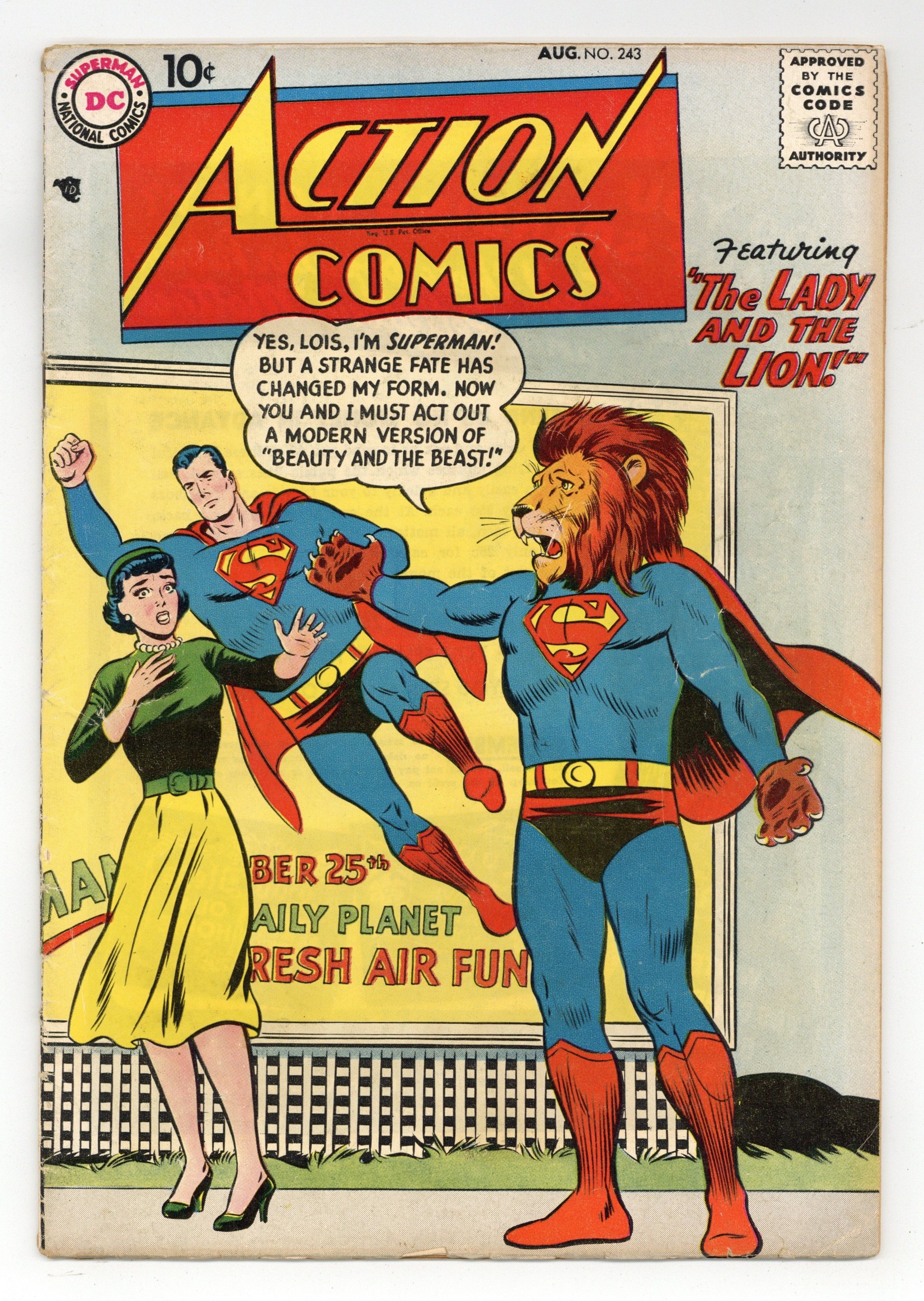 Cover pencils by Curt Swan, inks by Stan Kaye. "The Lady and the Lion," script by Otto Binder, pencils by Wayne Boring, inks by Stan Kaye; Circe gives Superman a potion that causes him to have the head of a lion until he discovers the antidote. 2/3-page Casey the Cop story by Henry Boltinoff. One-page Peg by Henry Boltinoff. "Puzzle of the Perilous Planetoid" starring Tommy Tomorrow, script by Otto Binder, art by Jim Mooney. One-page Varsity Vic story by Henry Boltinoff. "The Five From The Future" starring Congo Bill, art by Howard Sherman. 36 Pages, Full Color. $.10 Cover price $0.10.