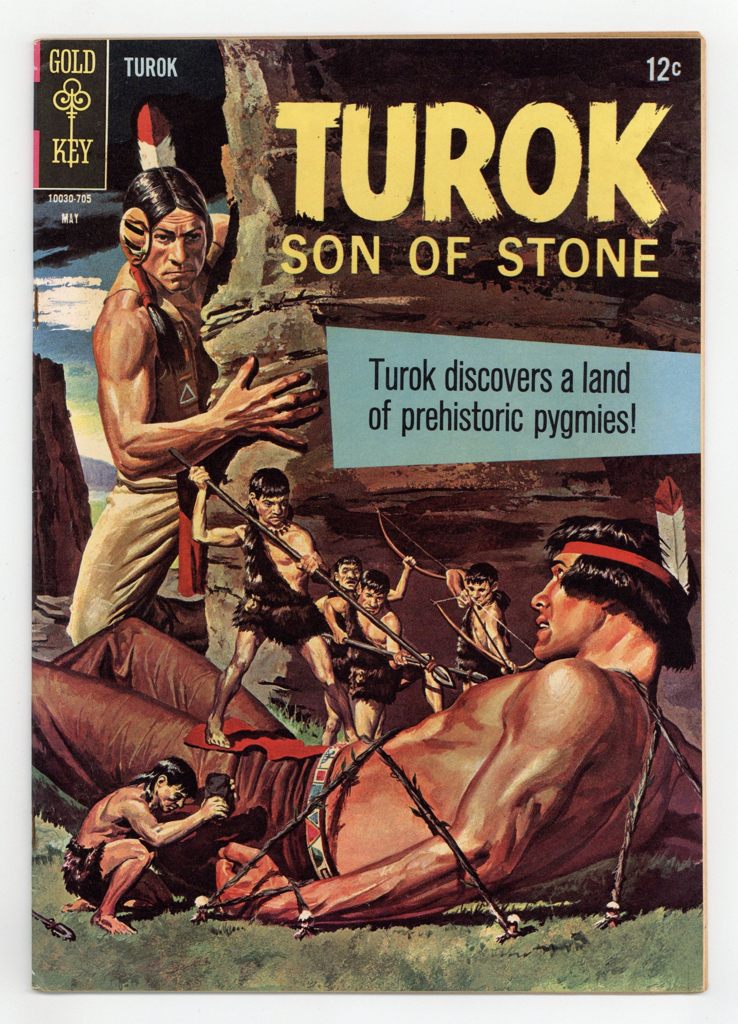 Cover by George Wilson. Written by unknown. Art by Bob Fujitani and unknown. Turok and Andar discover a land of prehistoric pygmies in "The Slave of the Merciless Masters," with art by Bob Fujitani, reprinted from issue #17. Plus: Turok and Andar help a caveman's son return to his home in "The Land of No Return," with art by Fujitani, reprinted in shortened form from issue #17. Also: Young Earth back-up story "The Mysterious Circle of Skulls"; "The Baluchitherium" 1-pager; and 1-page text piece "The Puzzle of the Caves." 36 pages, full color. Cover price $0.12.