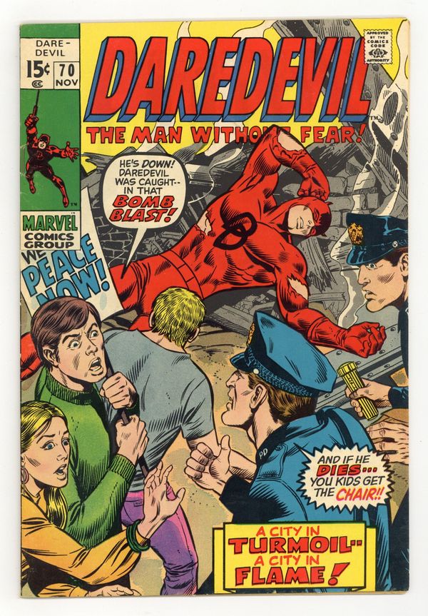 Tags: Marvel Legacy Numbering: Daredevil (part 70), Daredevil$17.50First appearance of the Tribune. Cover pencils by Marie Severin, Herb Trimpe, and the Marvel Bullpen, inks by Joe Sinnott. The Tribune, script by Gary Friedrich, pencils by Gene Colan, inks by Syd Shores; A movie mogul decides that he needs to take an active (and violent) hand in dealing with those he considers un-Americans; Daredevil intervenes; Spiro Agnew and Walter Cronkite cameos. Letters to the editor from comics writers Mike Barr and Martin Pasko. 36 pgs. Cover price $0.15. Cover price $0.15.