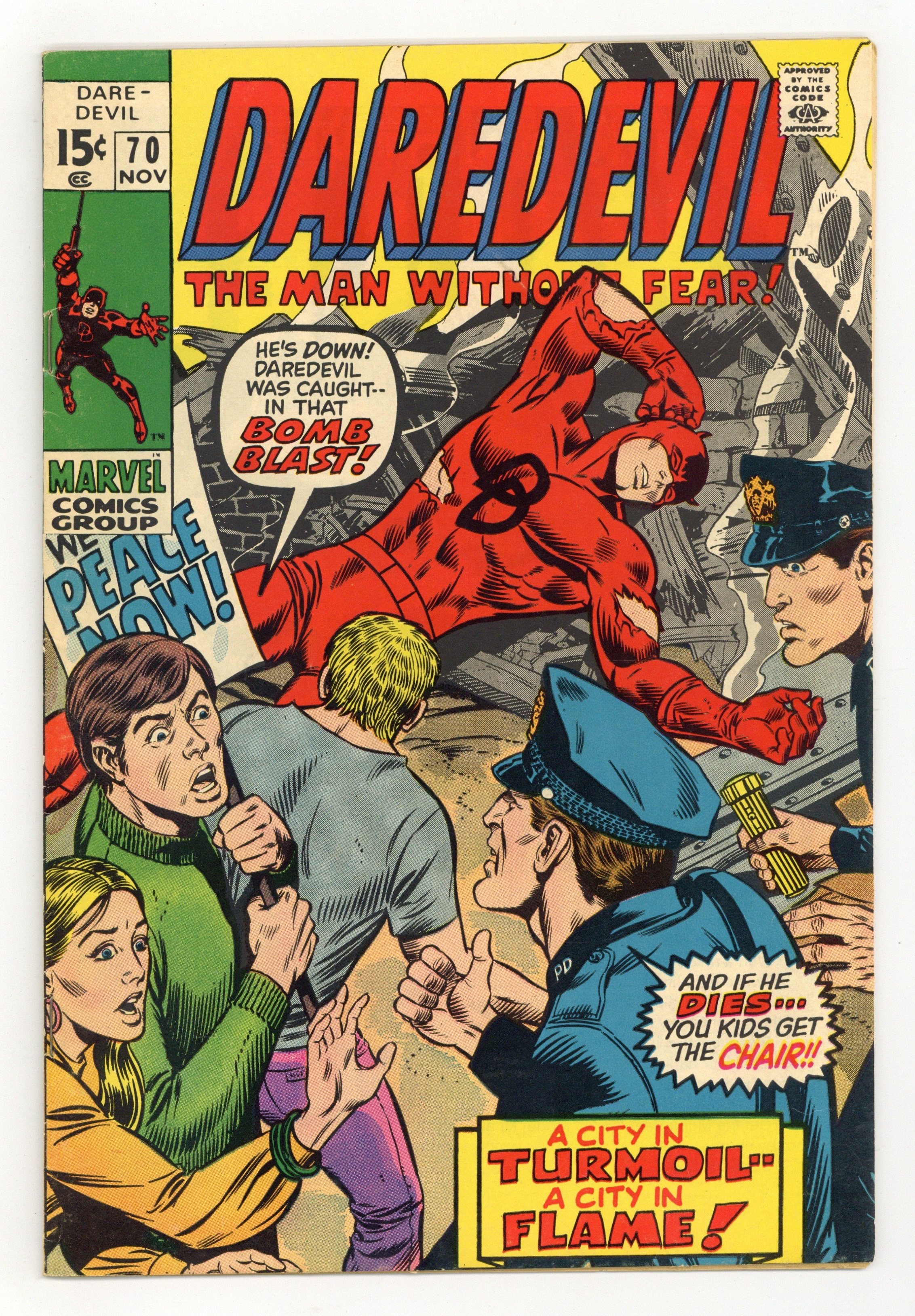 First appearance of the Tribune. Cover pencils by Marie Severin, Herb Trimpe, and the Marvel Bullpen, inks by Joe Sinnott. The Tribune, script by Gary Friedrich, pencils by Gene Colan, inks by Syd Shores; A movie mogul decides that he needs to take an active (and violent) hand in dealing with those he considers un-Americans; Daredevil intervenes; Spiro Agnew and Walter Cronkite cameos. Letters to the editor from comics writers Mike Barr and Martin Pasko. 36 pgs. Cover price $0.15. Cover price $0.15.