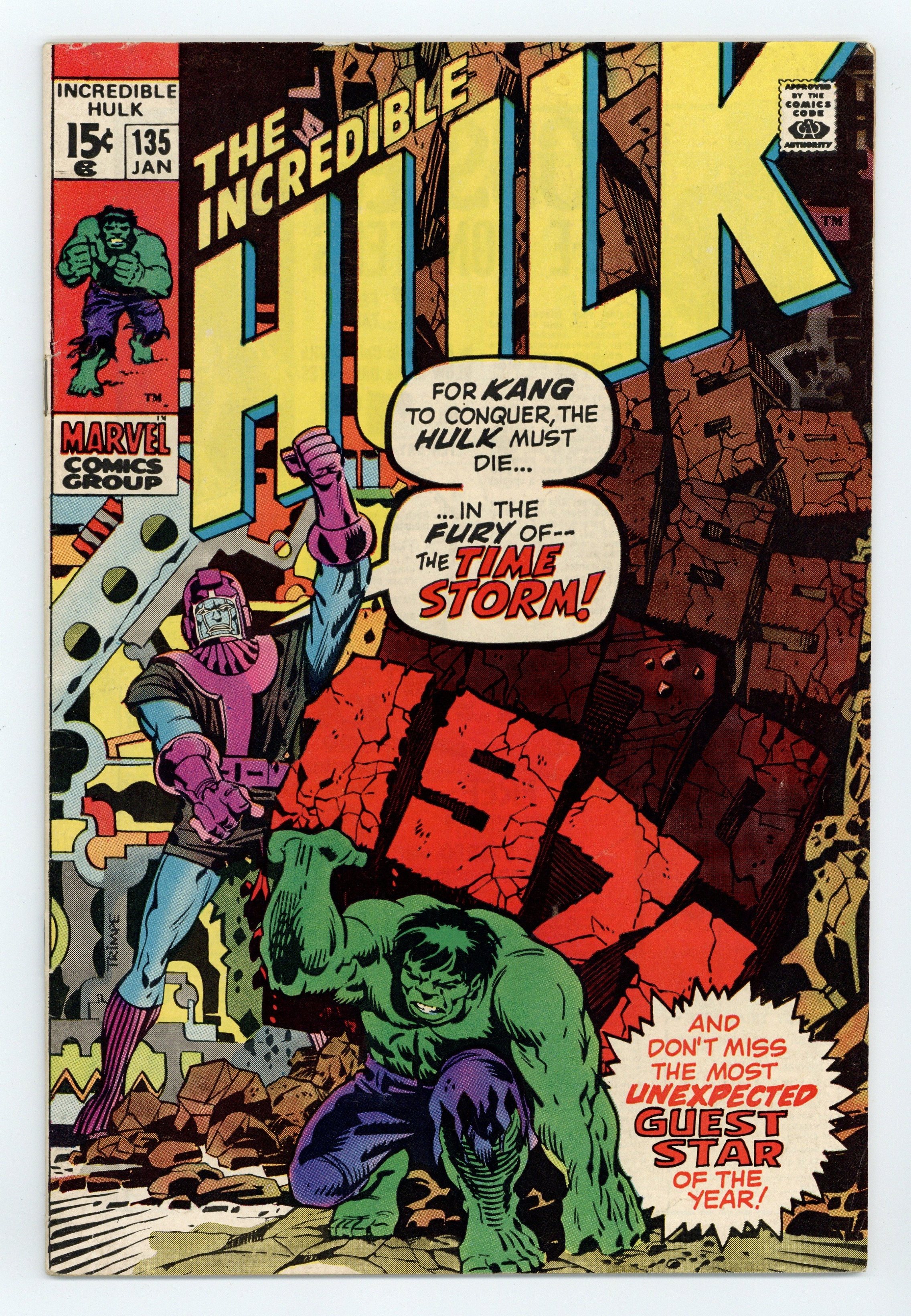 Tags: Marvel Legacy Numbering: Hulk (part 135), Hulk$25.99Cover art by Herb Trimpe. Descent Into the Time-Stream, script by Roy Thomas, pencils by Herb Trimpe, inks by Sal Buscema; Kang plucks Hulk from the present and whisks him back to World War I to stop the Phantom Eagle from accomplishing a mission which will prevent the Avengers and the Hulk himself from ever existing; When the Hulk returns to the present with Kang's plans foiled, he finally reverts back to Bruce Banner. 36 pgs. $0.15. Cover price $0.15.