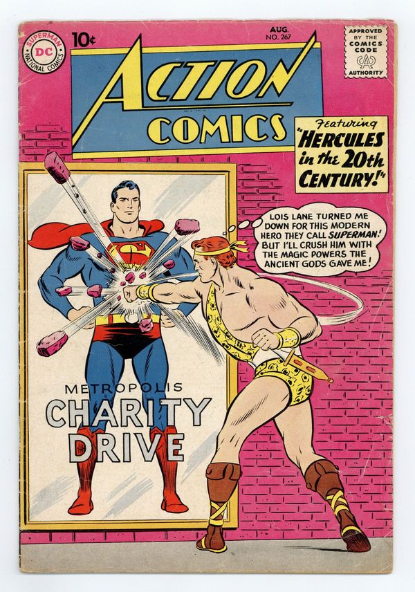 Cover pencils by Curt Swan, inks by Stan Kaye. "Hercules in the 20th Century!", script by Otto Binder, pencils by Wayne Boring, inks by Stan Kaye; Lex Luthor builds a time-machine to bring Hercules to the present to use him to stop Superman; Hercules gets wise to Luthor's plan and helps Superman stop Luthor and then decides to stay in the present and falls in love with Lois Lane. 3rd appearance of Legion of Super-Heroes, 1st appearance of Chameleon Boy, Colossal Boy, and Invisible Kid in the Supergirl story "The Three Super-Heroes!", script by Jerry Siegel, art by Jim Mooney; The Legion comes to the 20th century to meet Supergirl and invites her to come to the 30th Century to apply to join the Legion. One-page Ollie story by Henry Boltinoff. 36 Pages, Full Color. $.10 Cover price $0.10.