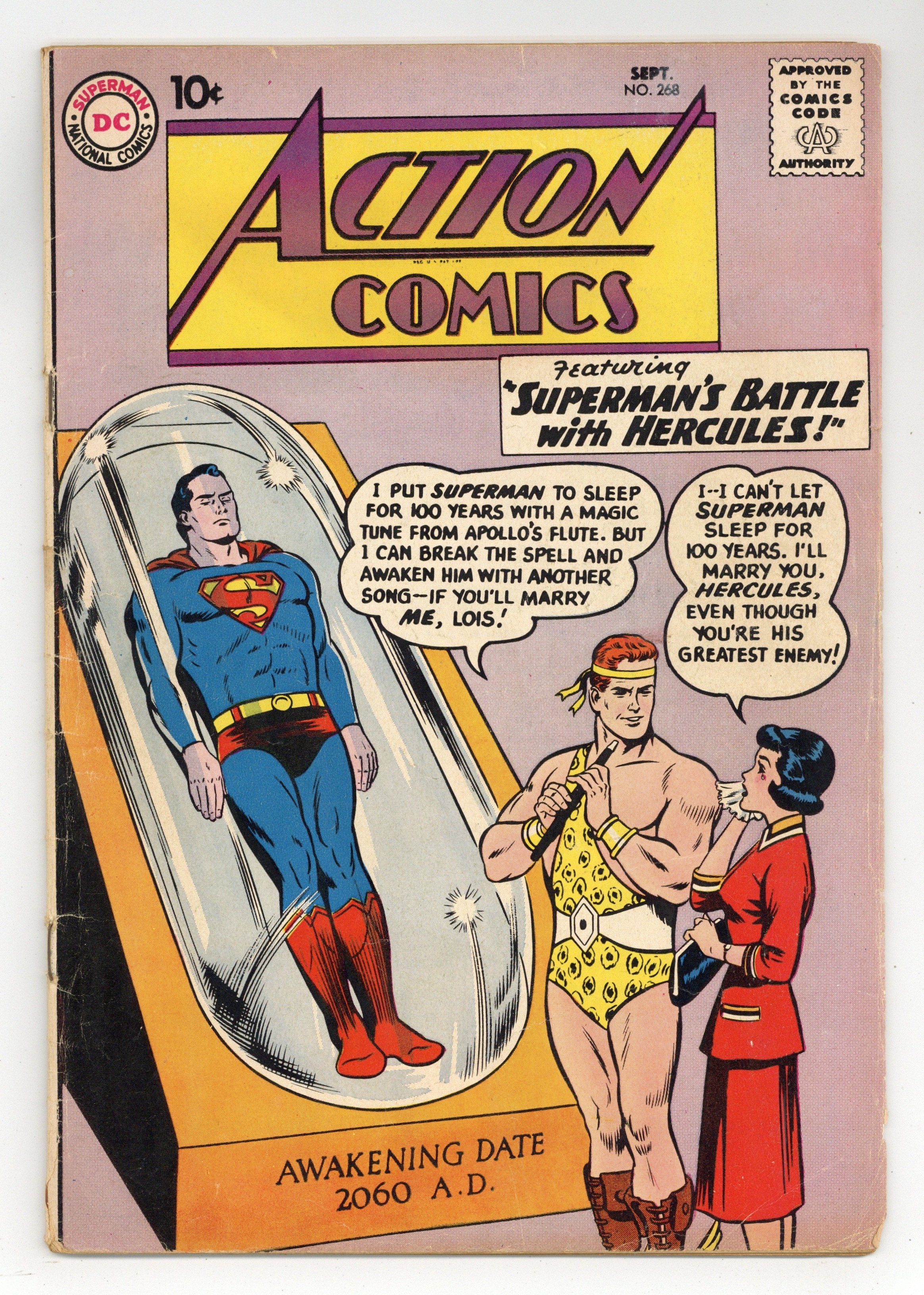 Cover pencils by Curt Swan, inks by Stan Kaye. "Superman's Battle With Hercules!", script by Otto Binder, pencils by Wayne Boring, inks by Stan Kaye; Hercules wants to marry Lois, but Lois won't marry him while Superman is around, so Hercules tries to get rid of Superman. "The Mystery Supergirl!", script by Otto Binder and Jerry Siegel, art by Jim Mooney; While working an internship at the Daily Planet, Linda Lee discovers that someone is impersonating her as Supergirl around the world. 36 Pages, Full Color. $.10 Cover price $0.10.