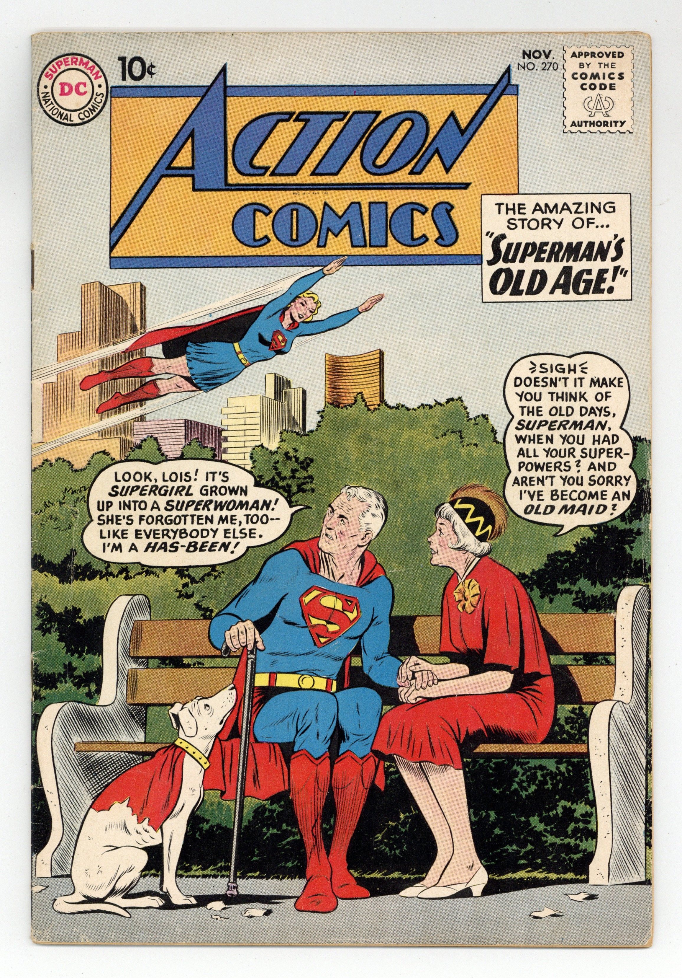 Cover pencils by Curt Swan, inks by Stan Kaye. "The Old Man of Metropolis!", script by Otto Binder, pencils by Curt Swan, inks by John Forte; Superman inadvertently smashes through the time barrier into the future - but emerges as an old man with no super powers. "Supergirl's Busiest Day!", script by Jerry Siegel, art by Jim Mooney; With Superman on a space mission, Supergirl has a day full of emergencies to deal with. One-page Shorty story by Henry Boltinoff. Supermen of America ad. Justice League of America ad. 36 Pages, Full Color. $.10 Cover price $0.10.